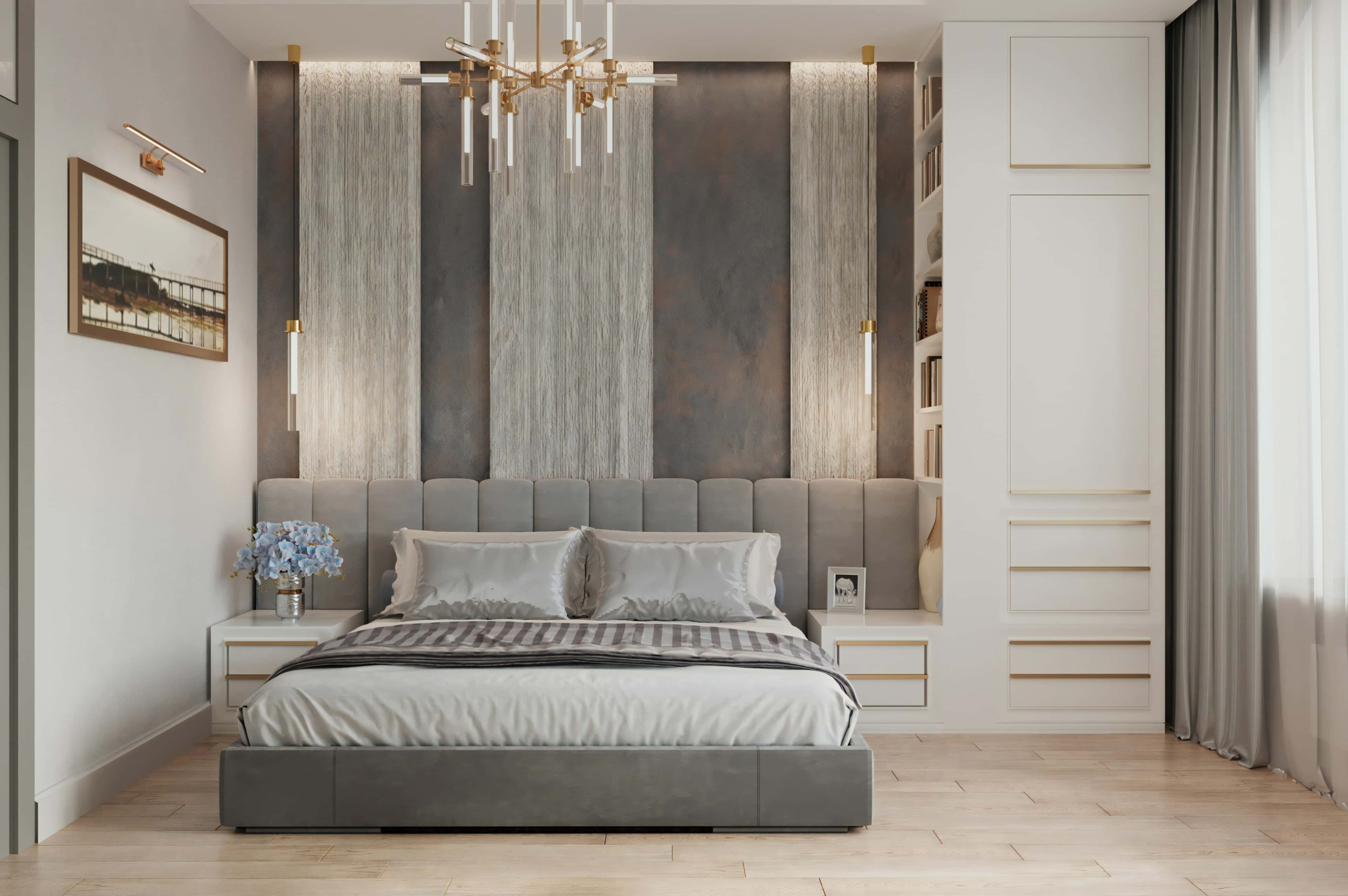 Сочетание декоративной штукатурки, реечных панелей и черного мрамора в отделке помещений усложняет интерьер. Металлические элементы и фурнитура в оттенке состаренной латуни дают приятную винтажную нотку. А скругленные углы и предметы обтекаемой формы добавляют в проект модного футуризма.