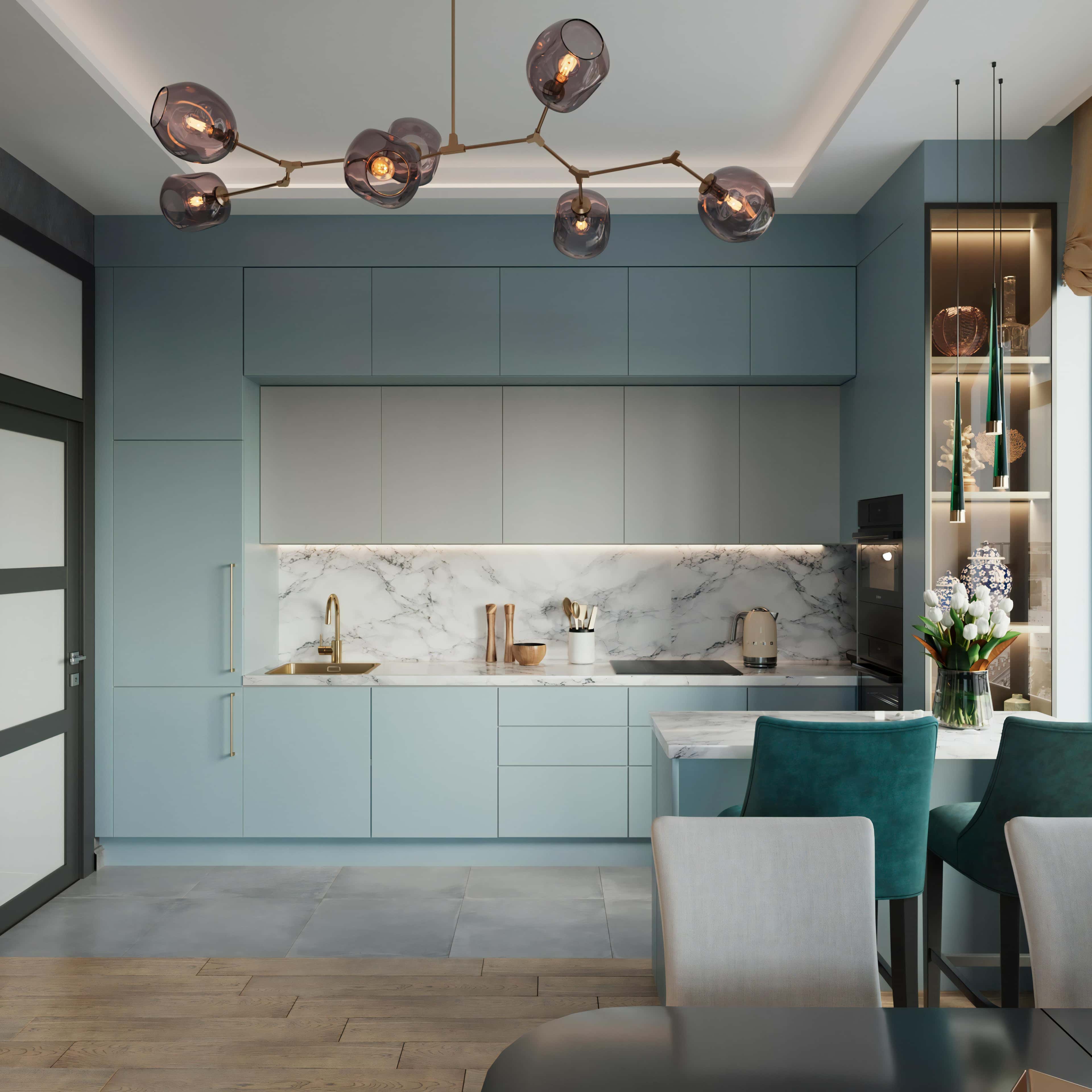 Интерьер четырехкомнатной квартиры 146 м² в ЖК «Резиденция Архитекторов», оформлен нашими дизайнерами в стиле арт-деко с белой основой (мрамор) и сочными акцентами, геометрическими деталями, зеркалами, хрусталем и золотистыми элементами (светильники, аксессуары). Все это дает отсылку к эпохе «Великого Гэтсби», добавляет обстановке изысканности и сдержанной роскоши.