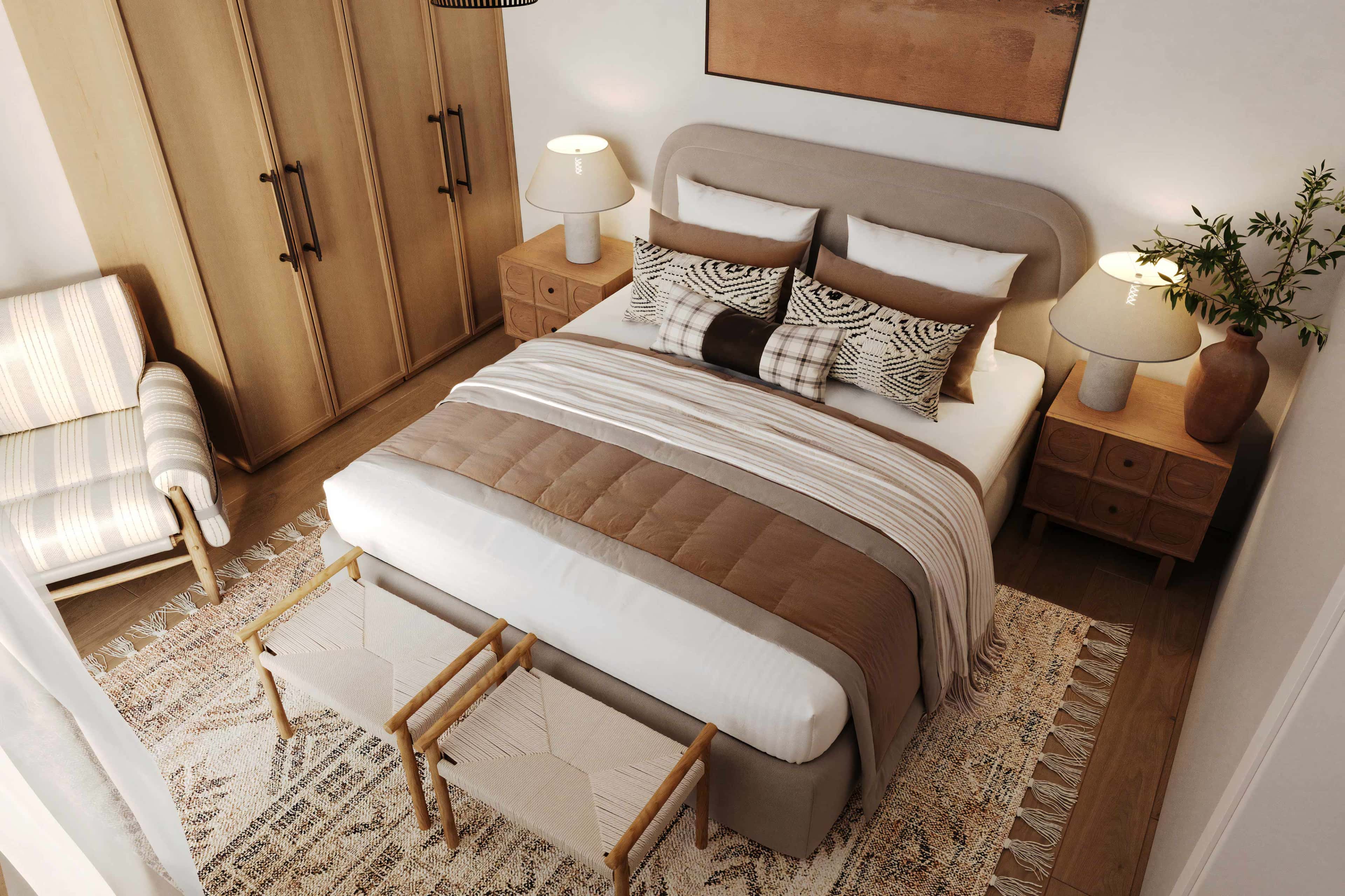 Мебель с тканевой обивкой, мягкие стеновые панели, шторы, декоративные подушки, ковер, пледы — для создания уюта и отпускного настроения подойдет любой домашний текстиль. А чтобы обстановка выглядела интересней, лучше подобрать изделия с разной фактурой: рогожка, букле, велюр, имитация ручной вязки, мех.