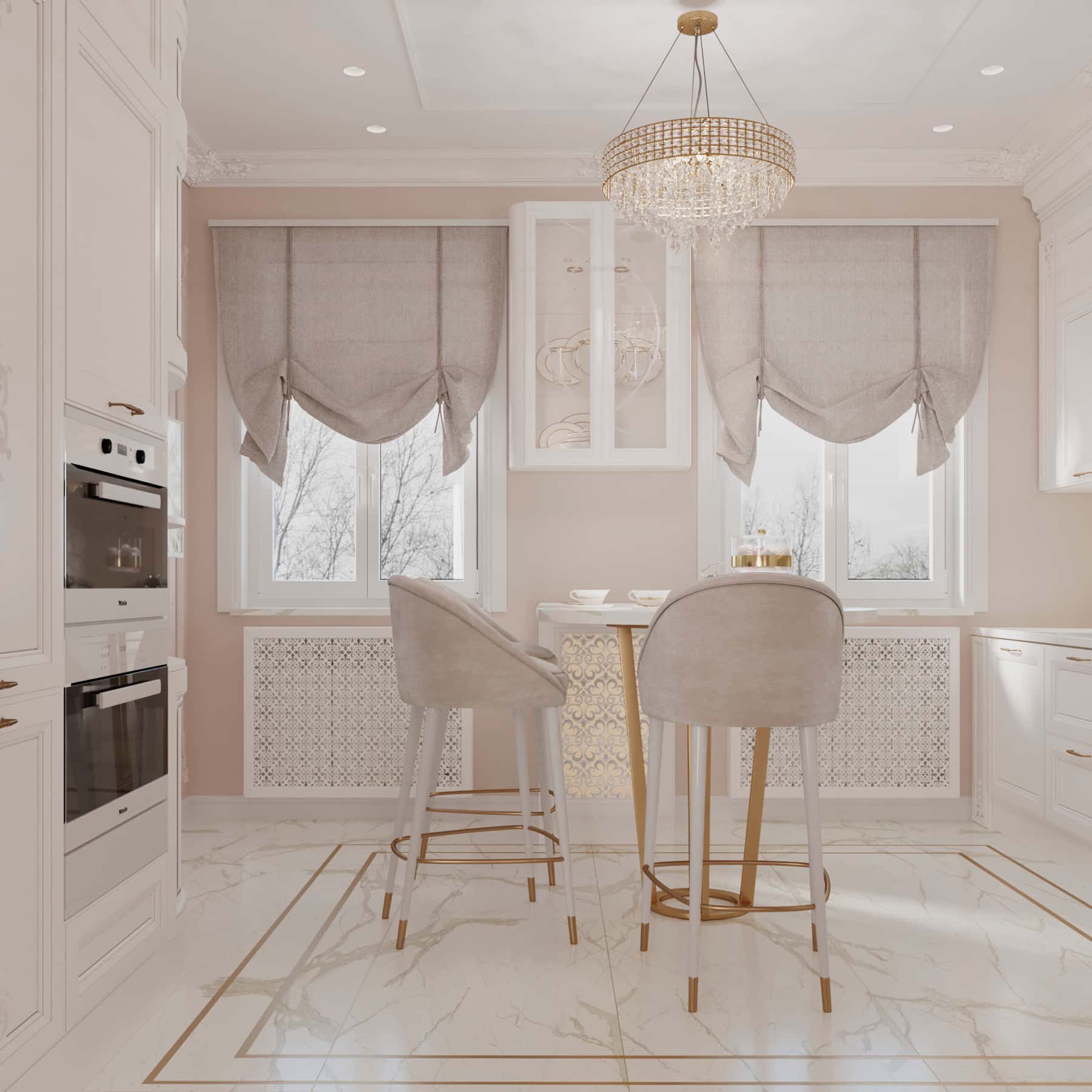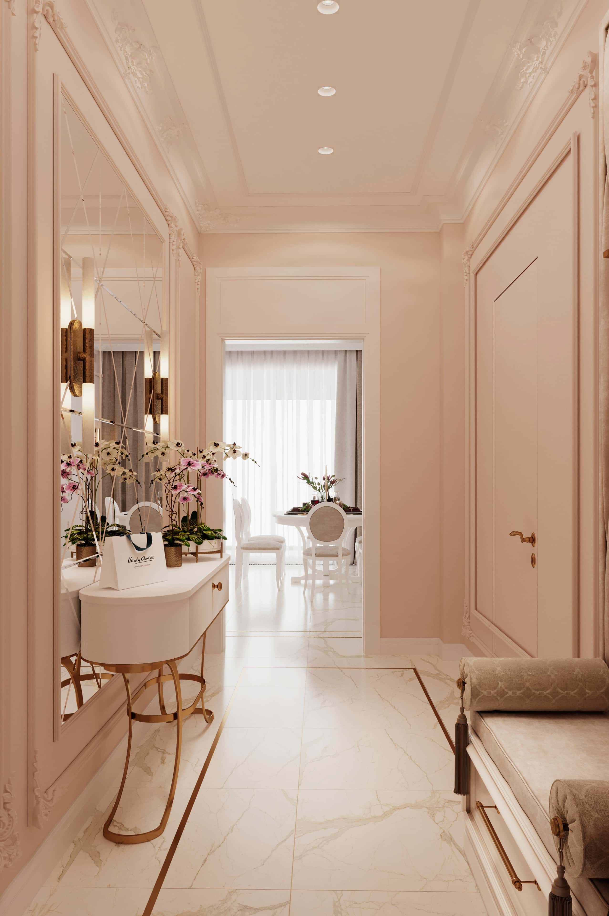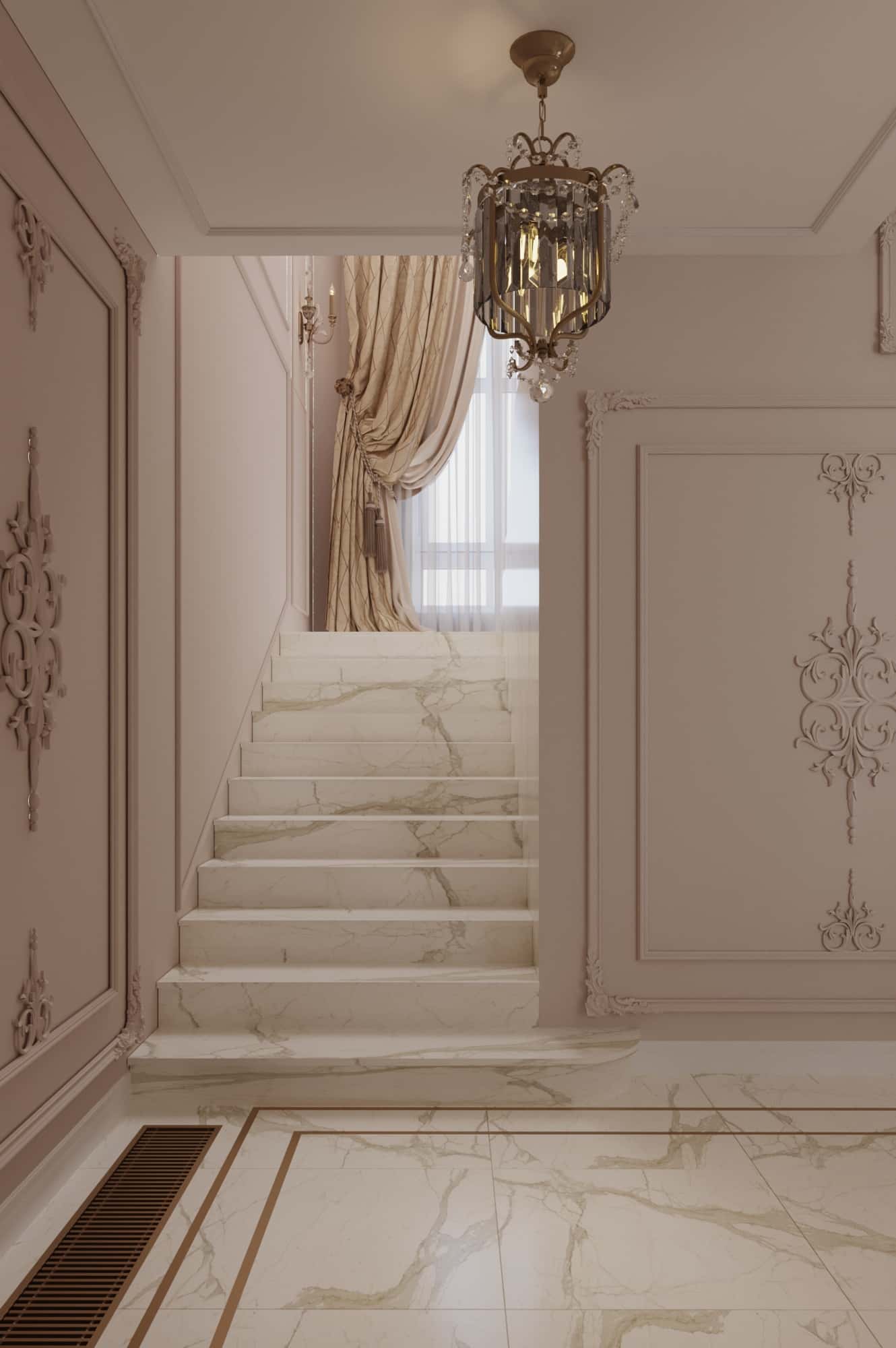Для реализации проекта в стиле современная классика для молодой семьи дизайнеры предложили изысканную цветовую гамму, включающую бежевые и пудровые тона. В итоге получился модный и изысканный интерьер с дворцовым колоритом.