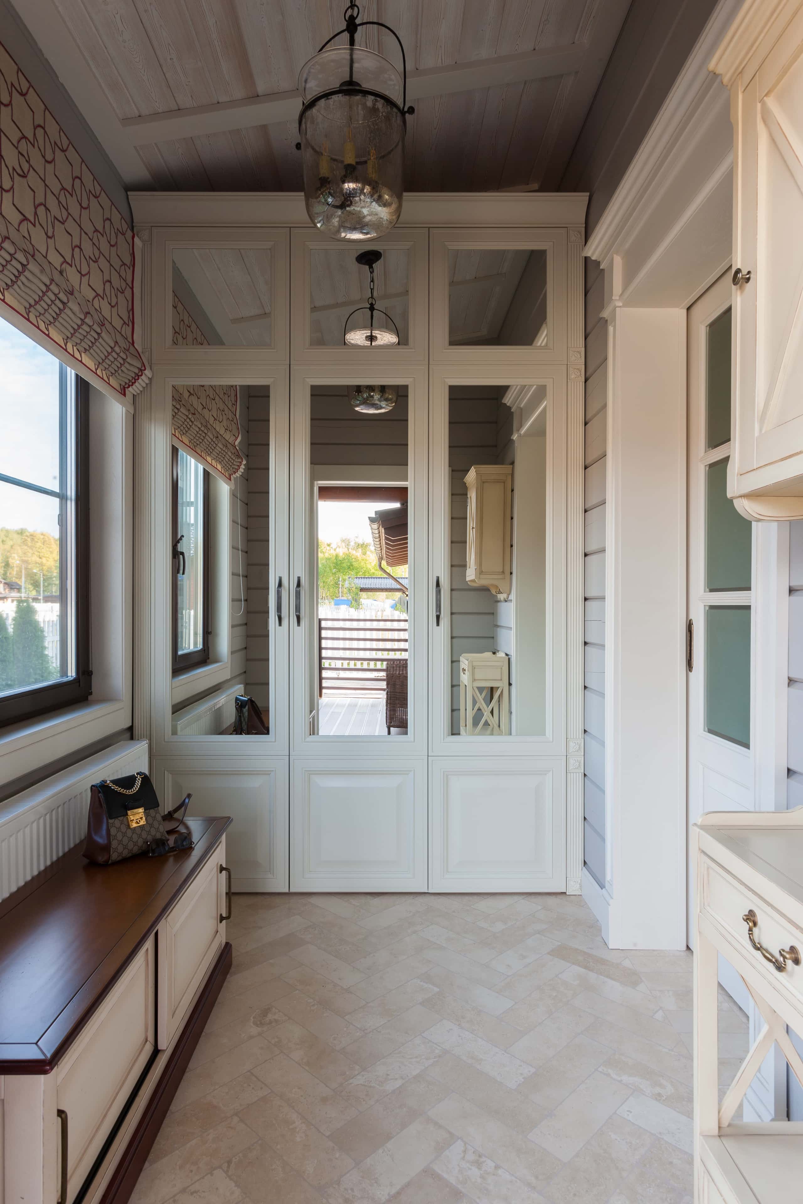 Большая отдельная гардеробная в загородном доме позволит грамотно организовать хранение вещей и избавить комнаты от громоздких шкафов. А если площадь позволяет, гардеробную можно оборудовать при каждой спальне.