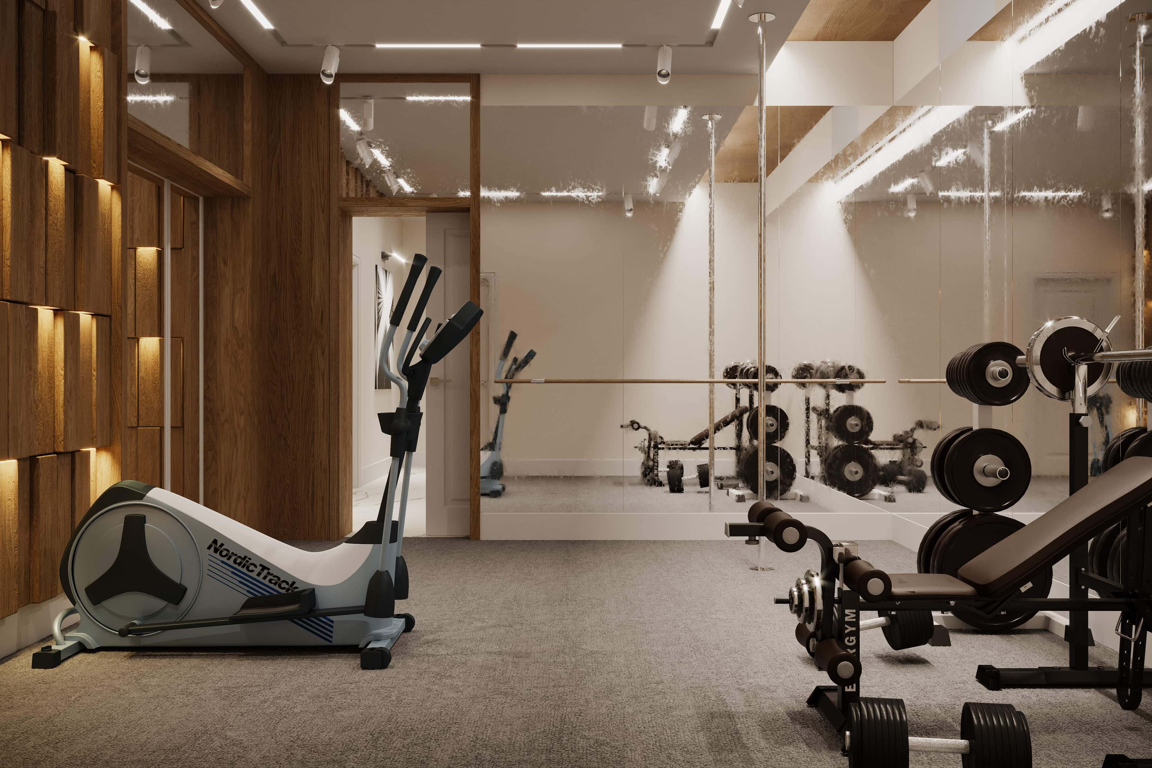 Тренажерный зал в частном доме может быть любой площади, главное, чтобы в нем поместились все нужные хозяевам спортивные снаряды. А визуально расширить помещение поможет зеркальная стена, комбинированная отделка и правильный свет.