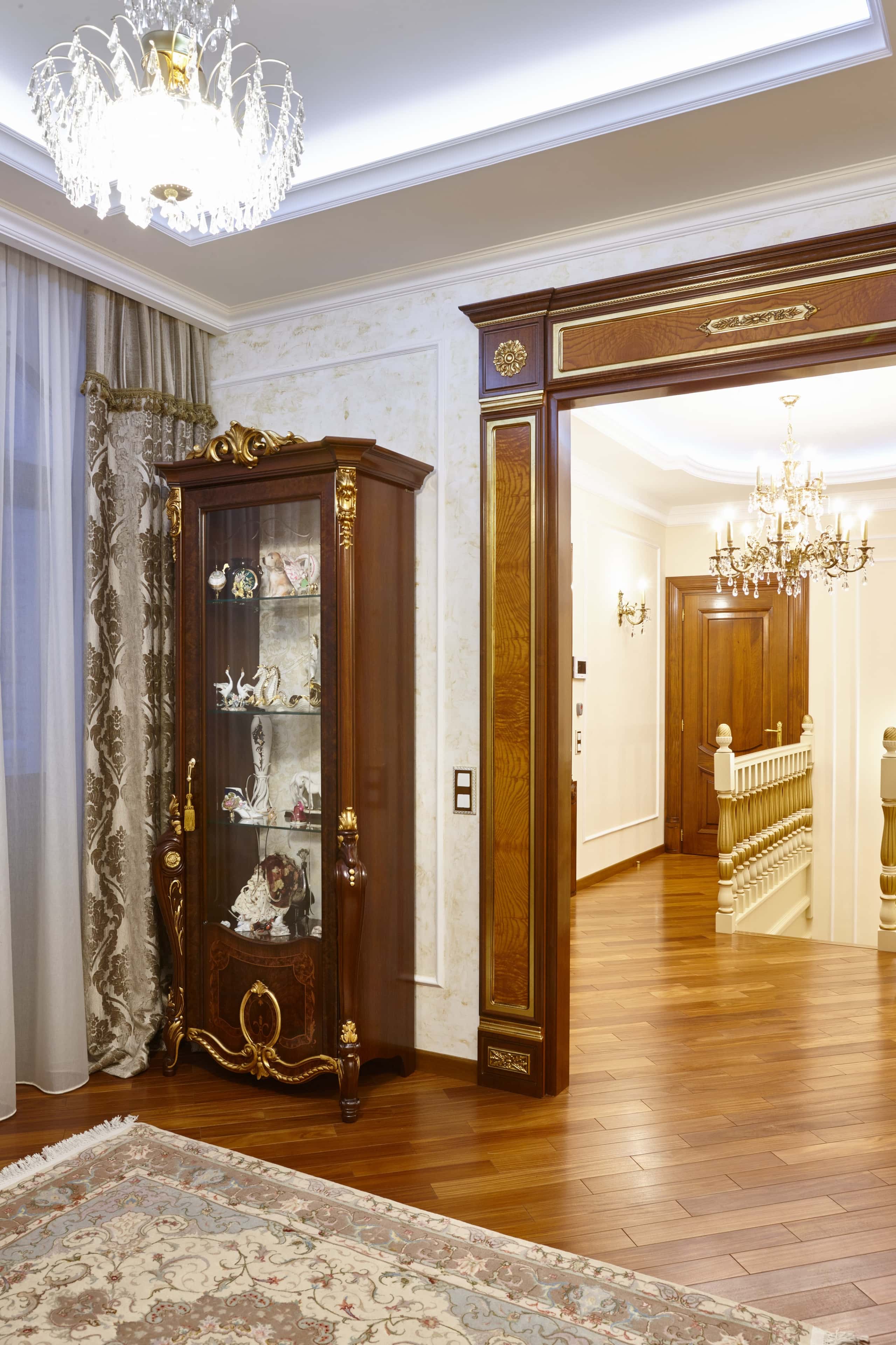 Лестница с эффектными деревянными балясинами, арочные проемы, коринфские колонны, дворцовые хрустальные люстры — дизайн этого роскошного двухэтажного дома реализован в лучших традициях классического стиля. Хозяйка особняка — уважаемая дама в возрасте, которая ценит истинную красоту и предпочитает респектабельный интерьер с античными деталями и антикварной мебелью.