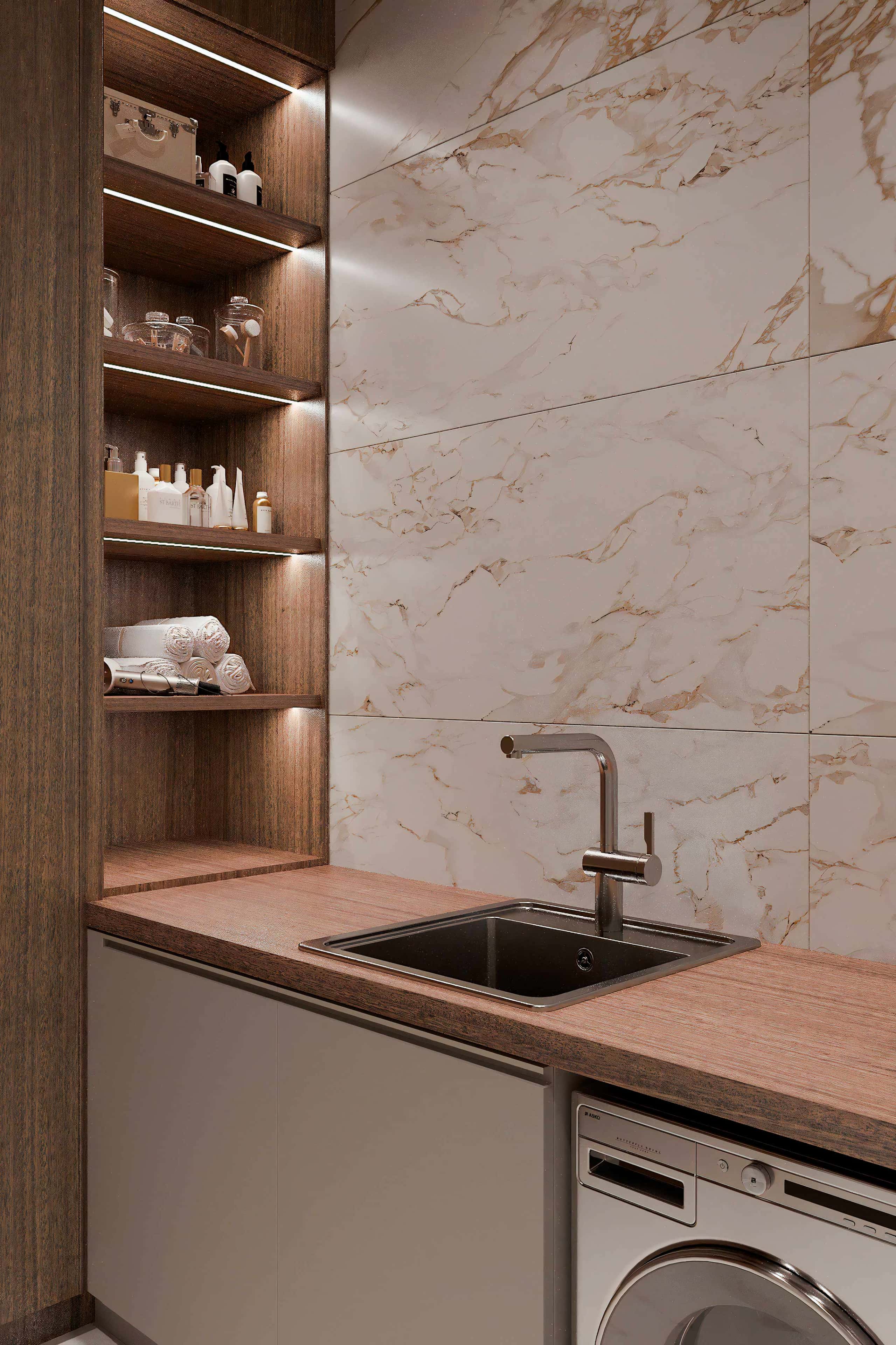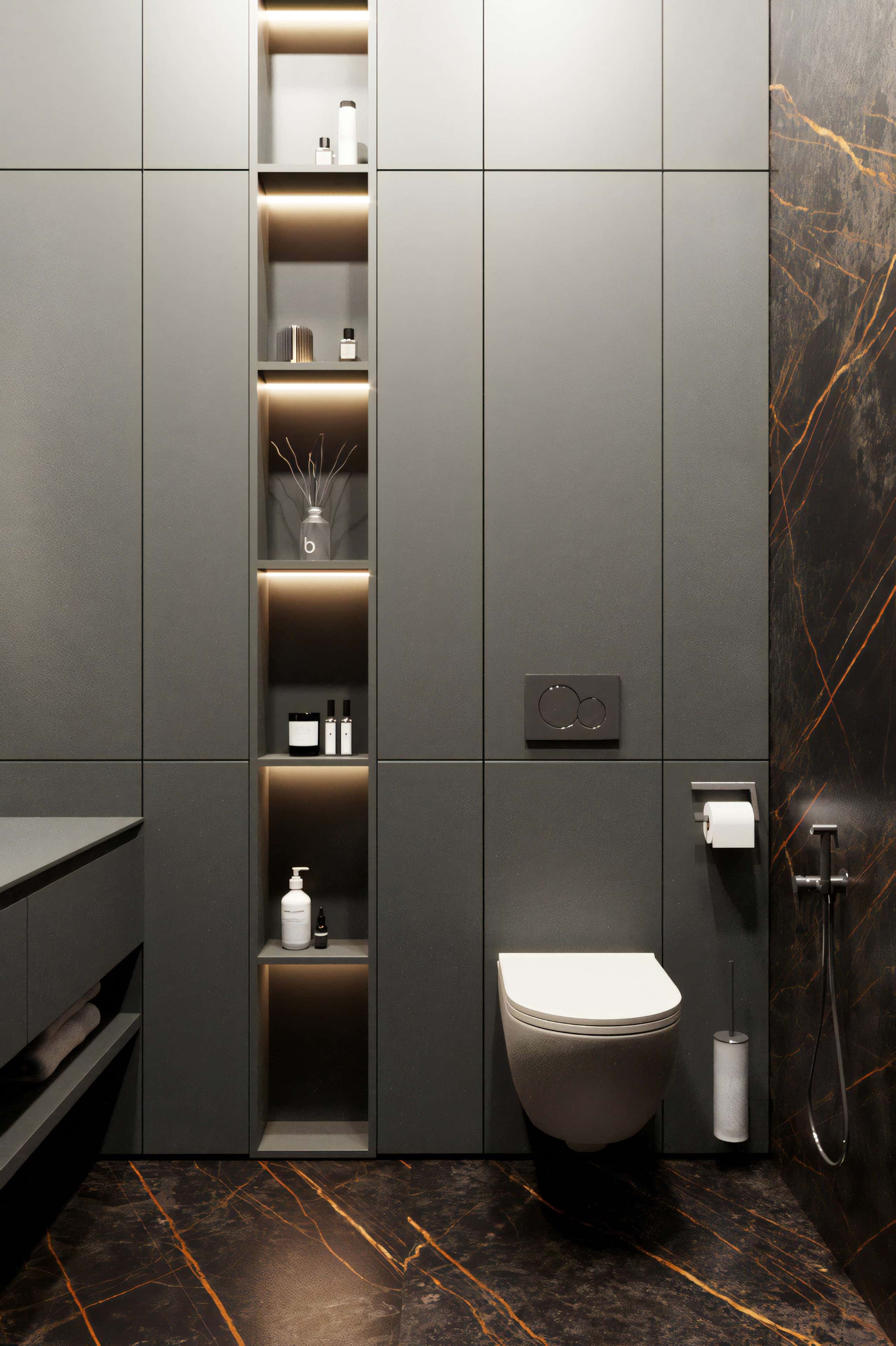 Мрамор с выразительным рисунком, дизайнерская сантехника и ванна-купель у панорамного окна с видом на лес — именно так выглядит стильная мастер-ванная на втором этаже современного загородного дома. Тут нет ничего лишнего, а в качестве столика для необходимых аксессуаров используется деревянный табурет в азиатском стиле.