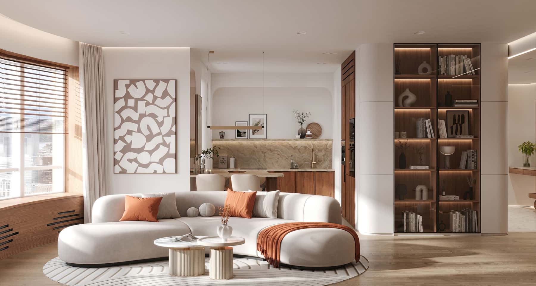 Оттенки сливочного крема, топленого молока и карамели — еще одна востребованная цветовая схема для современной гостиной с разнофактурными поверхностями. В таком пространстве прекрасно смотрятся терракотовые акценты и светлое дерево, а глубины обстановке добавляет грамотно спроектированная декоративная подсветка.