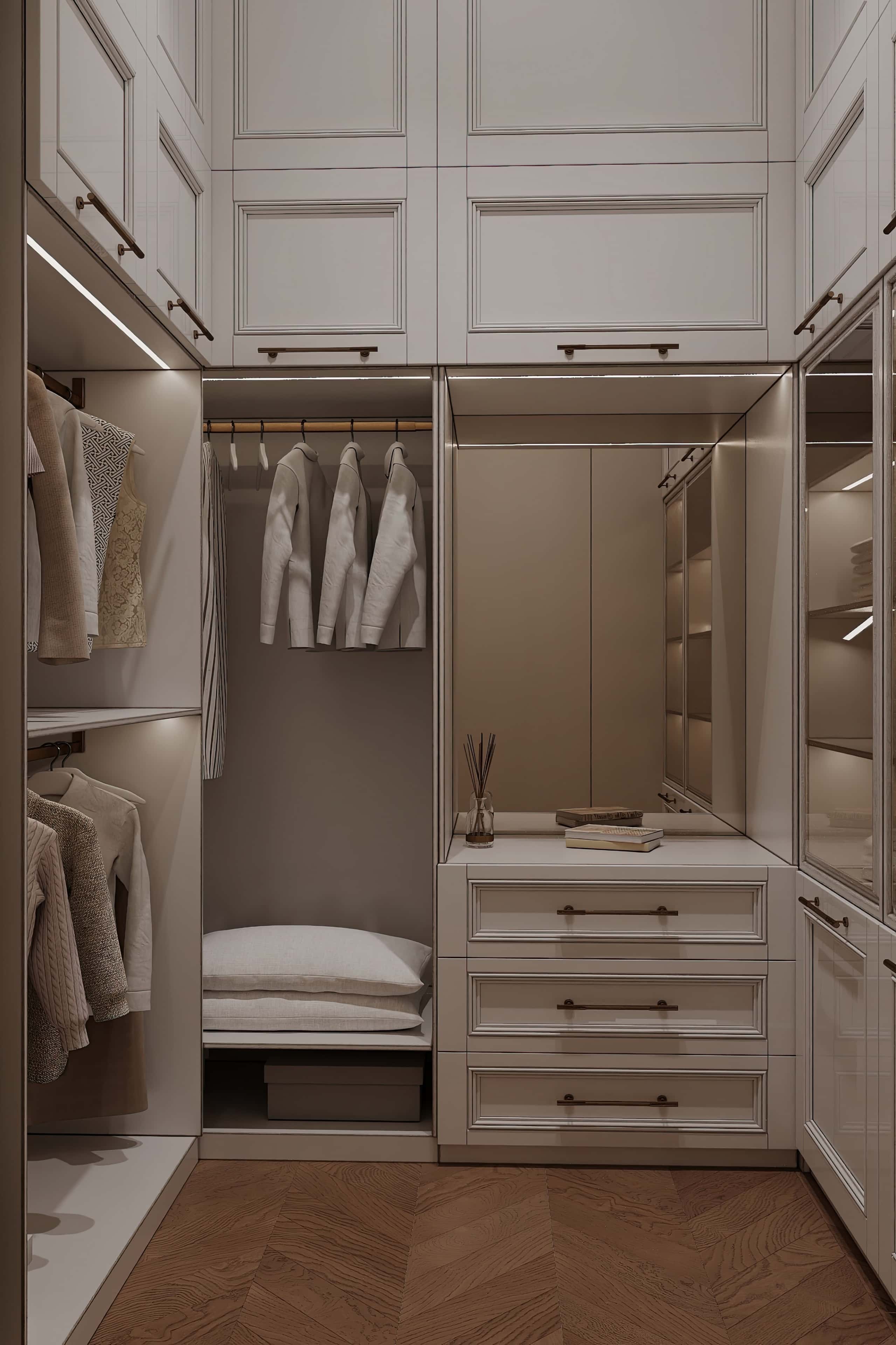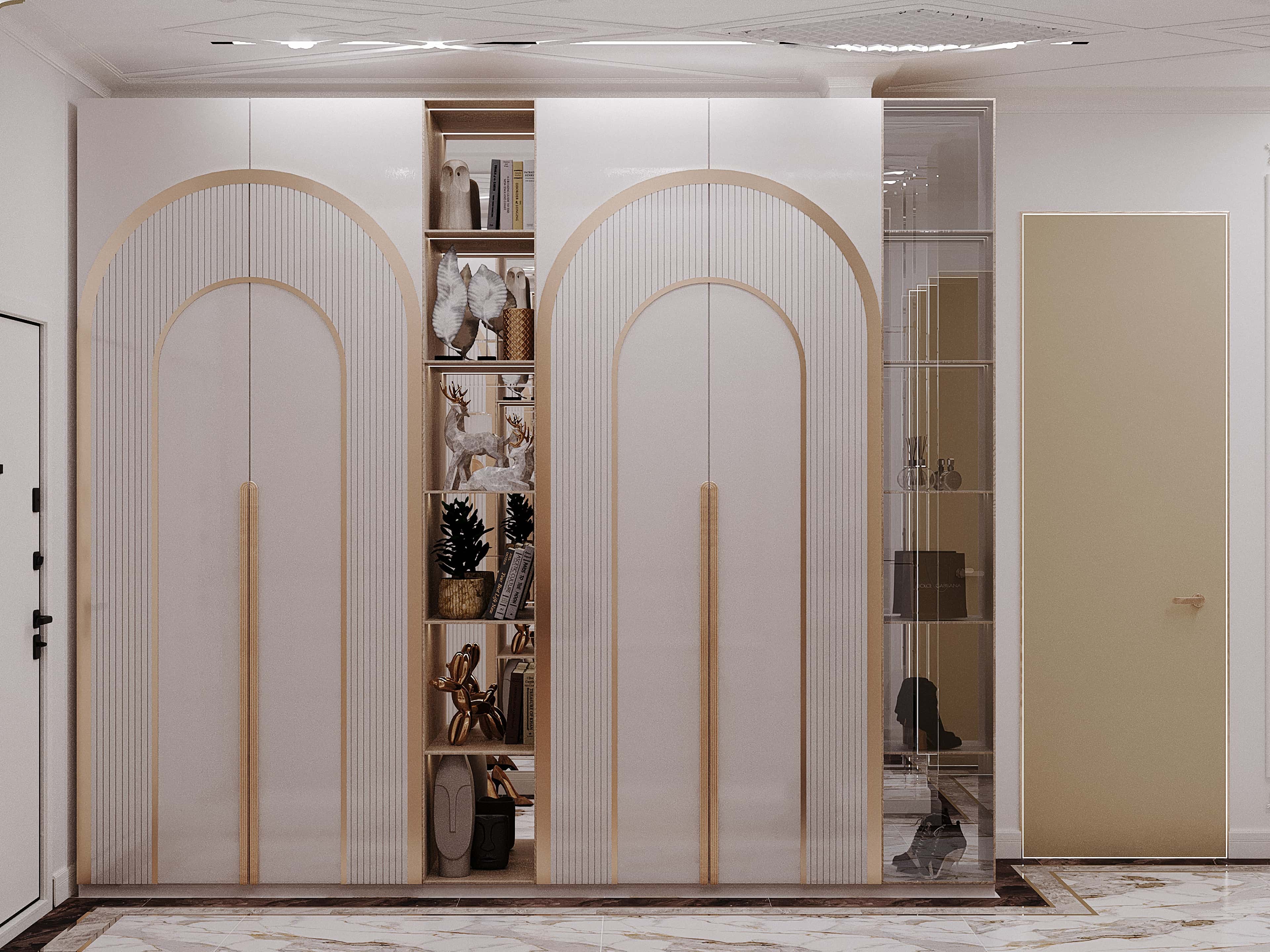 Интерьер оформили в аристократичном неоклассическом стиле, выбрав элегантную цветовую палитру с включением бежевых, молочных, охристых и пудровых тонов. В качестве напольных покрытий использовали инженерную доску и керамогранит. В дизайн стен и потолка добавили лепнину. А нотки роскоши в обстановку добавили с помощь золотистого декора.