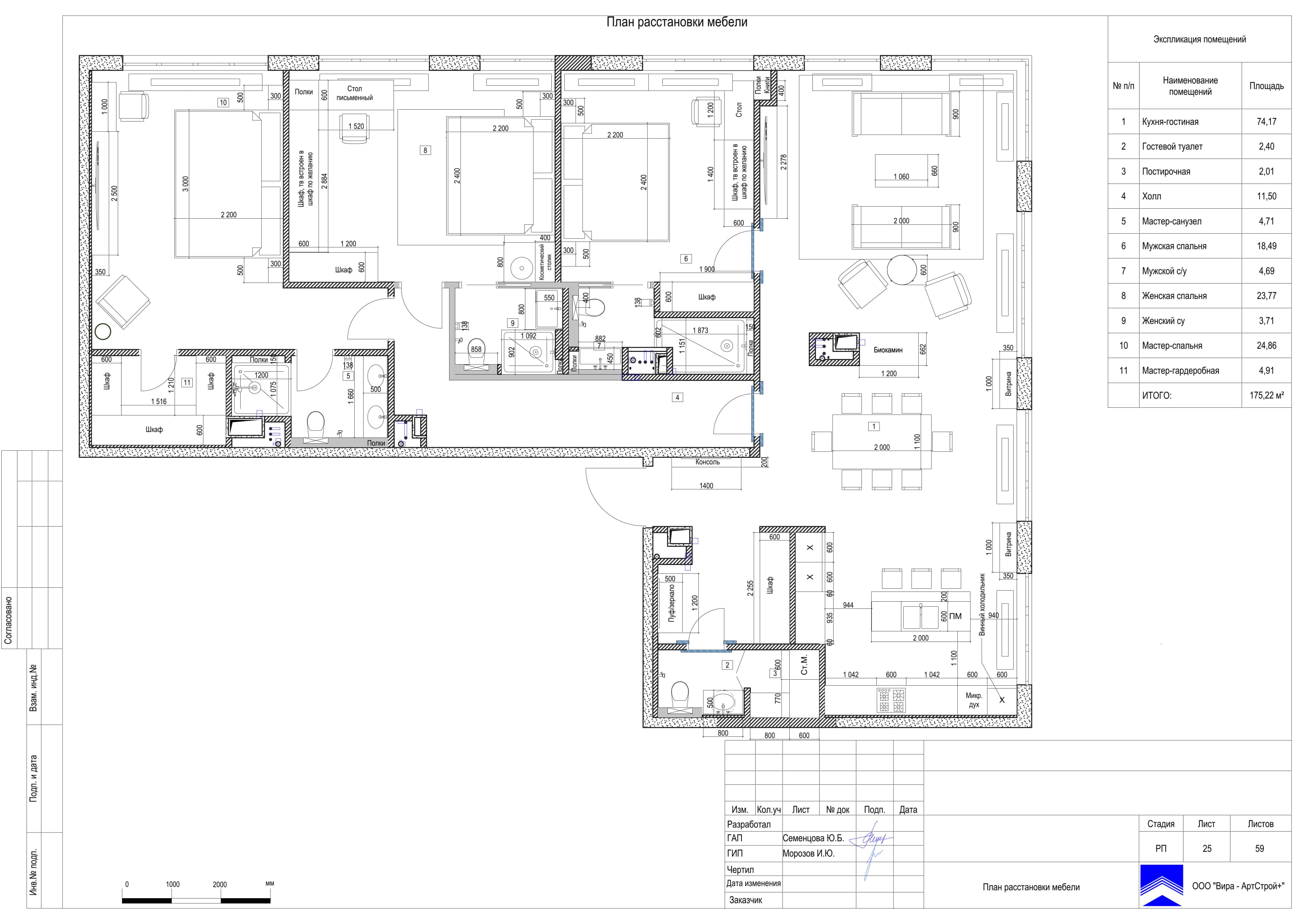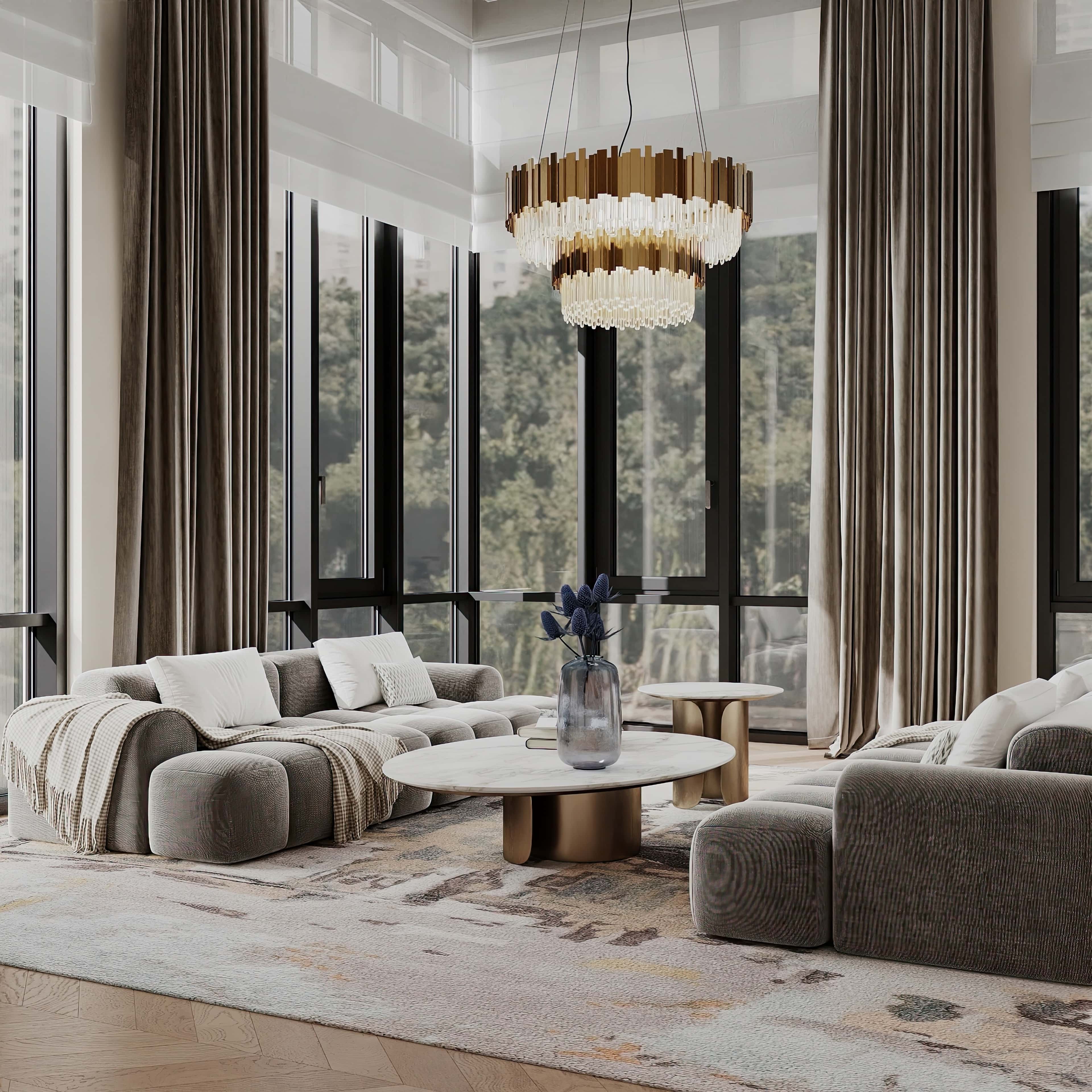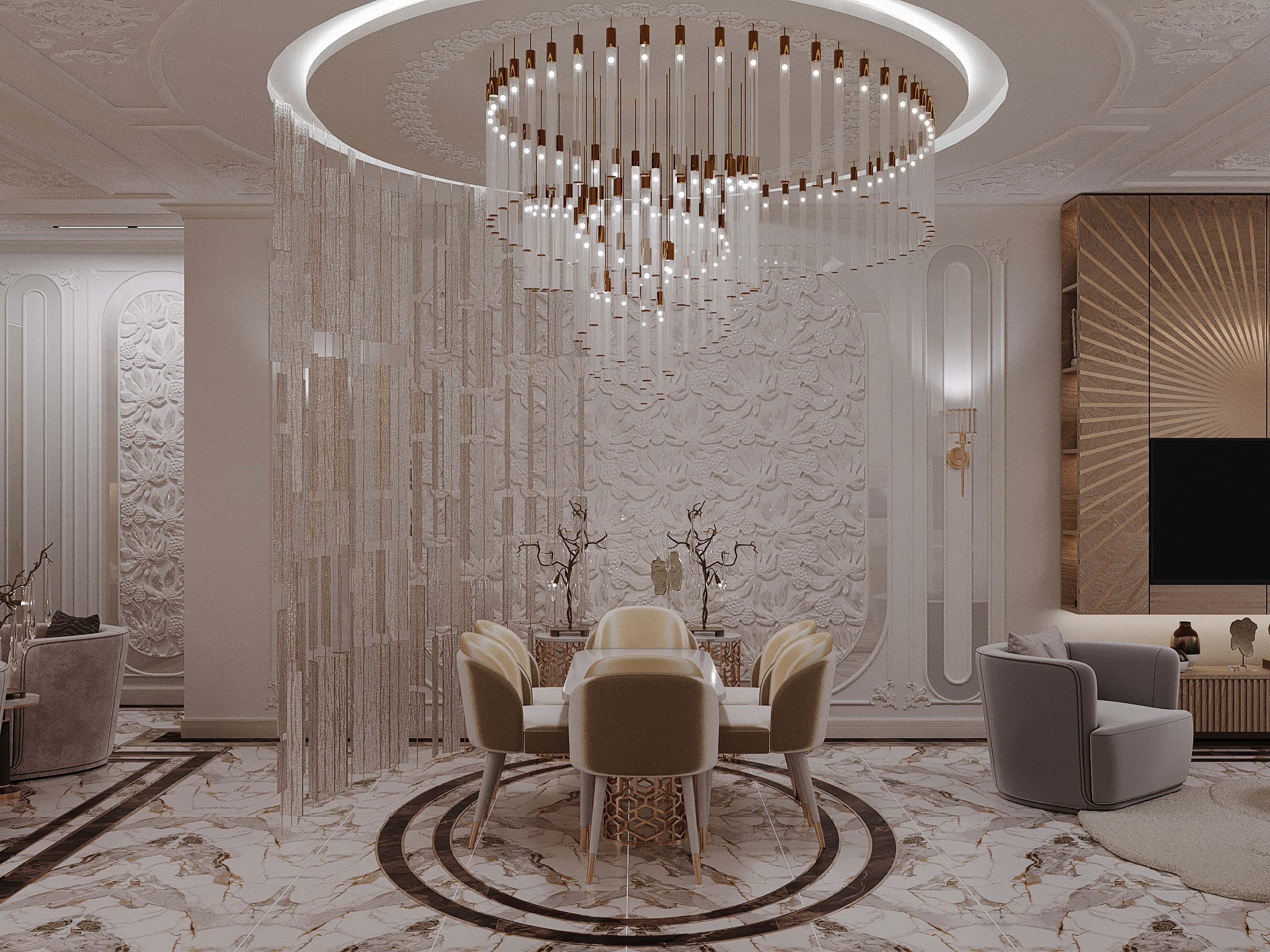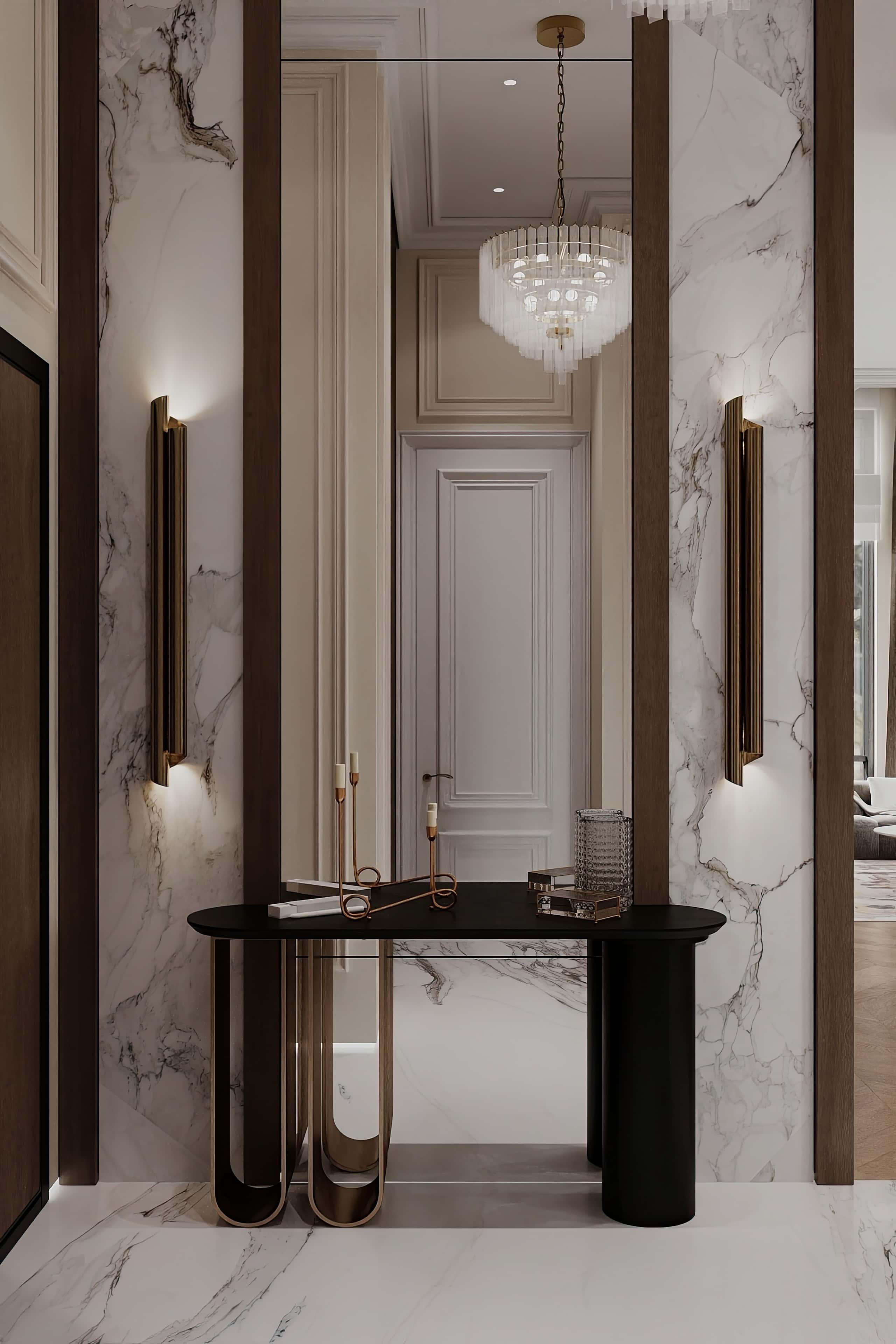 Чтобы подчеркнуть статус владельцев и их высокое положение в обществе, интерьер решили оформить в эффектном стиле современное арт-деко с натуральным мрамором, латунью и зеркалами. При этом было разработано 8 вариантов планировочного решения проекта, из которых заказчики выбрали наиболее подходящий.