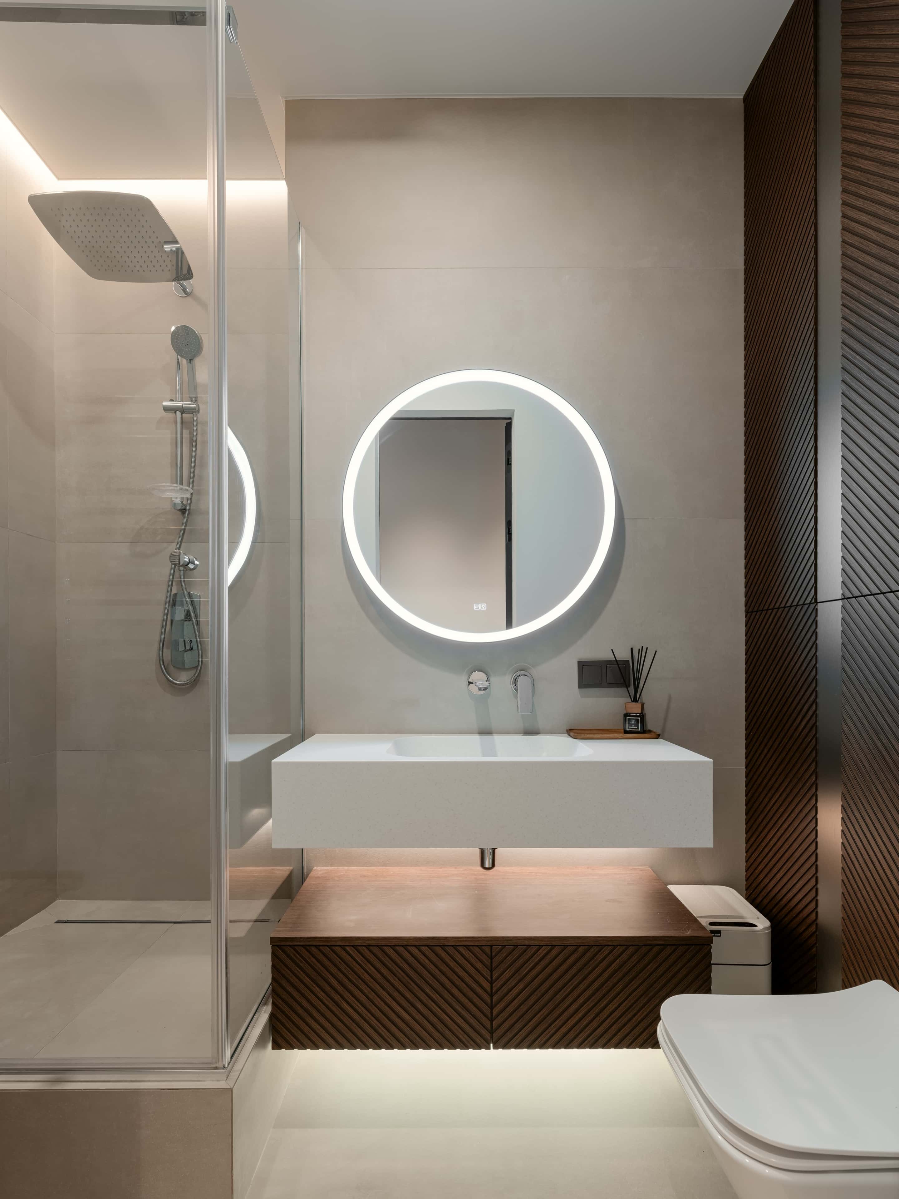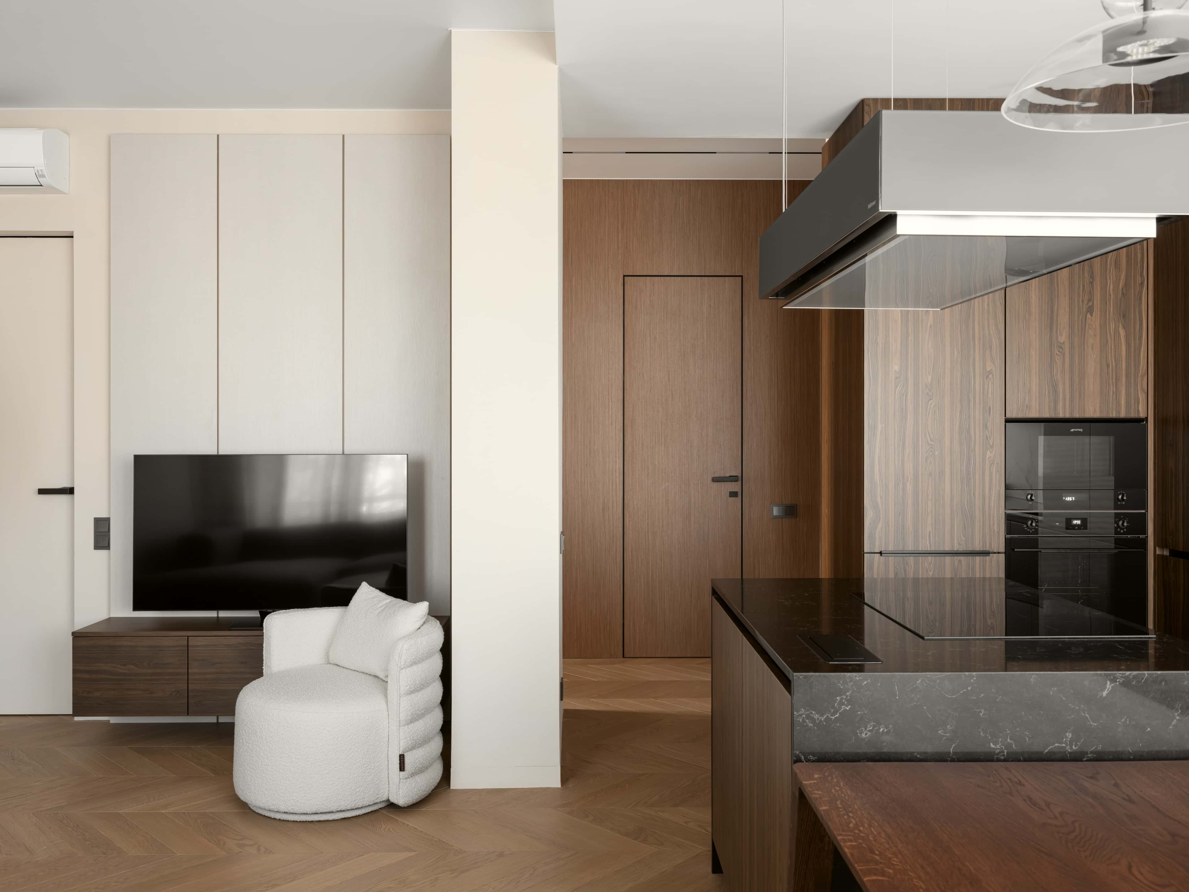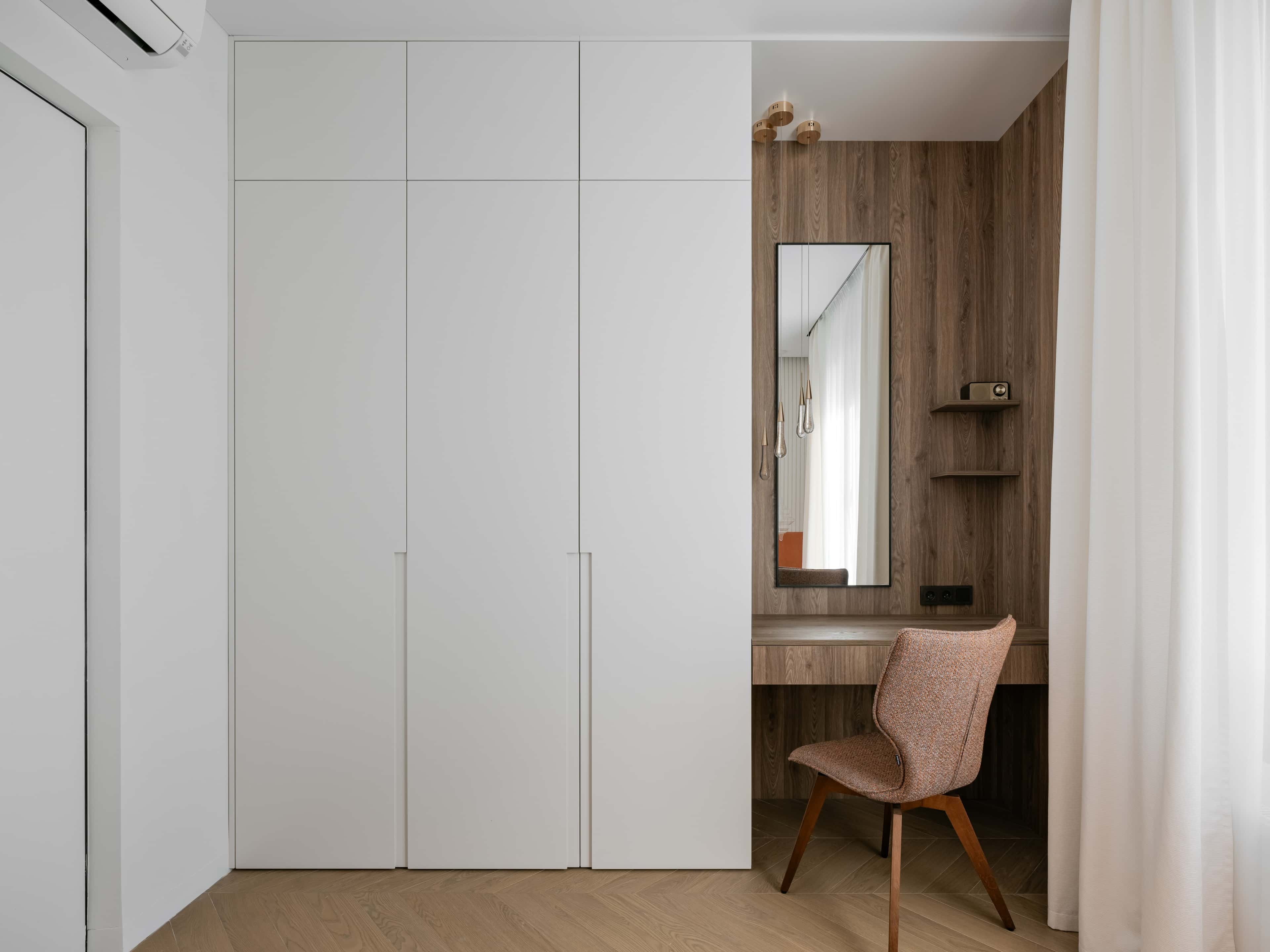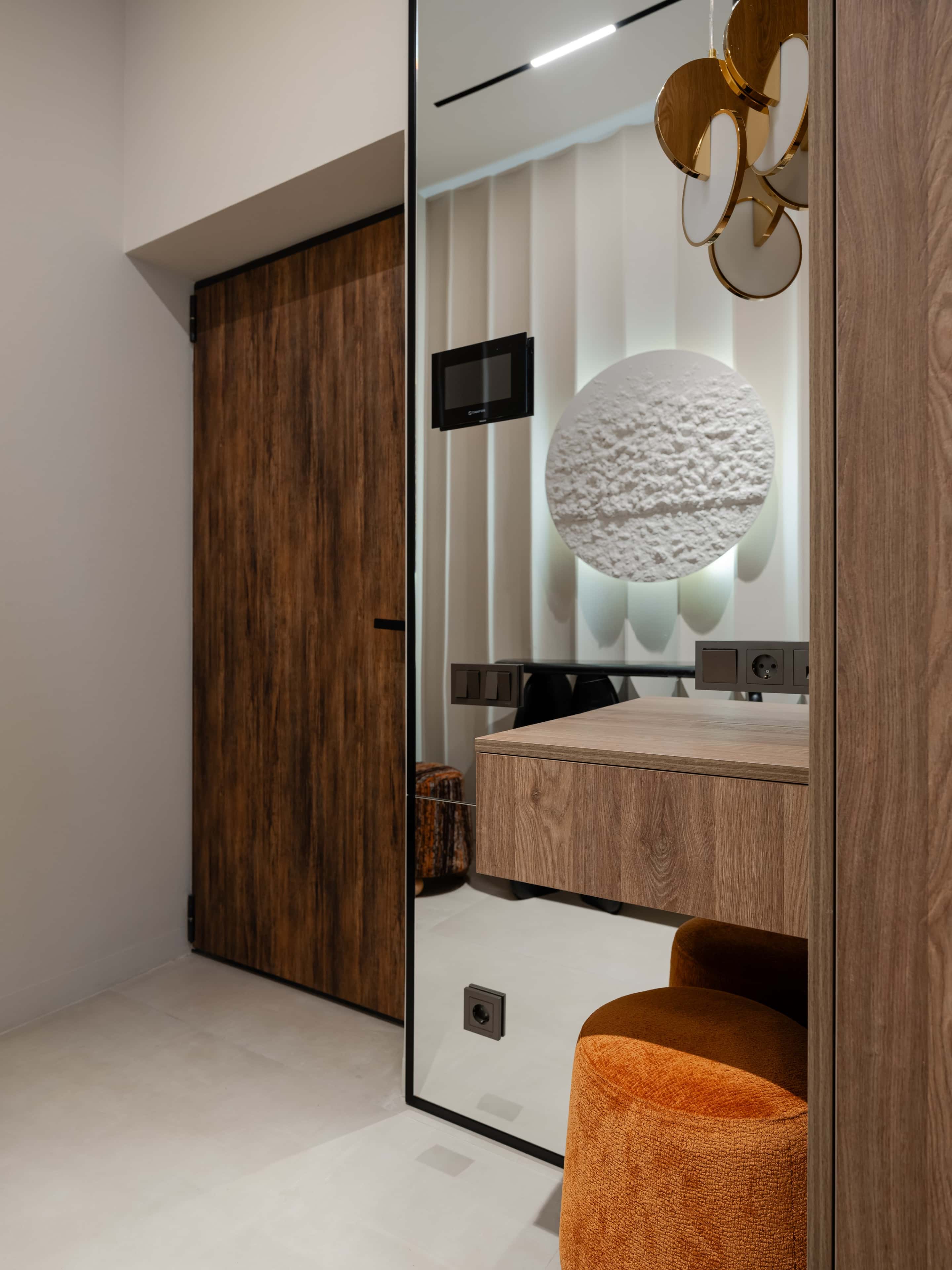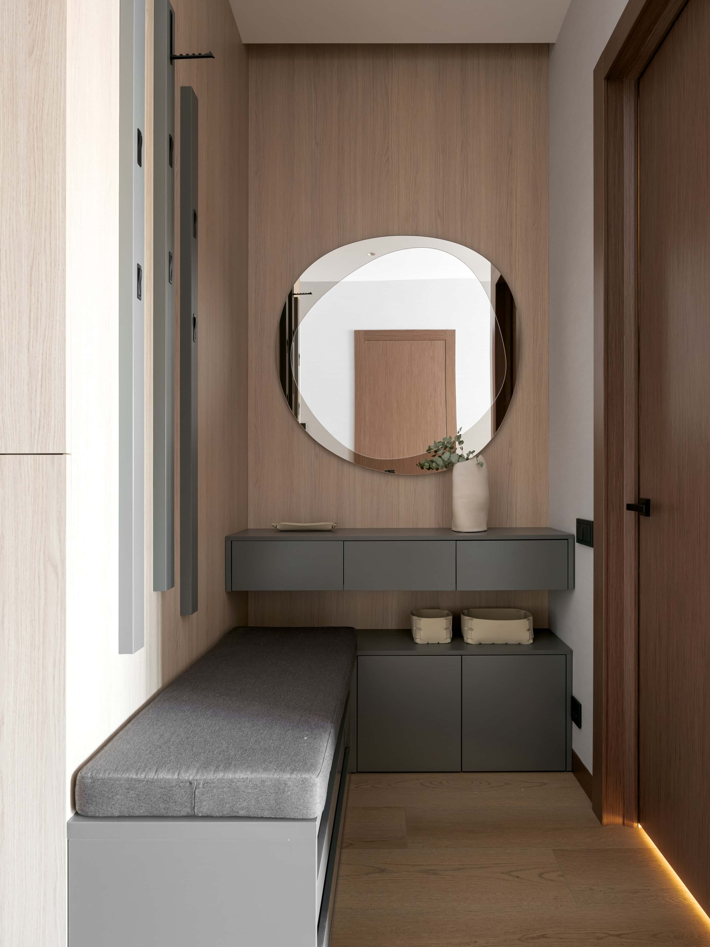 Интерьер оформили в стиле минимализм, выбрав отделку с фактурой дерева, которая сделала обстановку актуальной и уютной. Во всей квартире установили натяжные потолки, что позволило сократить сроки ремонта. В обеих спальнях подключили сплит-системы и делали вместительные гардеробные шкафы. А прихожую украсили оригинальным панно из рельефных гипсовых панелей — оно стало фоном для графичной черной консоли.