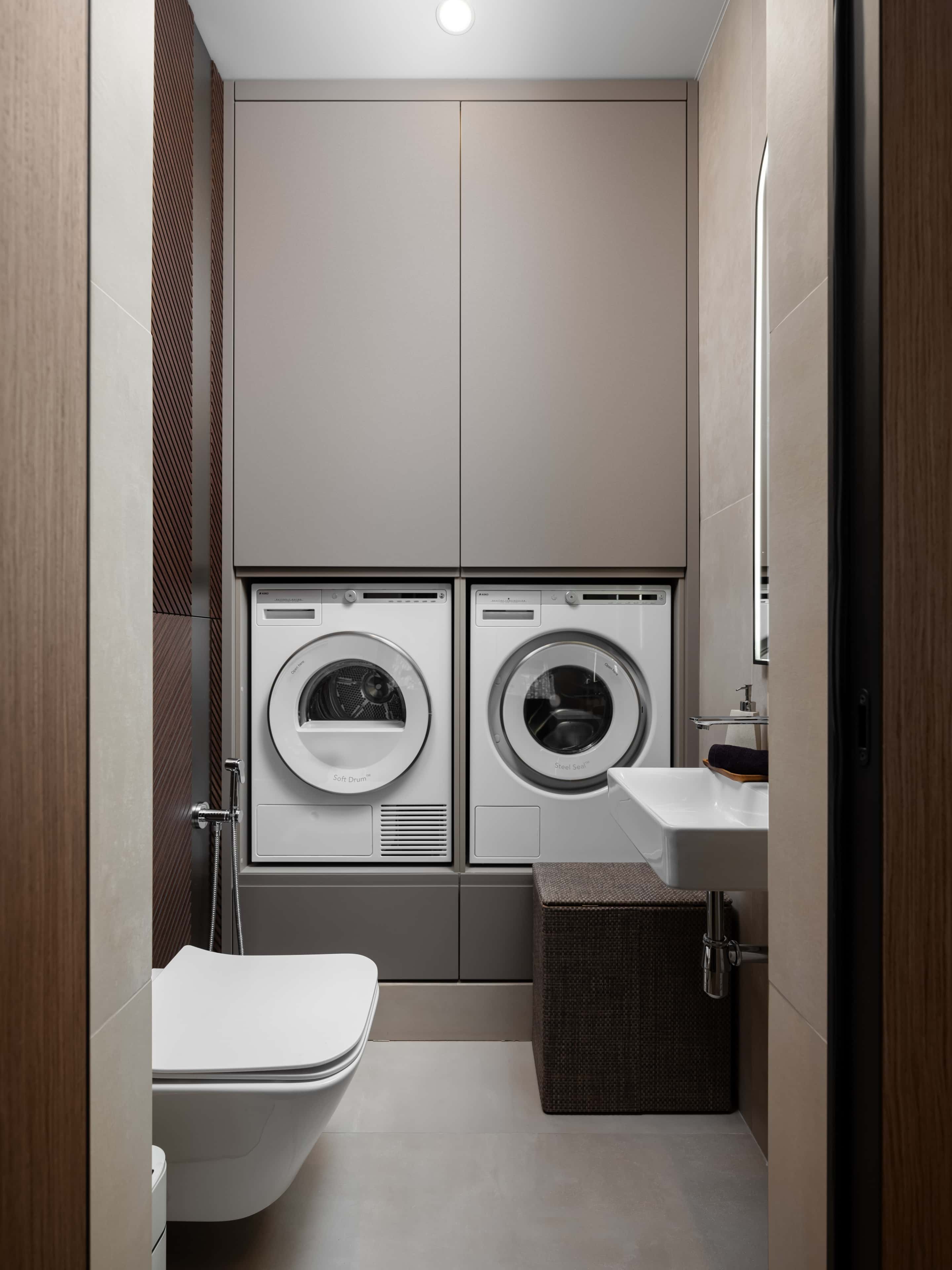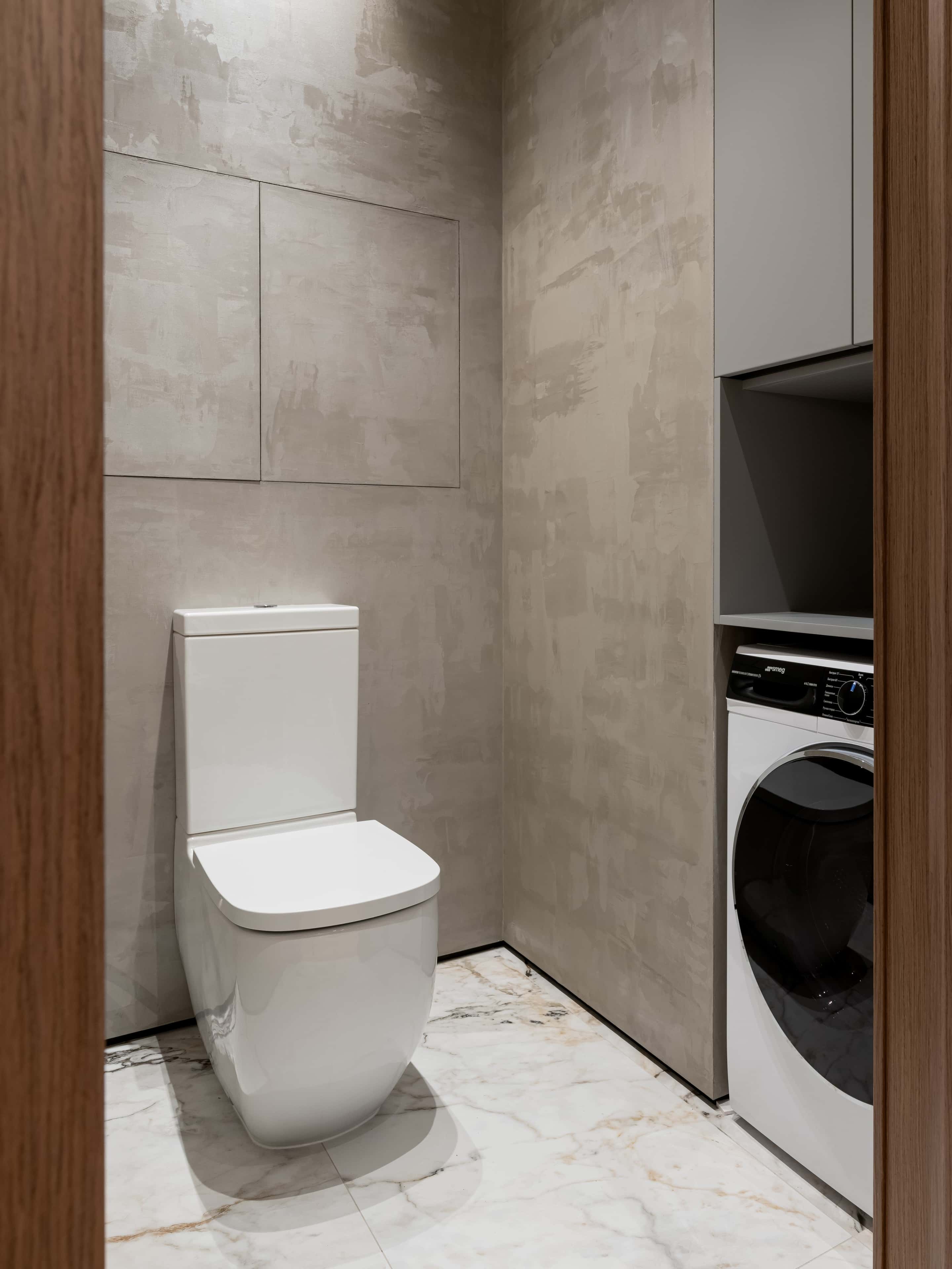 Первоначальную планировку изменили с целью оборудования гардеробных и санузлов для двух спален. Кухню объединили с гостиной, а чтобы можно было наслаждаться красивым видом на город, возле панорамного окна в кухонной зоне установили барную стойку. Также после ремонта в квартире появились кабинет с функционалом гостевой спальни и мини-прачечная.