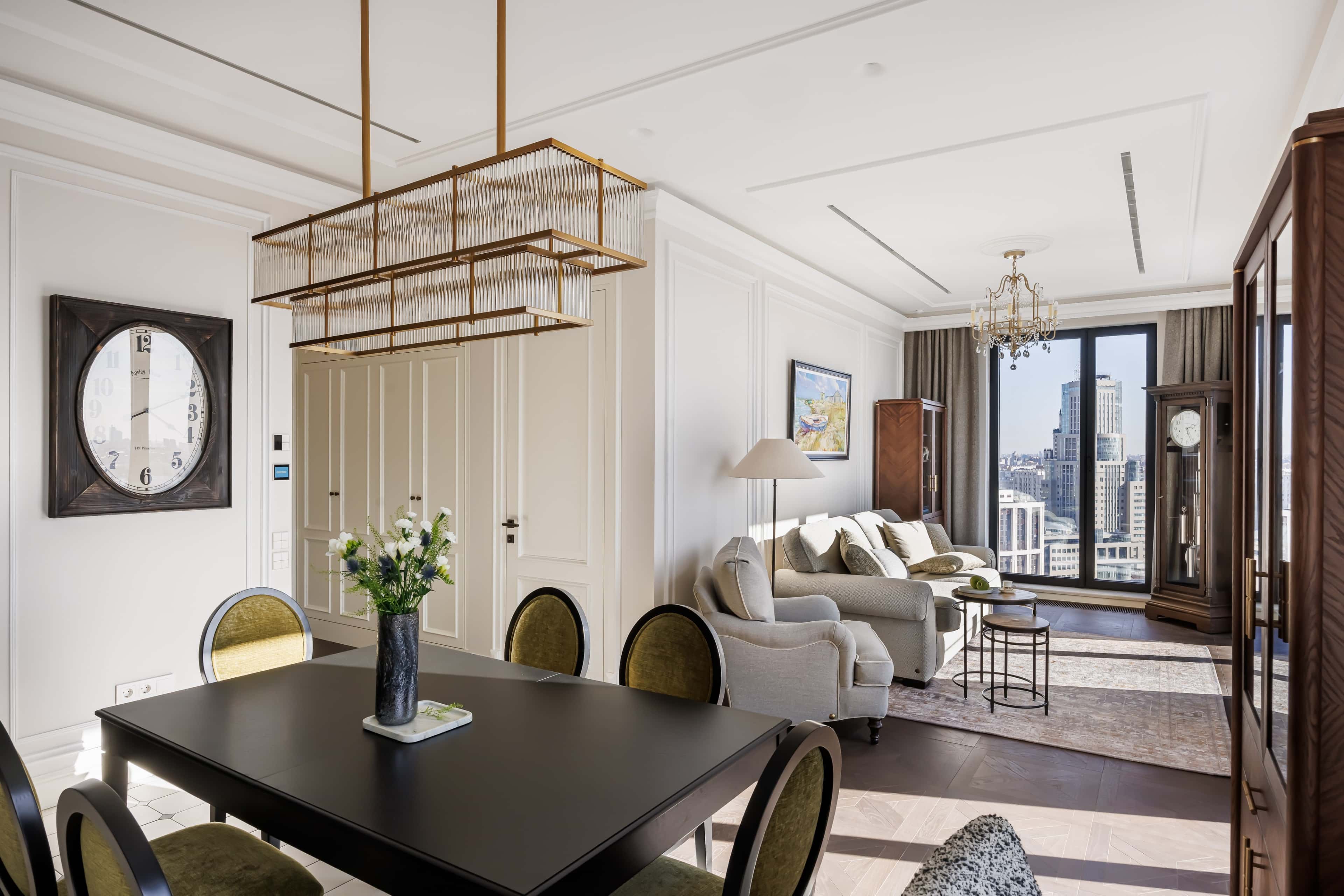 Для дизайна и ремонта квартиры площадью 119 м² наши заказчики — супружеская пара — выбрали респектабельную американскую классику. Для этого стиля характерны легкая эклектика, наличие элементов колониального стиля и присутствие антикварных предметов. В результате получилась уютная, практичная и красивая обстановка, проникнутая духом семейной истории. Классические диваны и напольные часы эффектно смотрятся в гостиной с окнами в пол, а люстра с имитацией свечей идеально сочетается с традиционными панелями буазери.