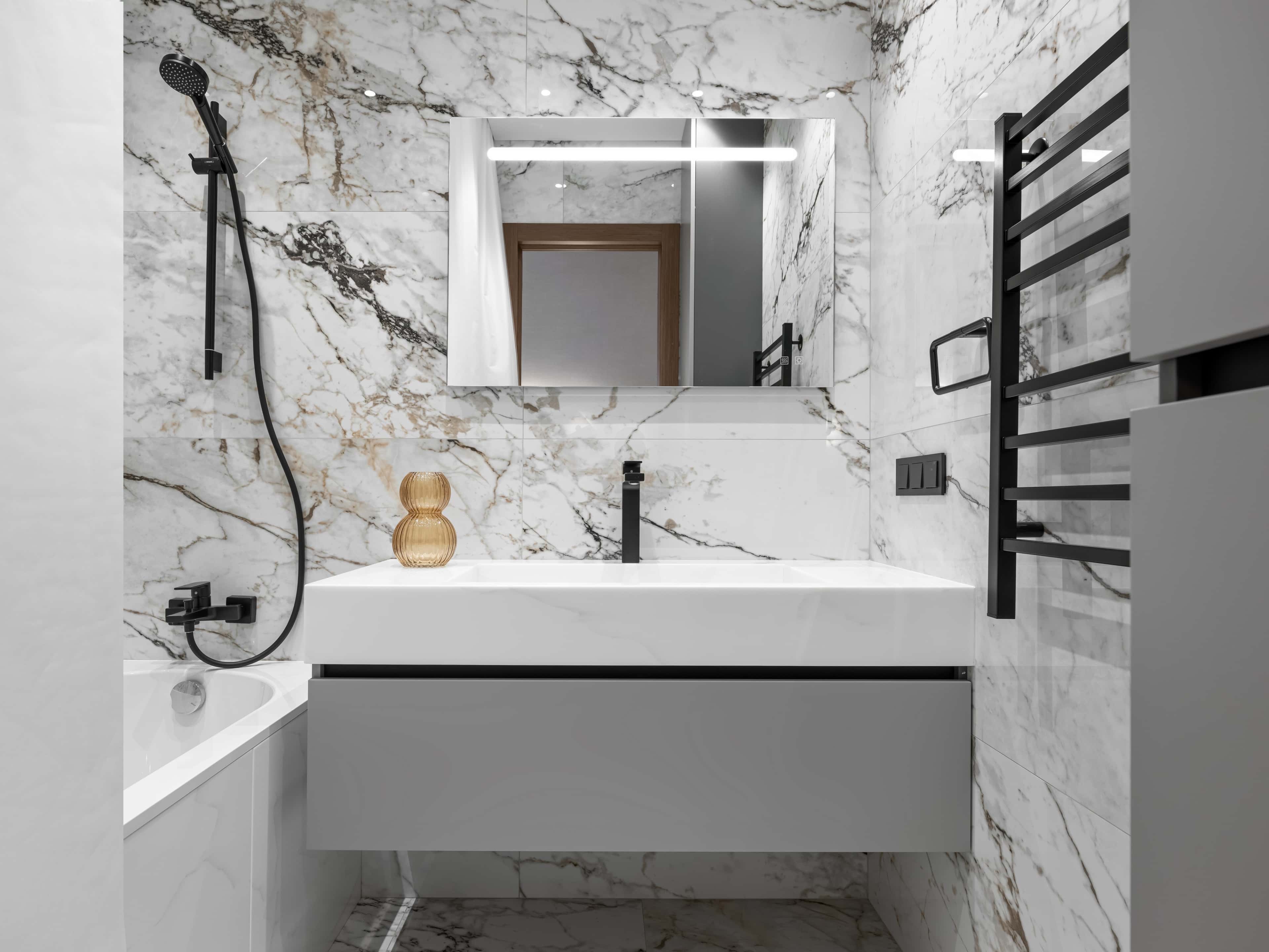 В процессе капитального ремонта с перепланировкой специалисты «Вира-АртСтрой» проложили новые коммуникации, смонтировали систему вентиляции, установили нужную хозяевам бытовую технику. В качестве основных отделочных материалов выбрали керамогранит под белый мрамор и инженерную доску теплого тона. А аристократизма и роскоши в обстановку добавили с помощью предметов интерьера, светильников и аксессуаров цвета желтого золота.