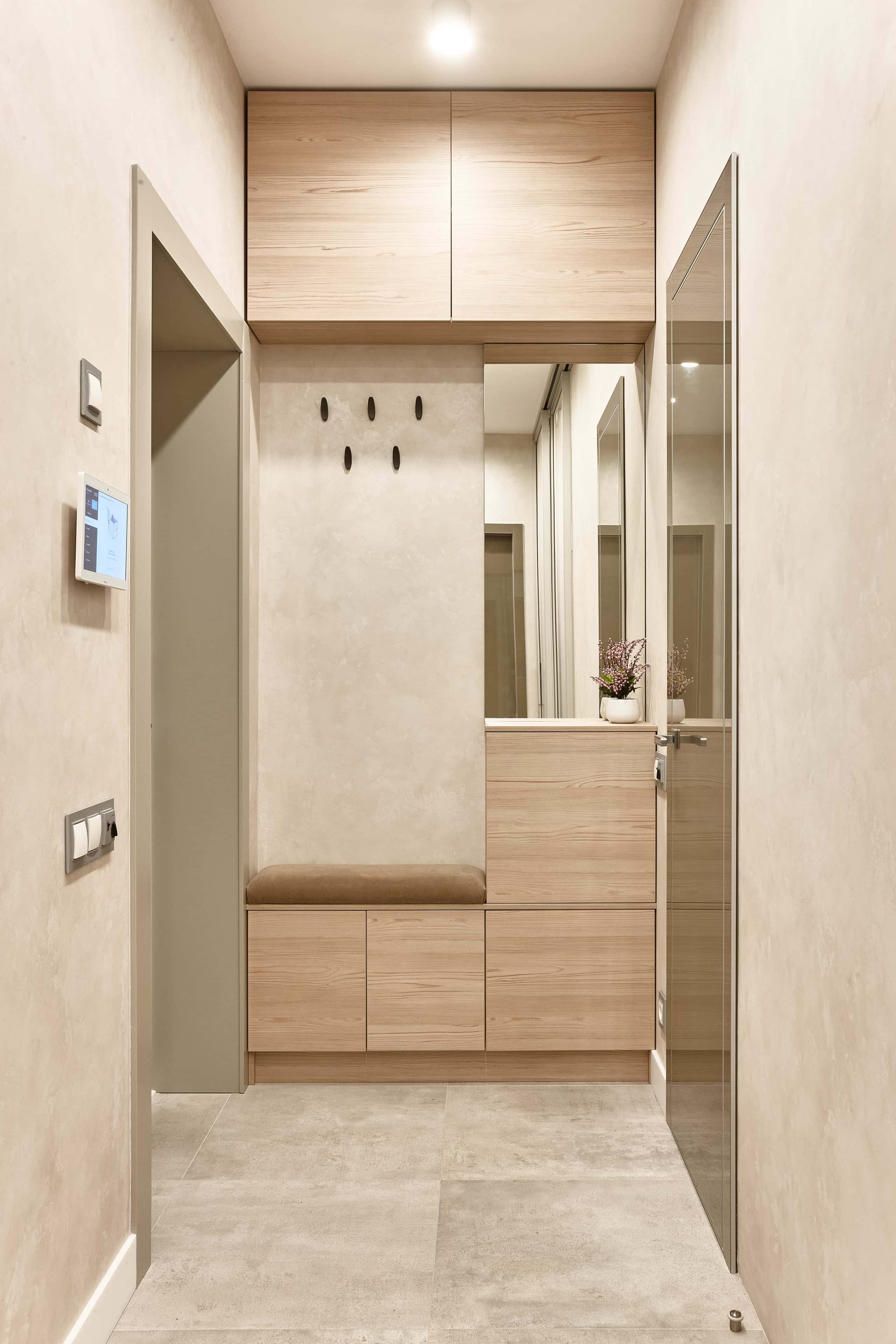 В стремлении улучшить эргономику пространства, наши дизайнеры сделали кухонный блок угловым, дополнив его двумя рядами подвесных шкафов и барной стойкой, а для спальни подобрали откидную кровать-трансформер. В небольшую прихожую органично вписался компактный мебельный модуль с мини-комодом, мягкой скамьей, открытой вешалкой и обувницей.