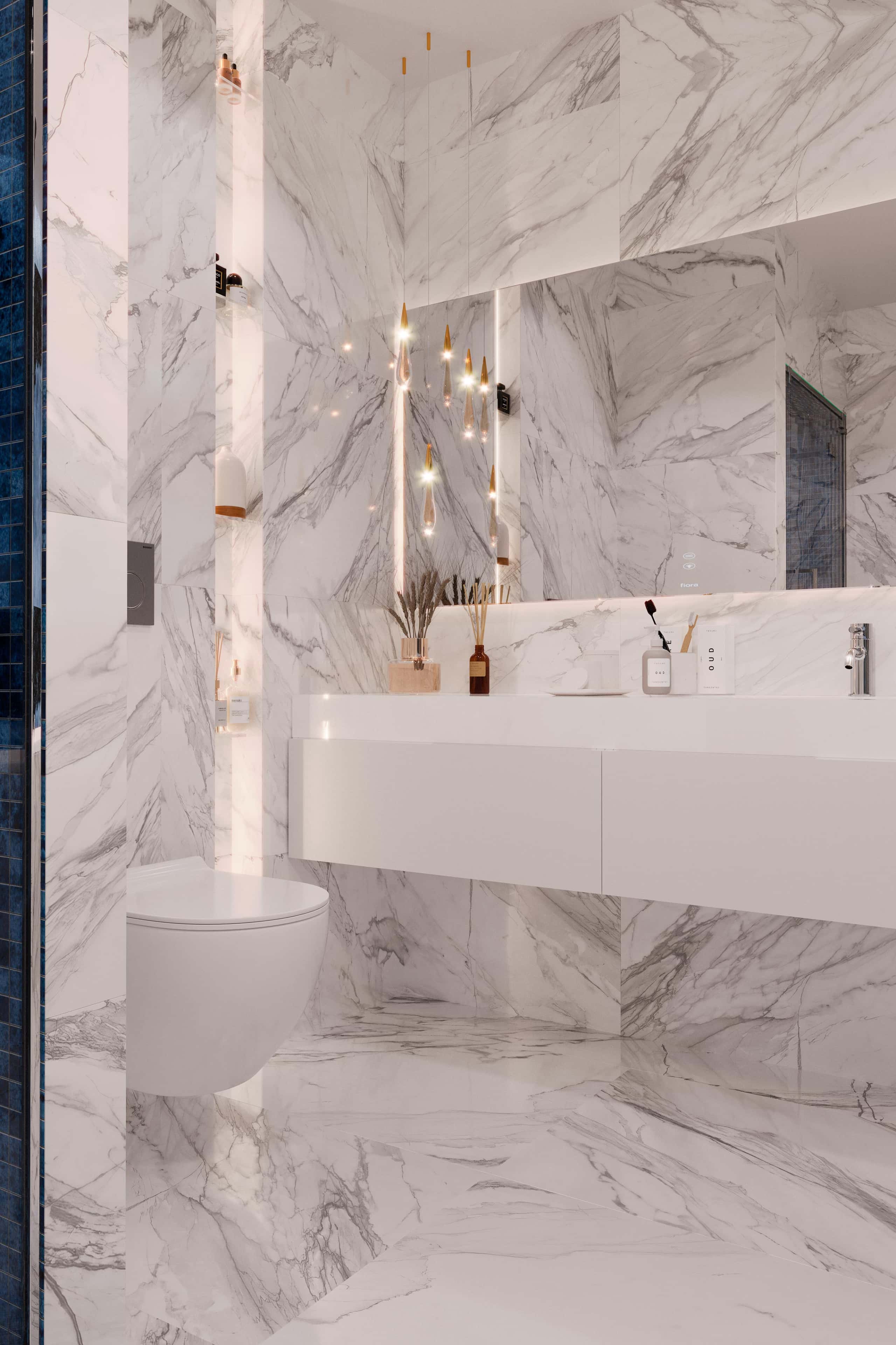 Современная классика с французским акцентом в интерьере этой квартиры для взрослой семейной пары это украшенные виньетками лепные молдинги в отделке стен гостиной, версальская роскошь декора в спальне, гипсовые античные статуи и белый мрамор в прихожей и ванной. Классическая составляющая гармонично ложится на современную основу интерьера квартиры с панорамными окнами.