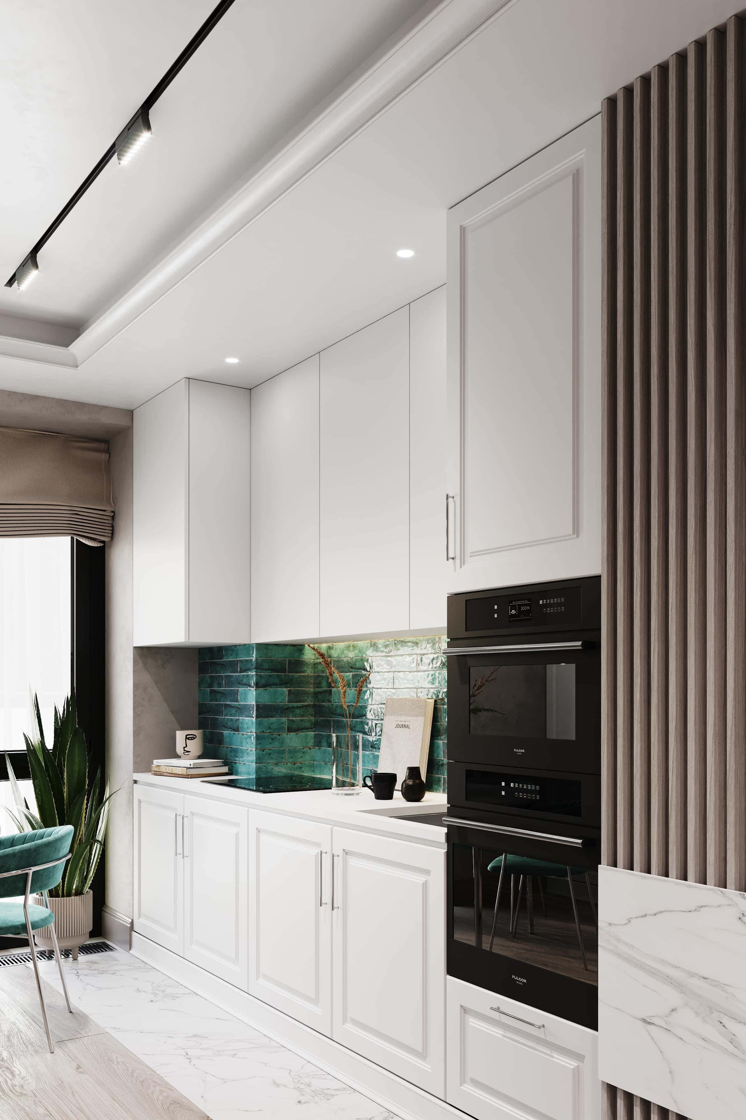 На роль ярких акцентов авторы проекта выбрали аксессуары, мебель и элементы отделки малахитового оттенка. Спальню и детскую для девочки решили в светлых тонах, обогатив обстановку необычными фресками. А строгий лепной карниз на потолке органично дополнила светодиодная контурная подсветка.