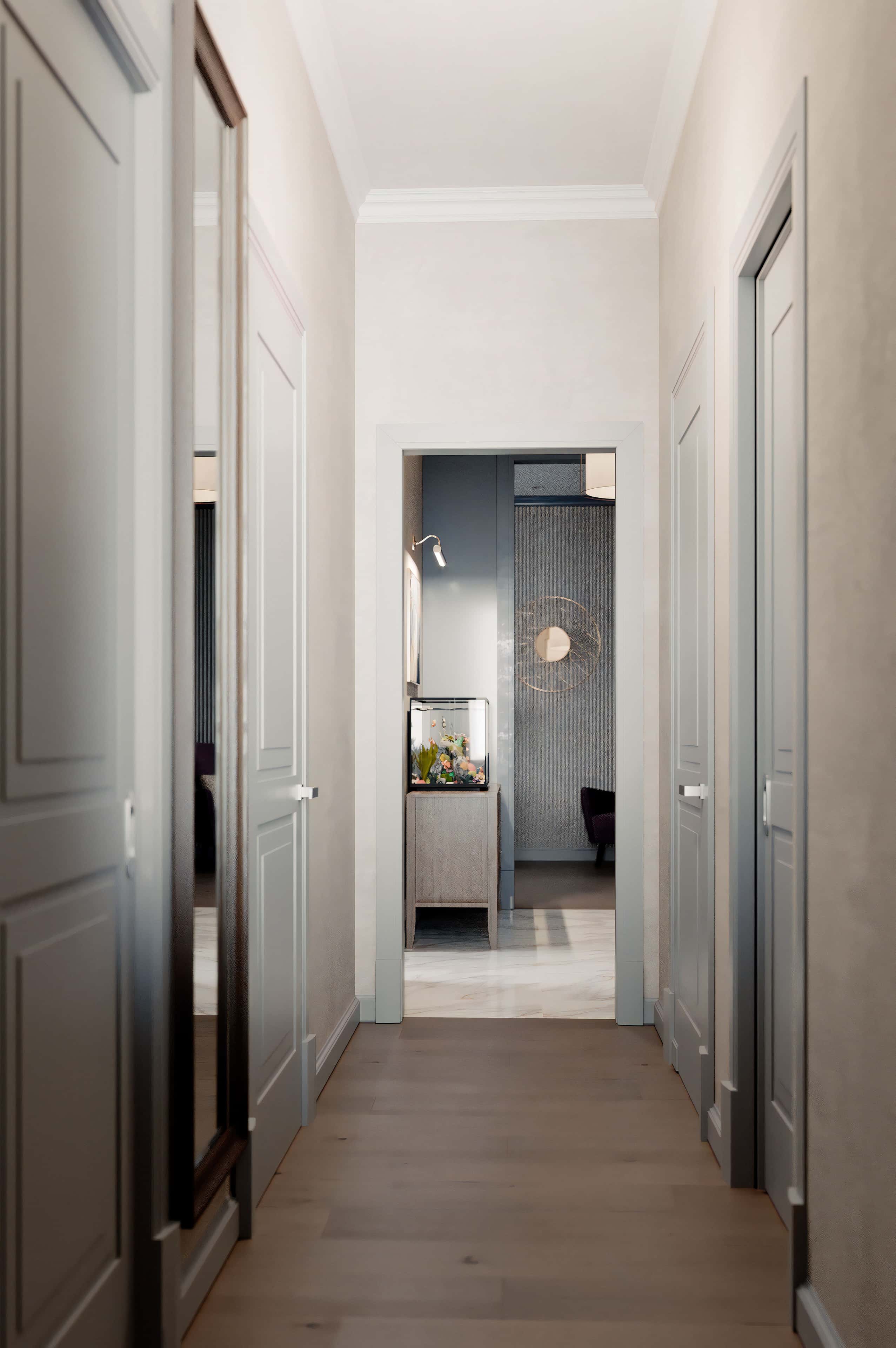 Изысканный интерьер этой квартиры в стиле неоклассика поражает уютом и продуманной эргономикой. Благодаря свободной планировке у авторов проекта была возможность сформировать идеальное пространство для жизни. По желанию заказчиков все комнаты в квартире, включая гостиную, сделали изолированными, а их функционал расширили. Так, гостиную совместили с библиотекой и кабинетом, кухню — со столовой, спальню дополнили гардеробной, а в детскую интегрировали рабочее место.
