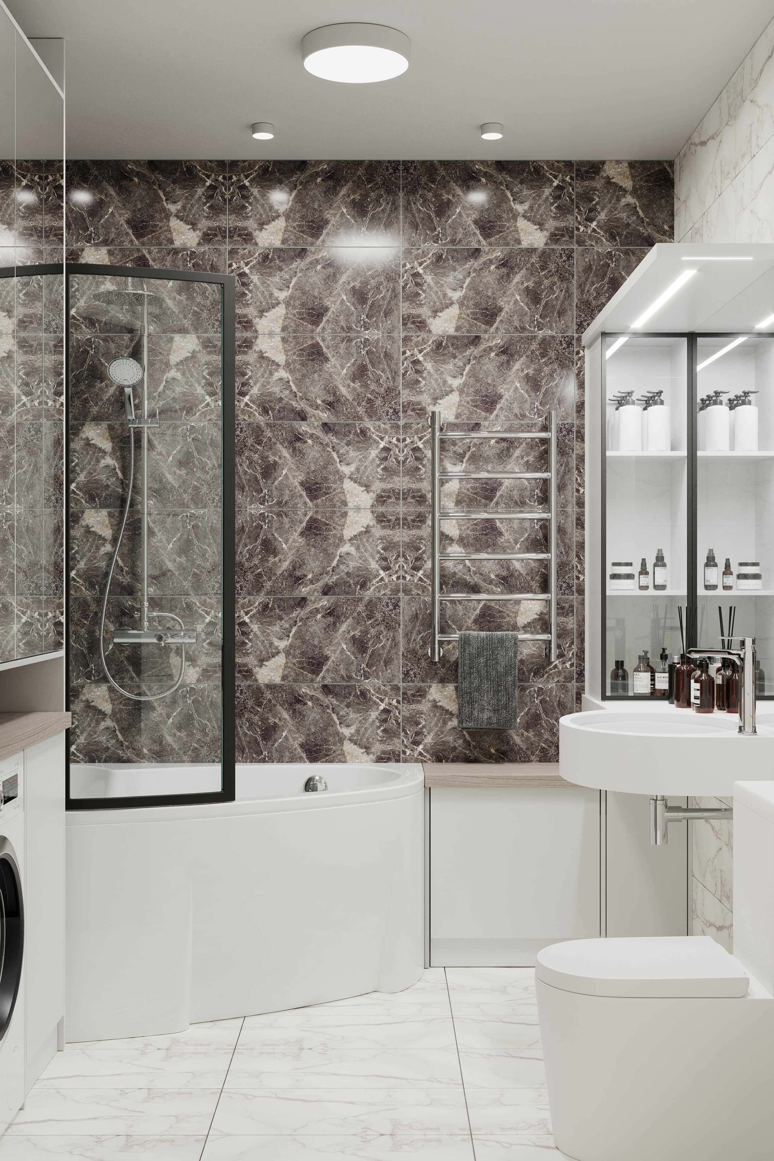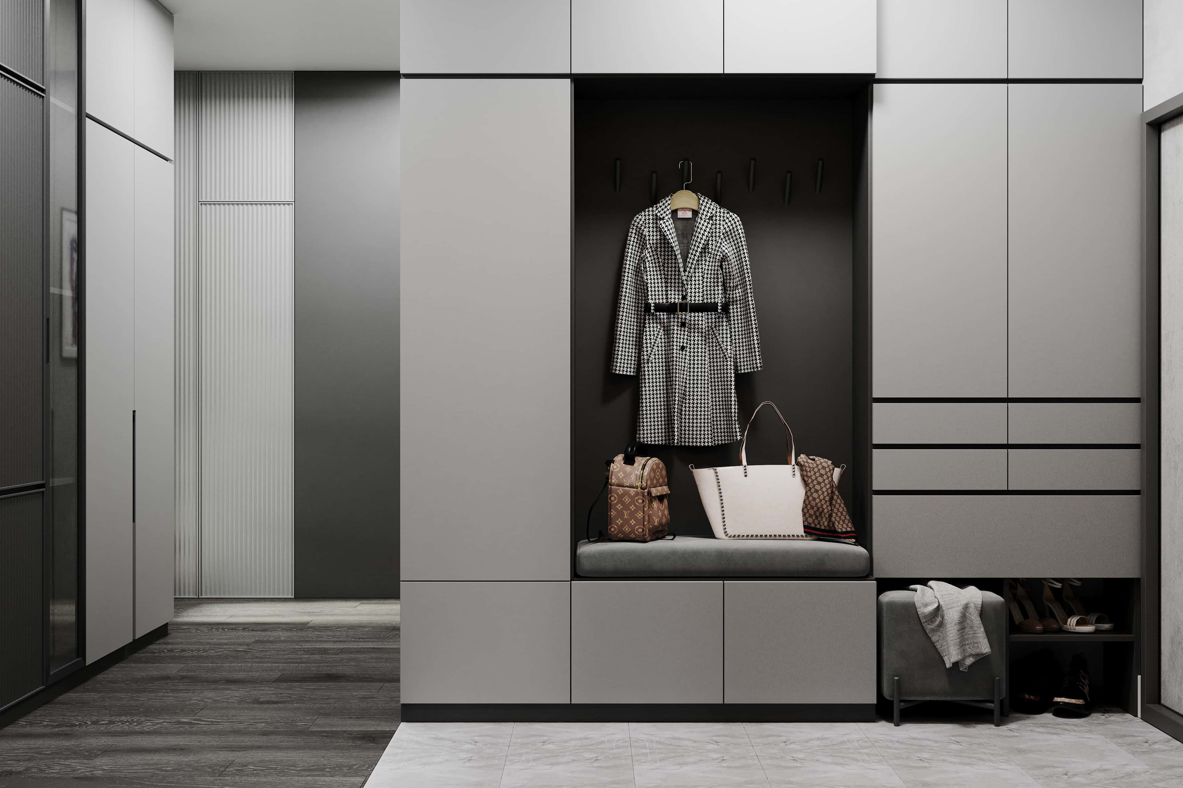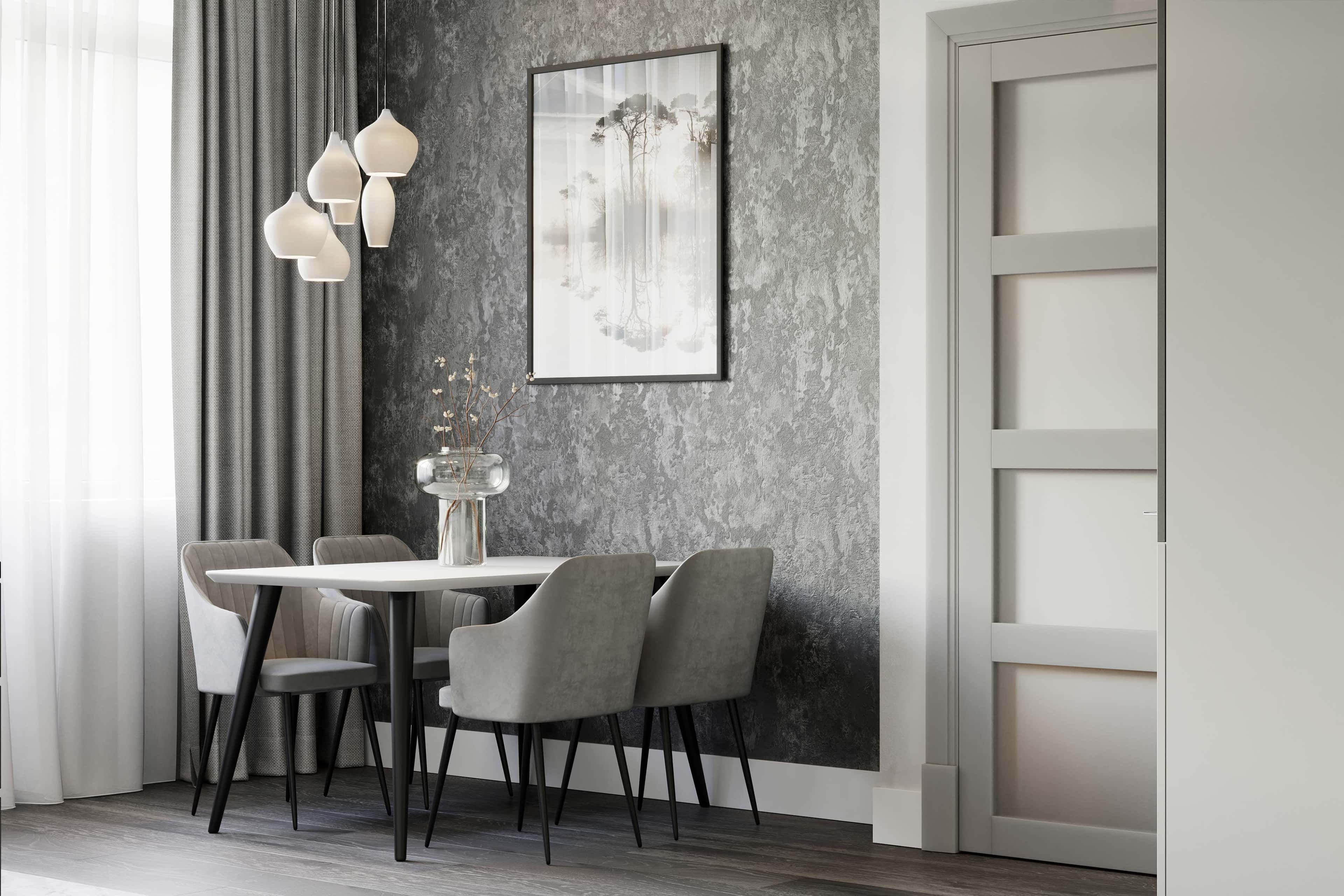 Отделку было решено выполнить в серых тонах и современном стиле с элементами минимализма и неоклассики. Так в проекте появилась черно-серая фактурная штукатурка, рифленые панели, текстиль в серой гамме и системы хранения с глухими гладкими фасадами, дополненными скрытой фурнитурой. А для отделки ванной комнаты и санузла использовали практичный модный керамогранит, имитирующий мрамор и оникс.