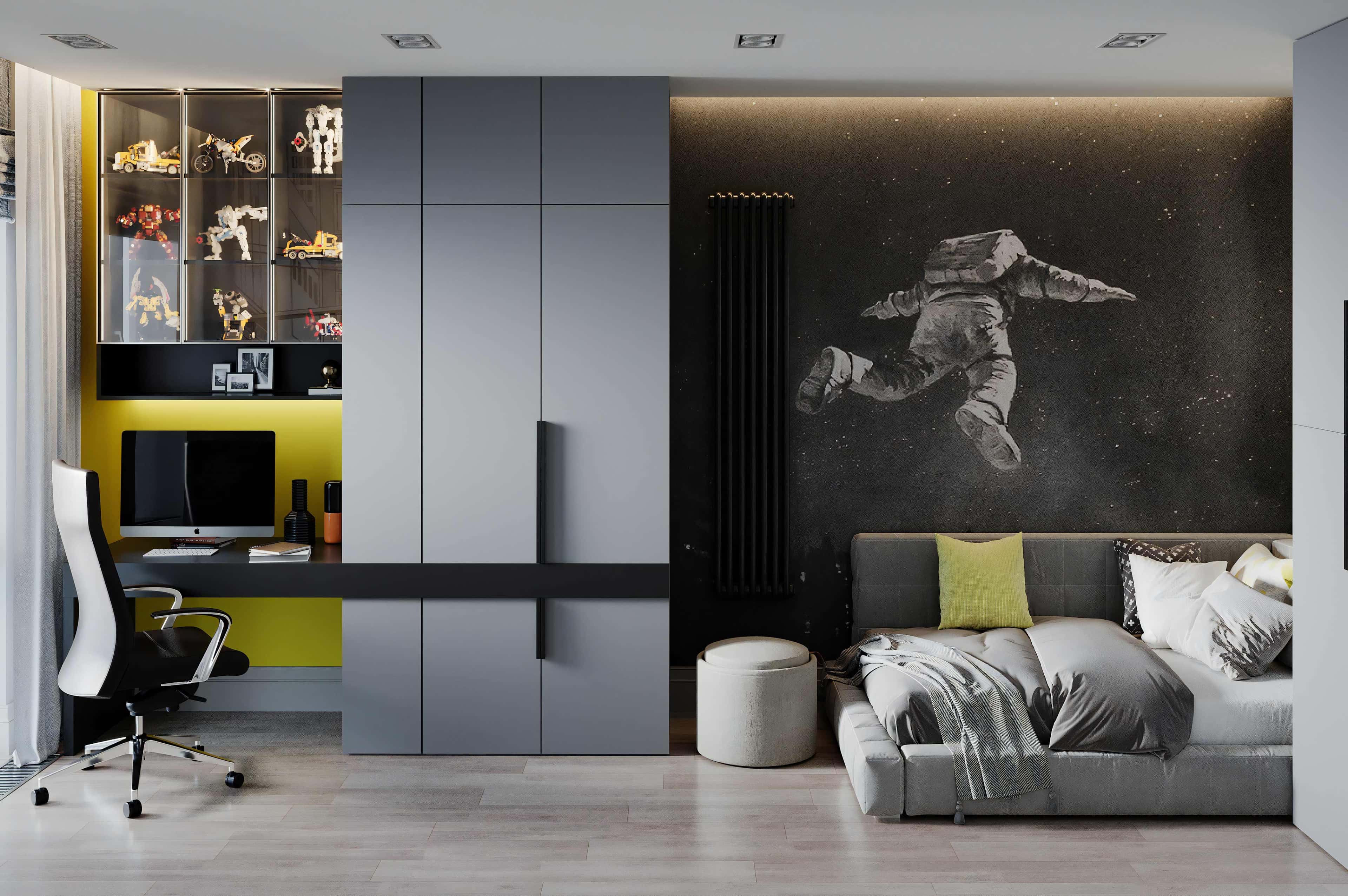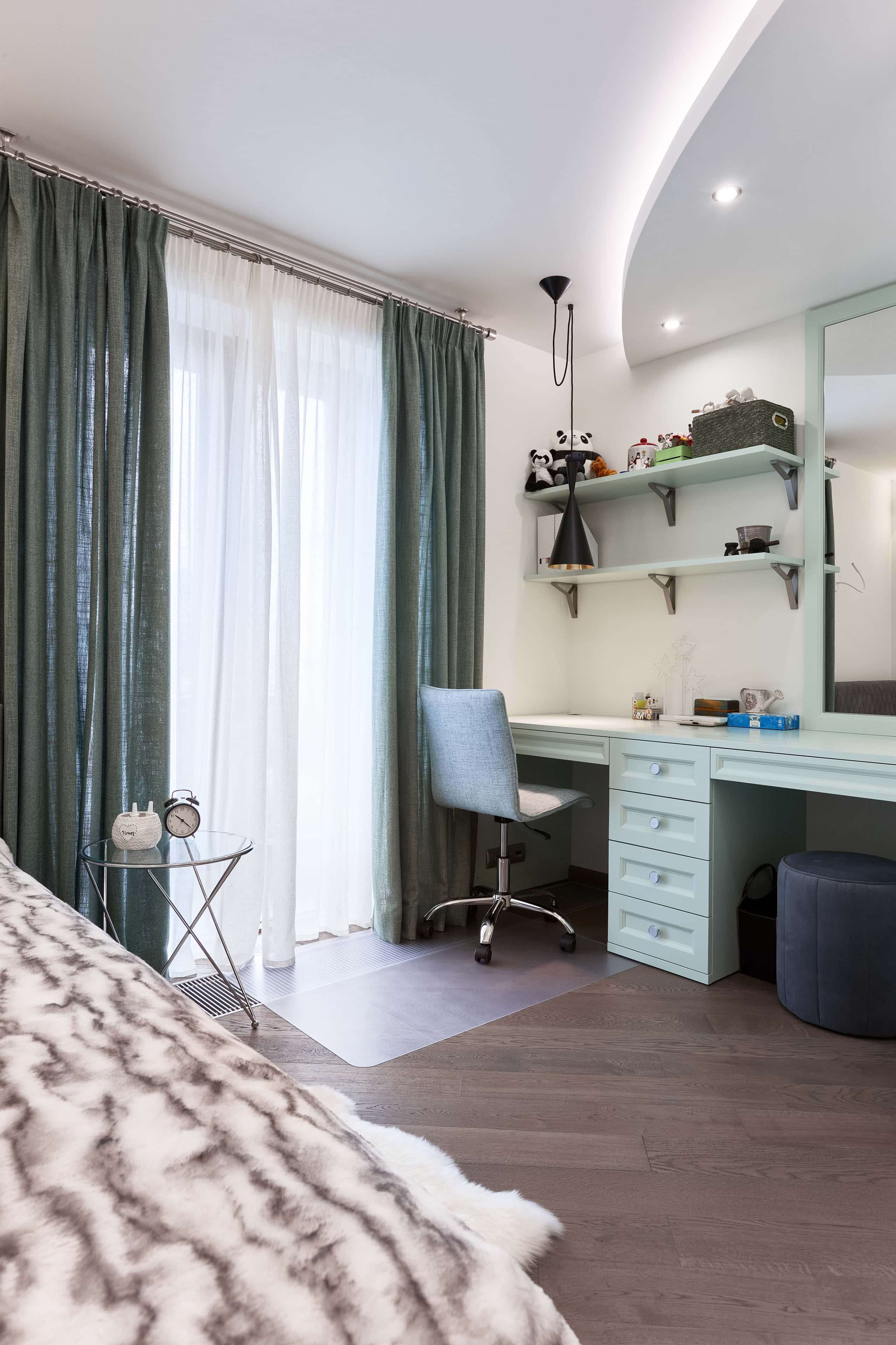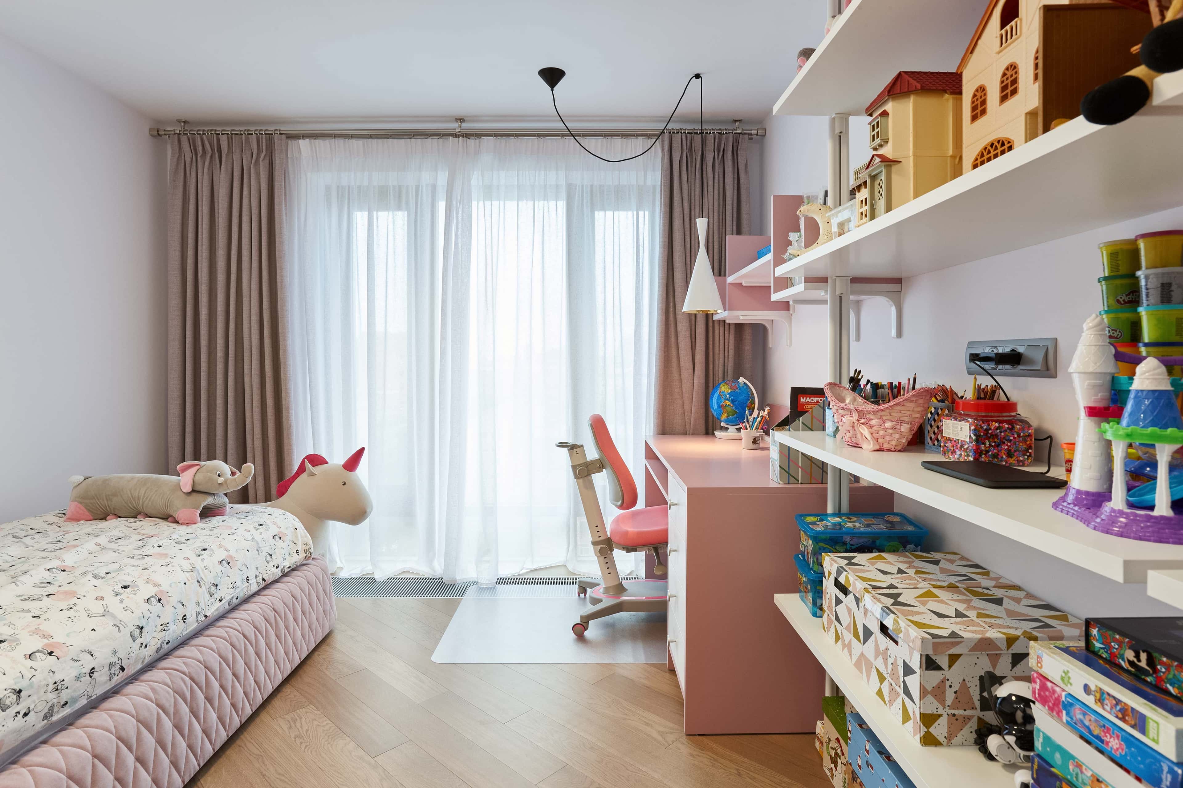 В детской и в коридоре разместили большие встроенные шкафы, глухие фасады которых воспринимаются как стеновая отделка. Компактную кухню сделали линейной, расположив вдоль одной из стен. А традиционный дверной блок на лоджии в спальне заменили эргономичной раздвижной дверью.