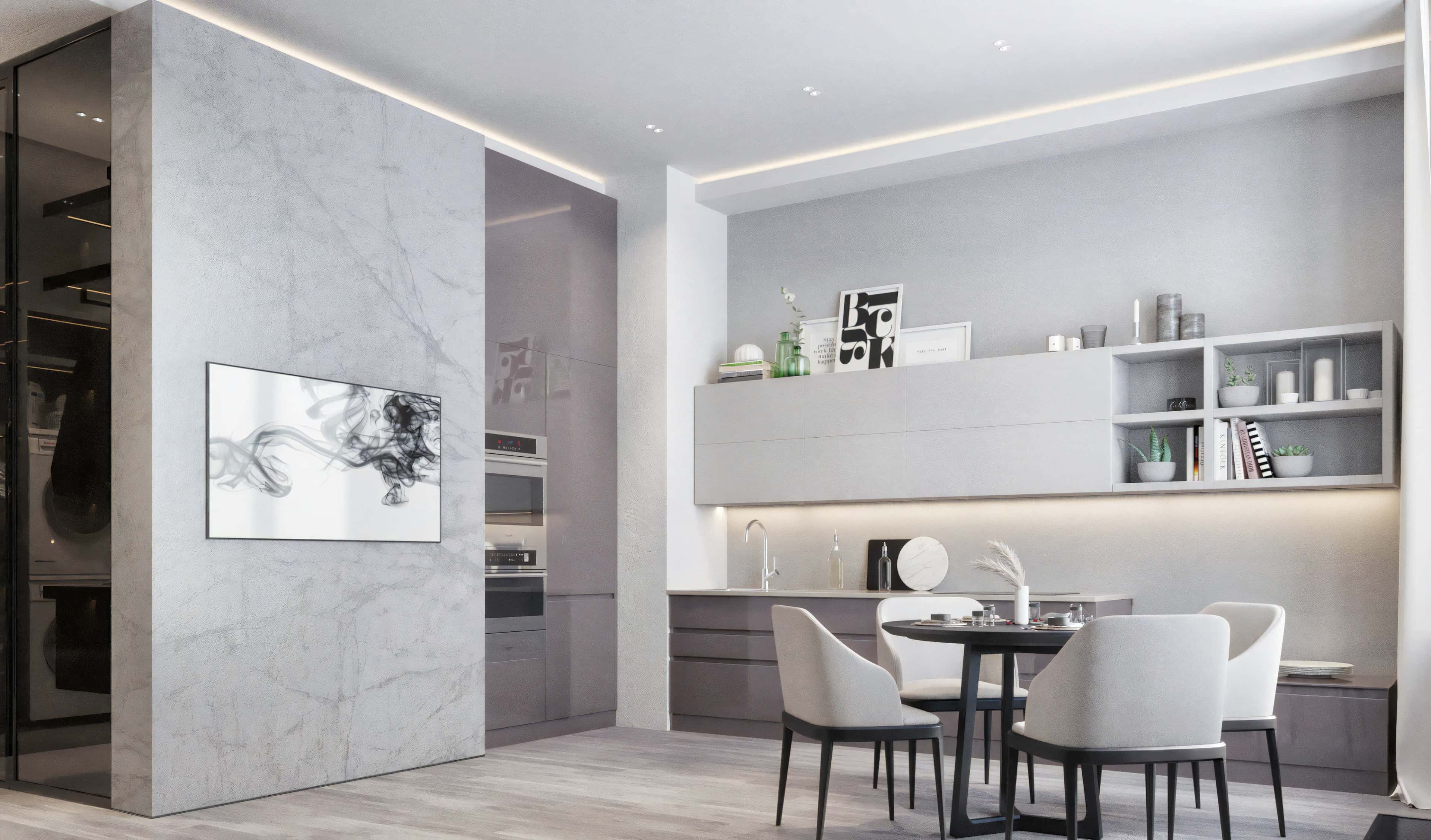 Для этой квартиры в престижной новостройке дизайнеры предложили стиль минимализм и светлую серо-белую гамму с черными акцентами, и не прогадали. Интерьер выглядит ультрамодным и обеспечивает членам семьи хозяев максимальный комфорт. Перепланировка, выполненная во время капитального ремонта, предполагала демонтаж/монтаж внутренних кирпичных перегородок, что позволило организовать гардеробную, увеличить площадь ванных, встроить шкафы в спальне и детской, а в кухне-гостиной сделать удобную ТВ-зону и компактно установить бытовую технику.