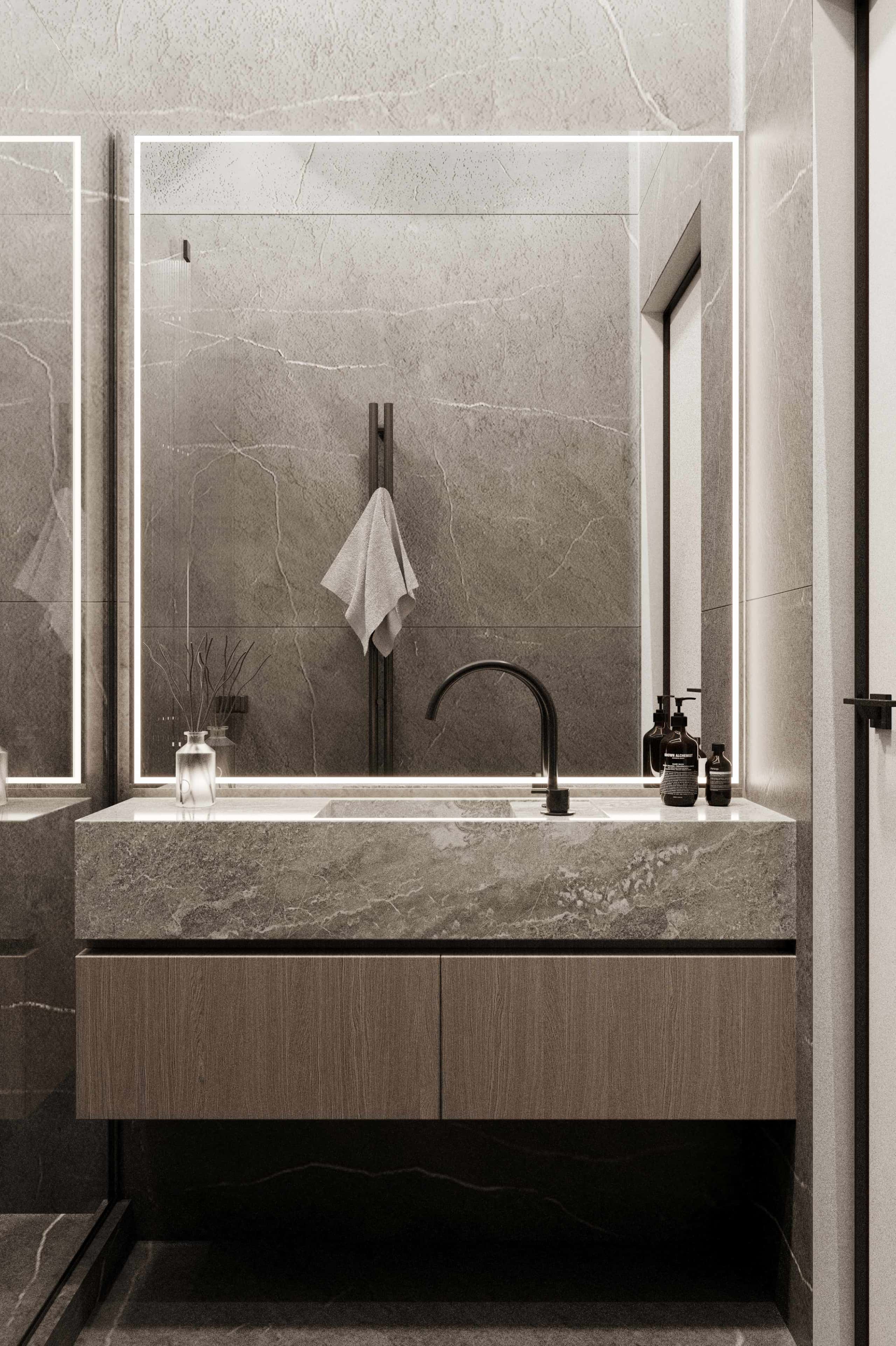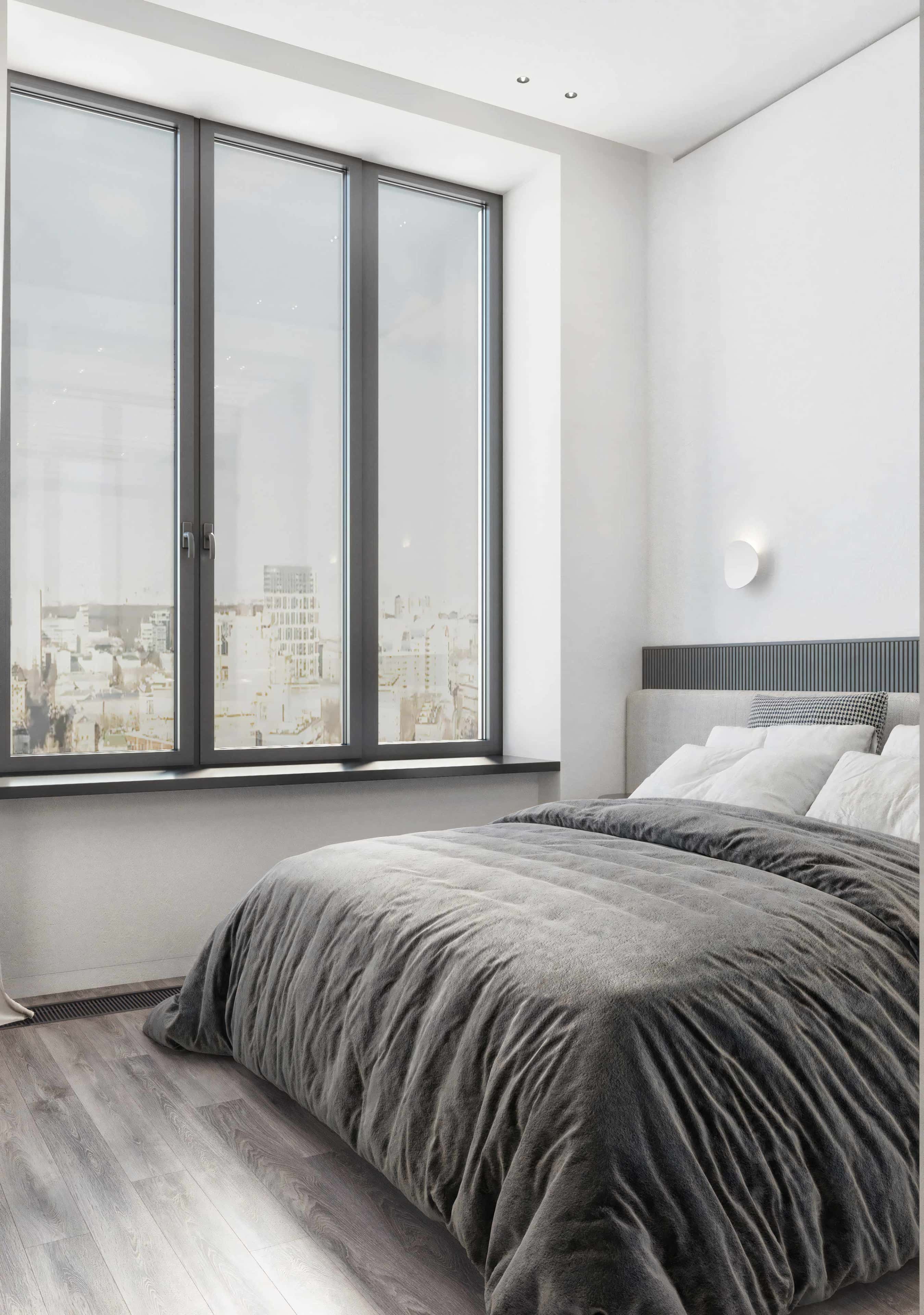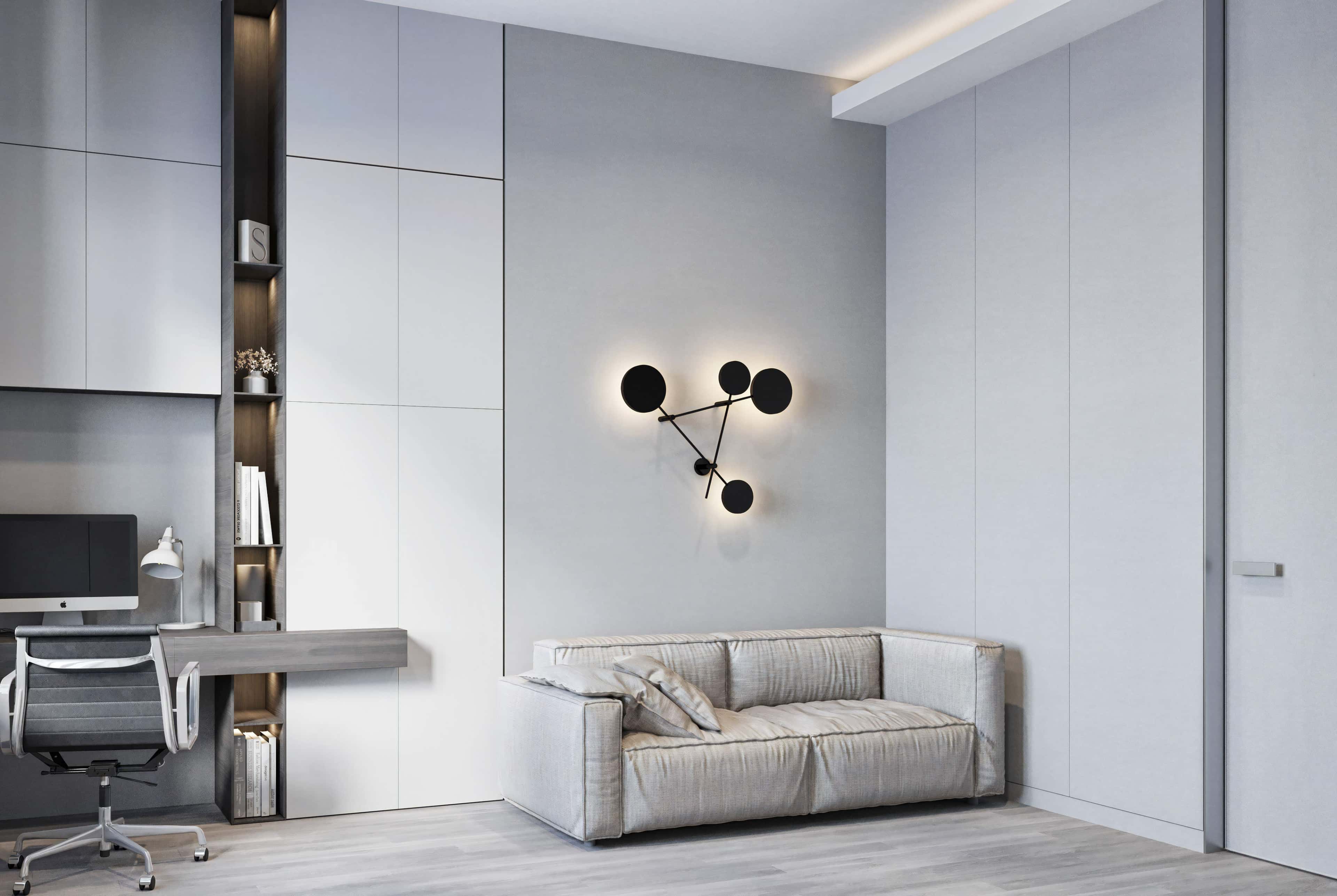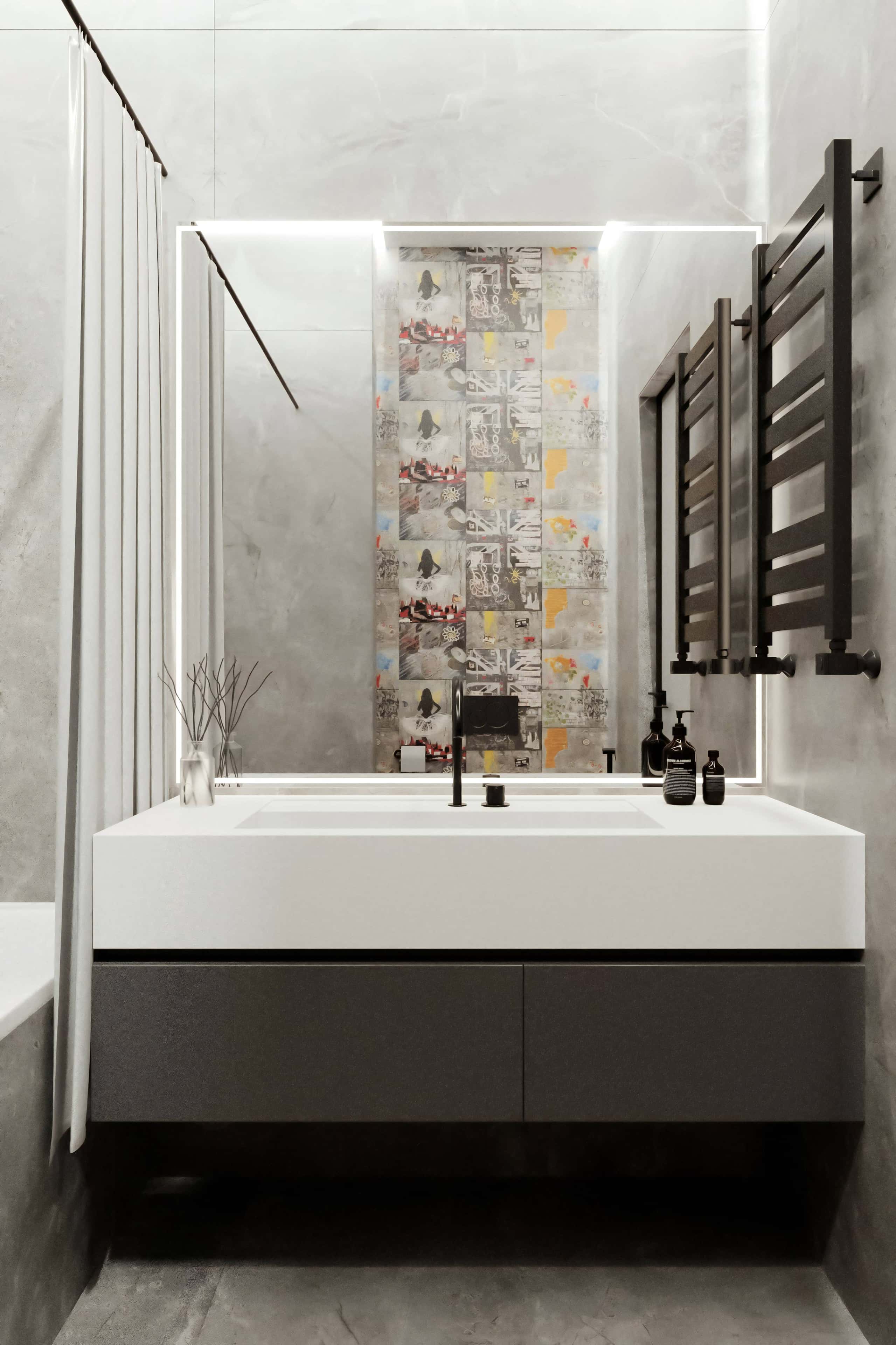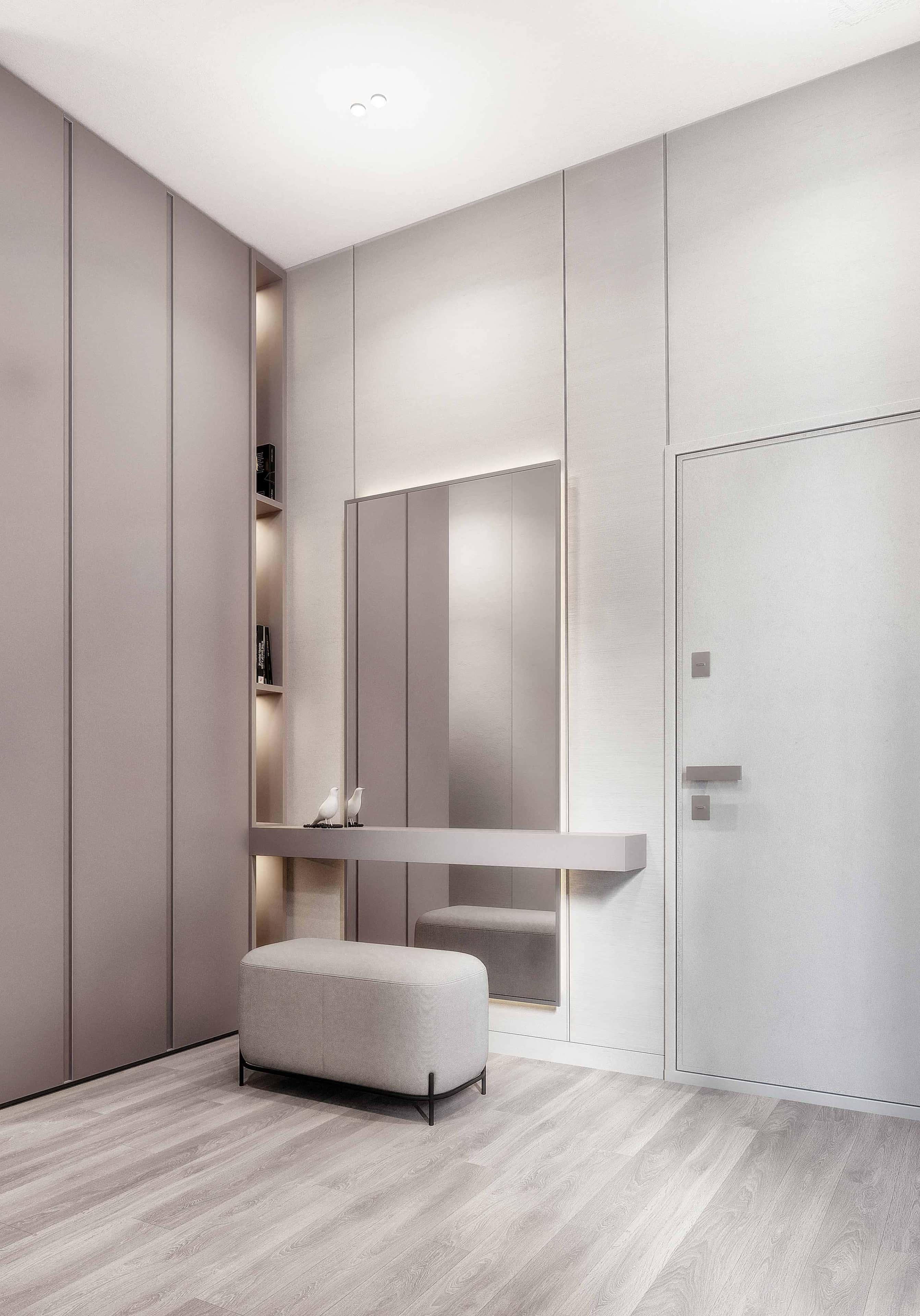 Серые тона, многообразие фактур, четкая геометрия — минималистичный дизайн этой квартиры в новостройке, где проживает семья из трех человек, реализован в духе модных интерьерных тенденций. Глобальную перепланировку в ней делать не стали, поскольку хозяев все устраивает, но перенесли несколько дверных проемов, скорректировали конфигурацию спальни, увеличили ванную комнату и заменили радиаторы отопления.