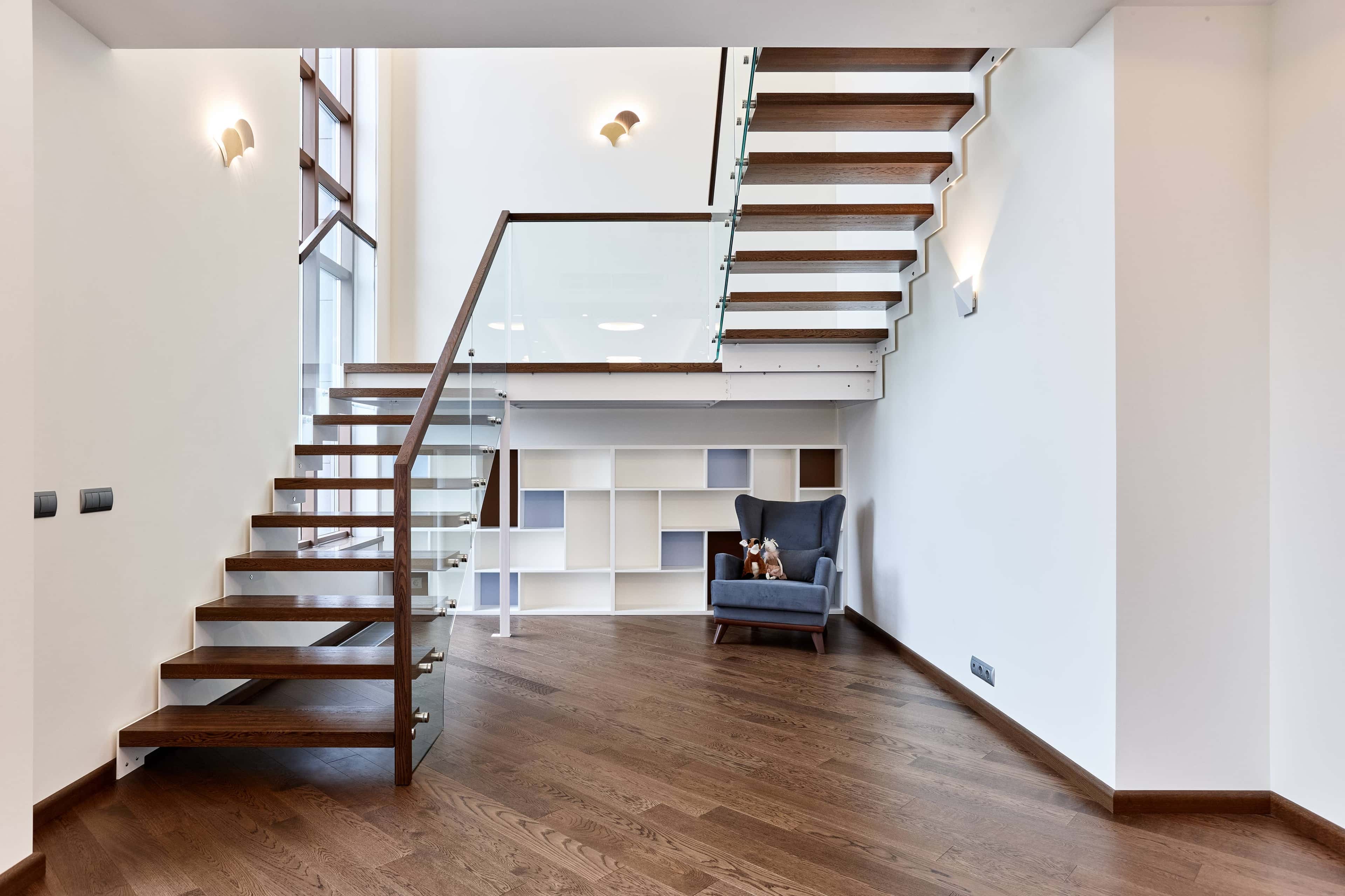 Благодаря перепланировке площадь этой квартиры в современном стиле после капитального ремонта увеличилась с 92 до 176 м². Архитекторы нашей компании спроектировали второй этаж, где разместились приватные помещения, и удобную лестницу с двумя маршами и переходной площадкой. Реализовать этот проект позволила нестандартная шестиметровая высота потолка.