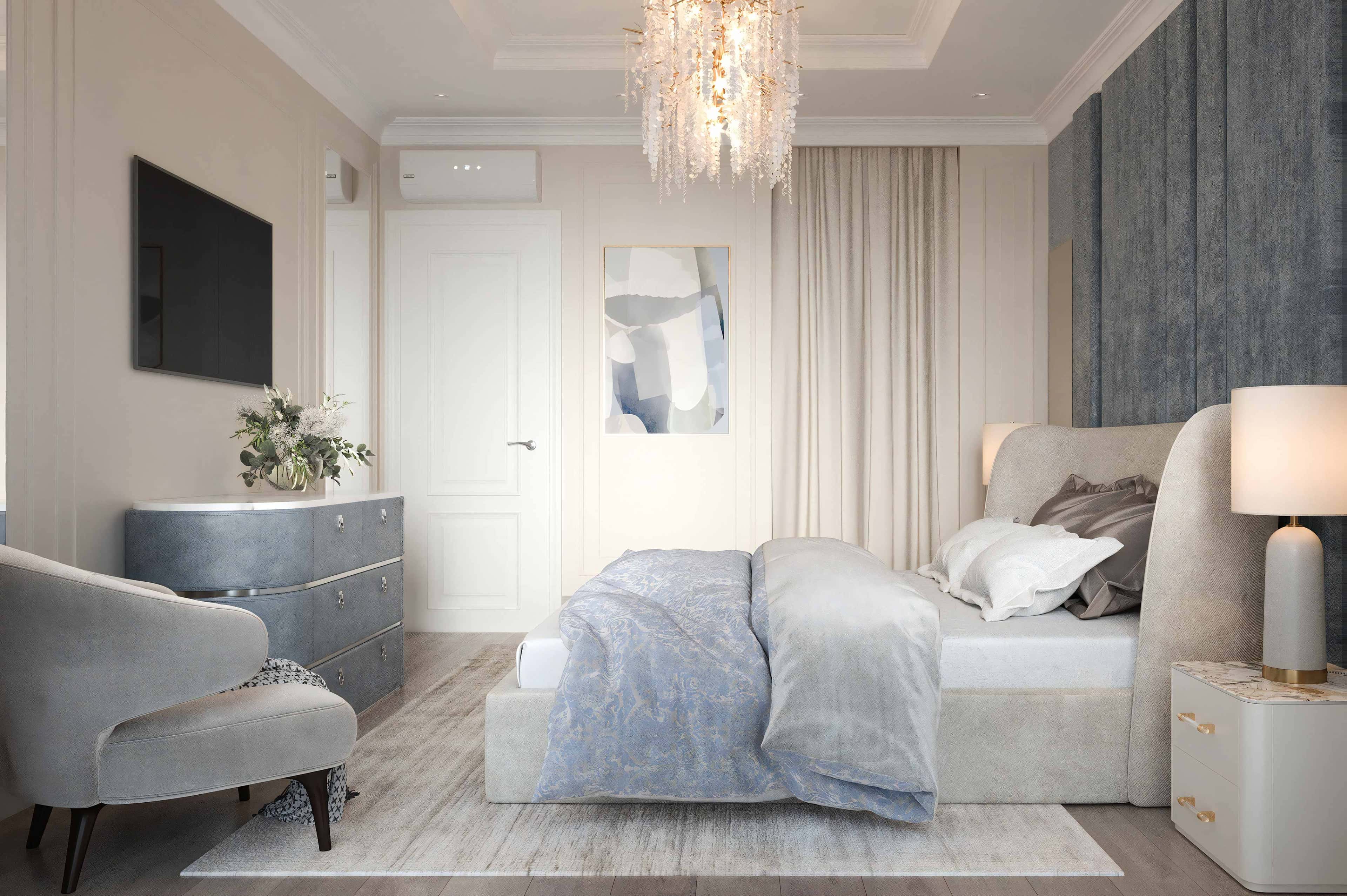 Чтобы визуально облегчить интерьер, добавить пространству объема и воздуха, дизайнеры использовали в отделке голубые, светло-серые и молочные тона, а ограждение лестницы выбрали из прозрачного закаленного стекла. Кроме жилых комнат на втором этаже появились две ванных — их разместили над мокрыми зонами первого этажа, что не нарушает правила перепланировки. А еще жилые помещения и коридор второго уровня дополнили встроенными системами хранения.