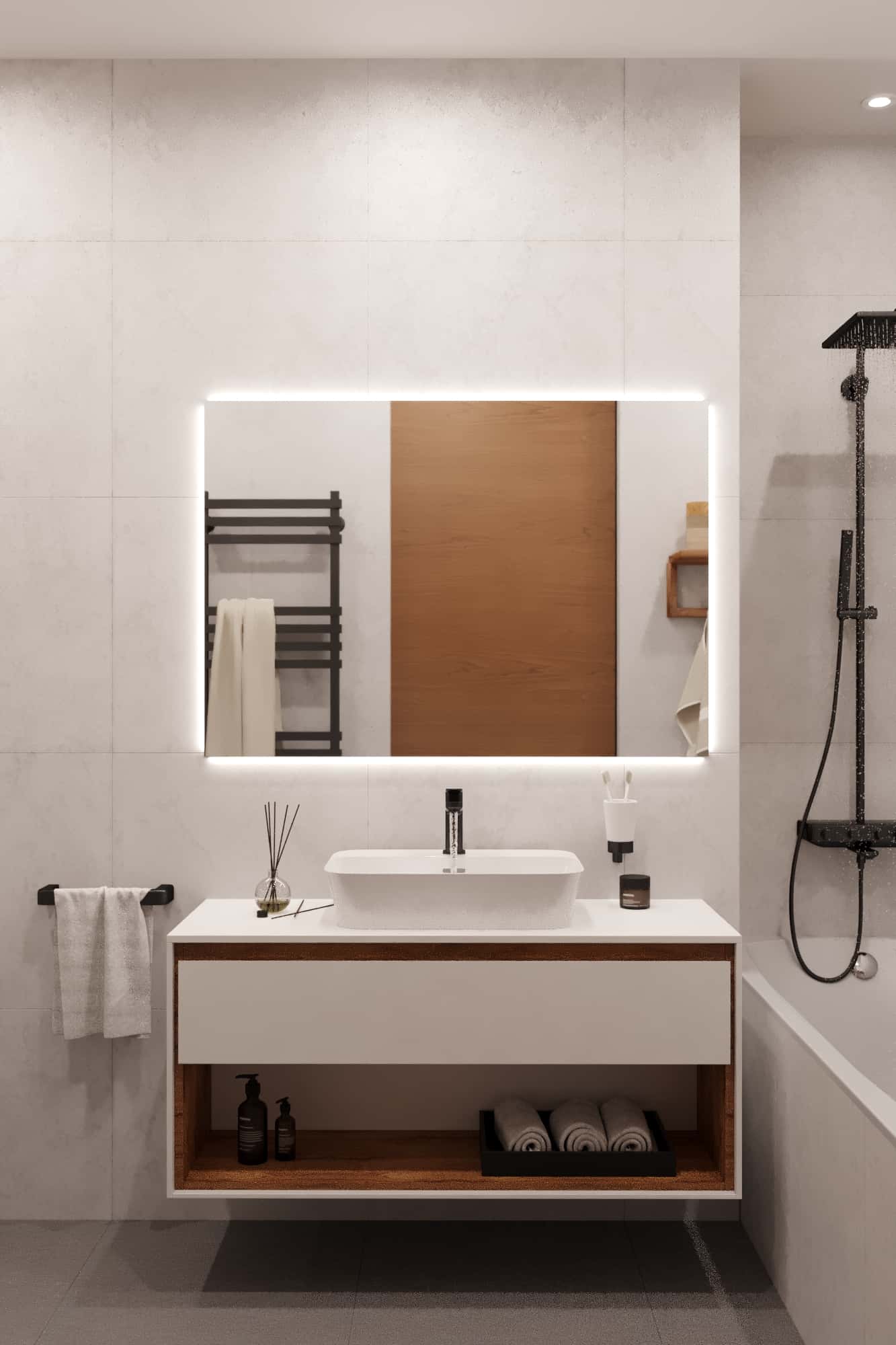 Бежевые оттенки в отделке, много дерева и черные детали — хороший выбор для минималистичного интерьера с элементами скандинавского стиля. Благодаря теплой колористике в помещениях царит комфортная атмосфера, а поддерживает ее светодиодная подсветка системы хранения в ТВ-зоне.