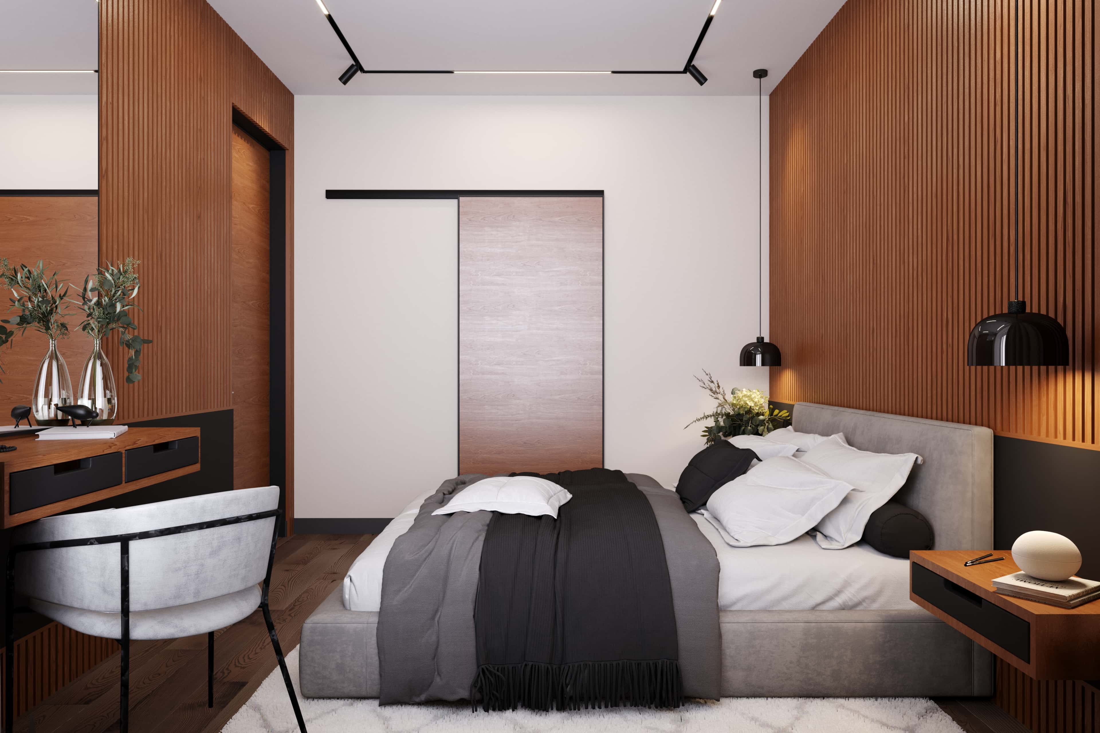 Современный интерьер в природных тонах с доминирующим серым цветом — актуальный тренд, позволяющий создать уютное жилое пространство. В базовой палитре решены и отделка, и мебель, и текстиль. А яркости обстановке добавили элементы в оттенках мха и терракоты: подушки, панно в спальне, фасады кухонной мебели.