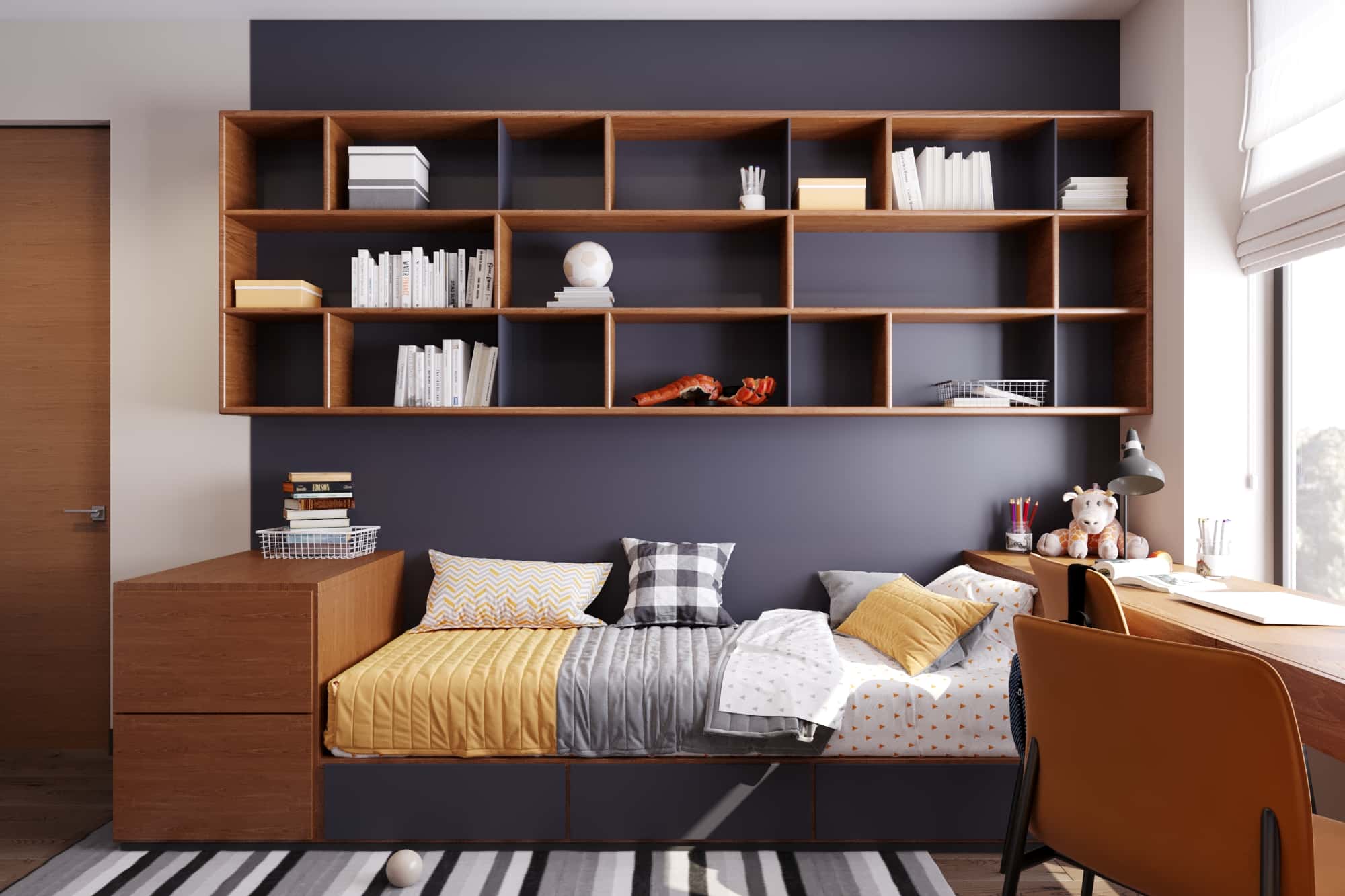 Оформленная в серых, бежевых и терракотовых тонах современная холостяцкая квартира в ЖК «Преображение» демонстрирует удивительную способность к трансформации, и подходит как для одного пользователя, так и для пары. В ней по желанию творческого хозяина предусмотрено несколько рабочих мест, а кабинет можно быстро переоборудовать в детскую.