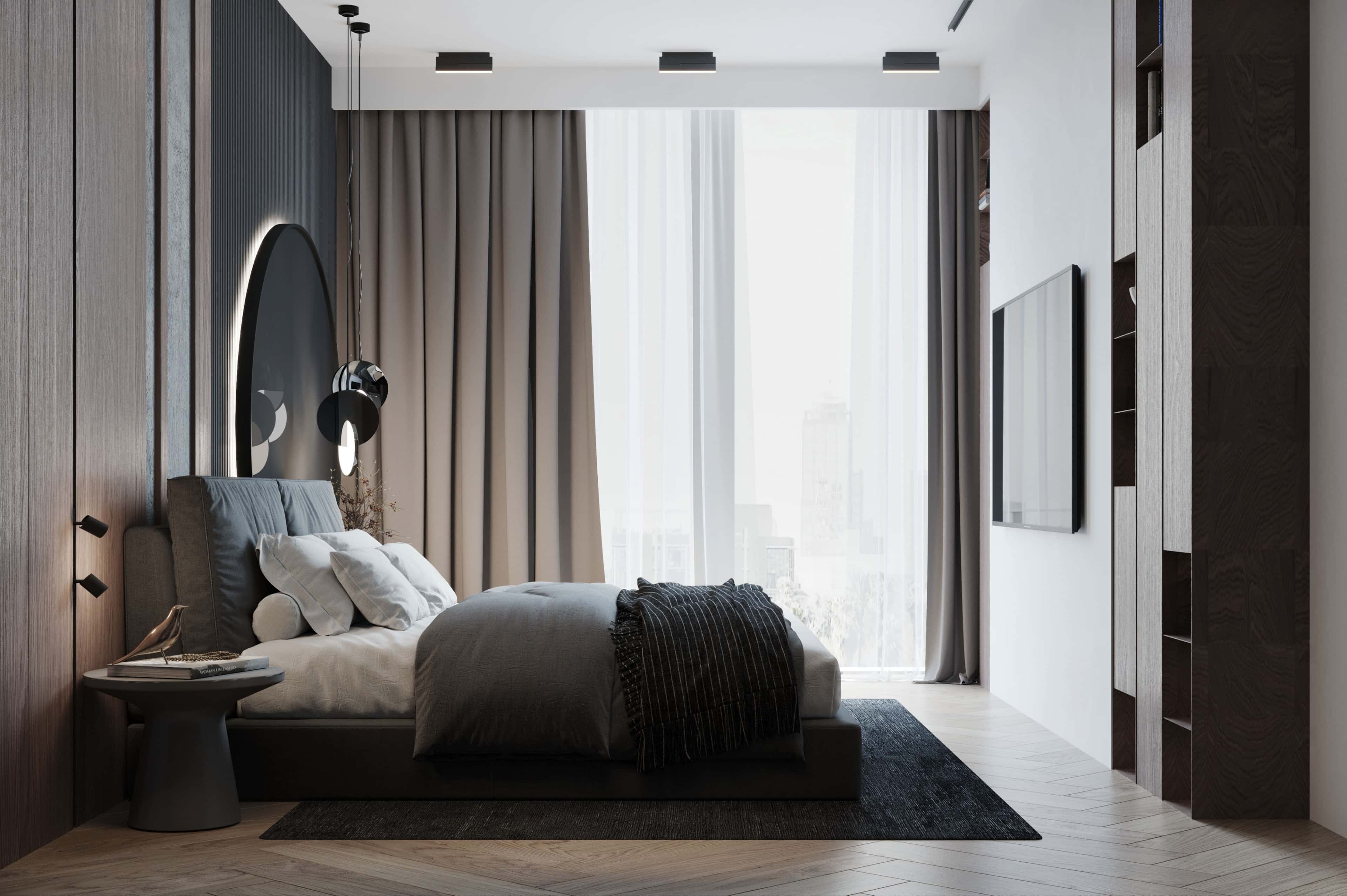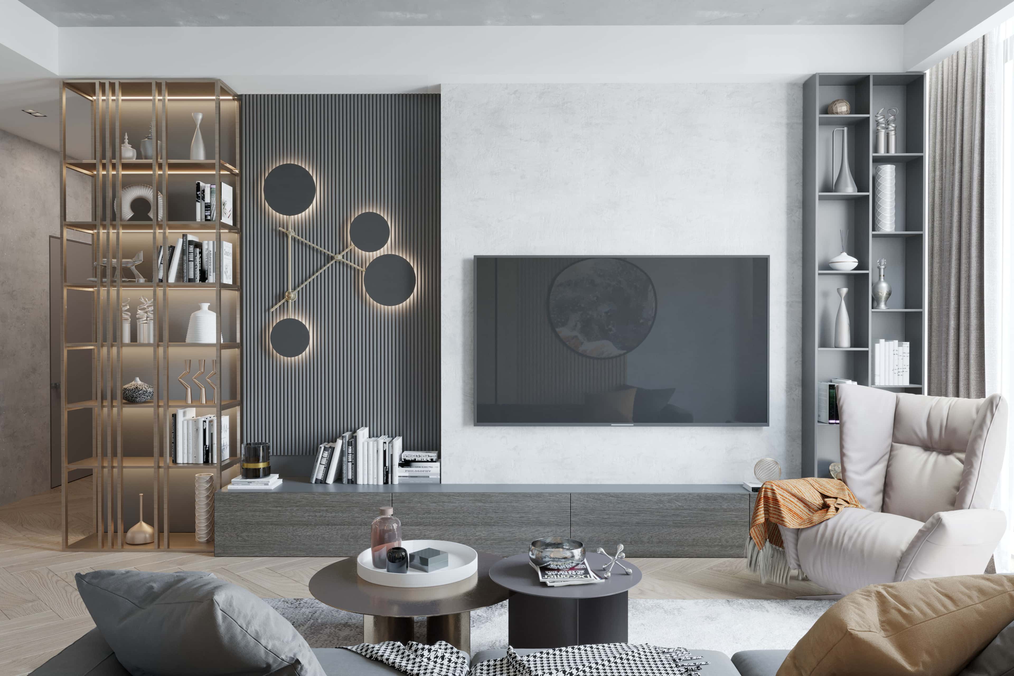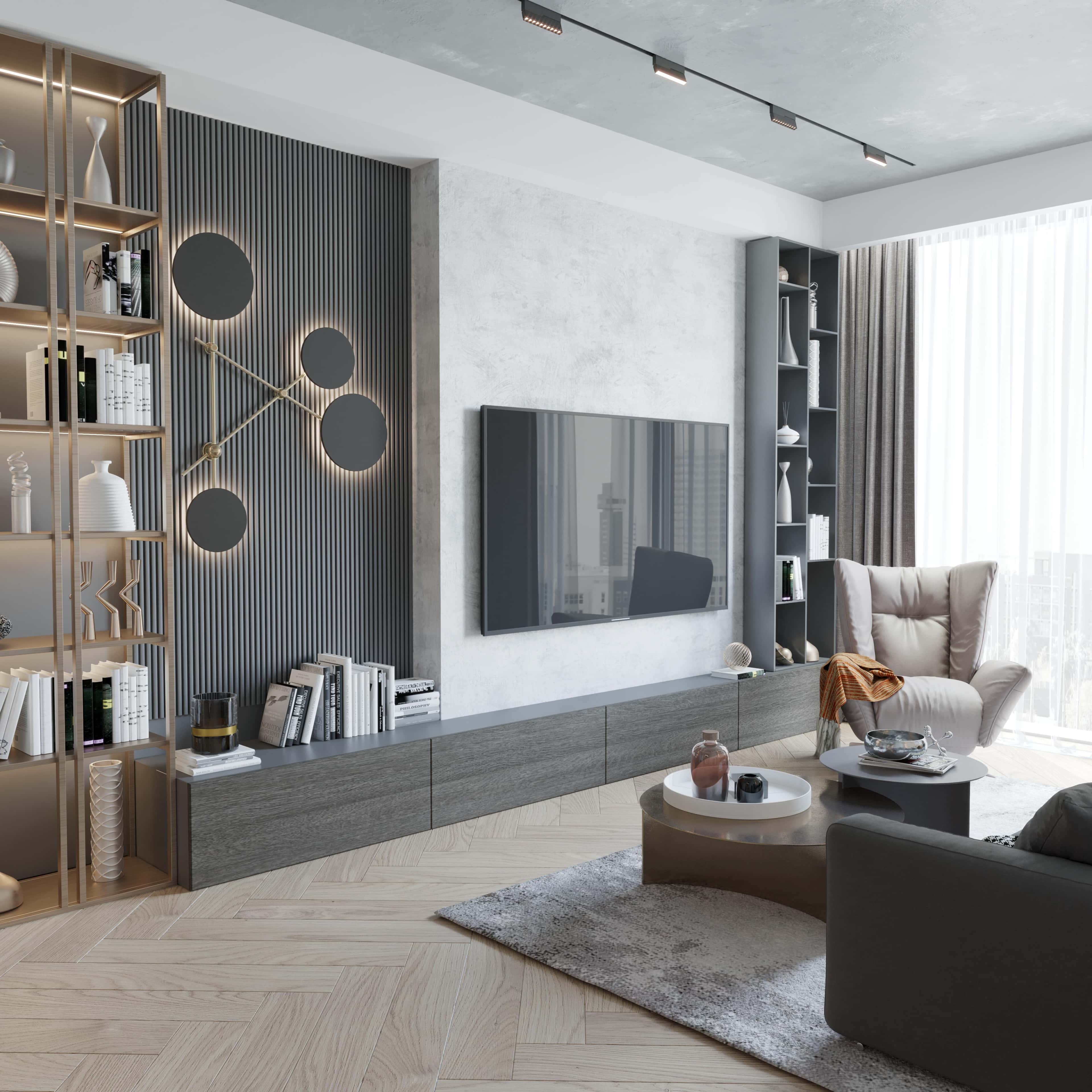 Палитра светлого дерева и серого камня — отличная идея для современной мужской квартиры с ультрамодной фактурной отделкой. Поддерживает брутальную концепцию игра геометрических фигур. Сочетание фрезерованных панелей с необычными круглыми панно выглядит футуристично, акцентируя внимание на зоне отдыха в гостиной и изголовье кровати в спальне.