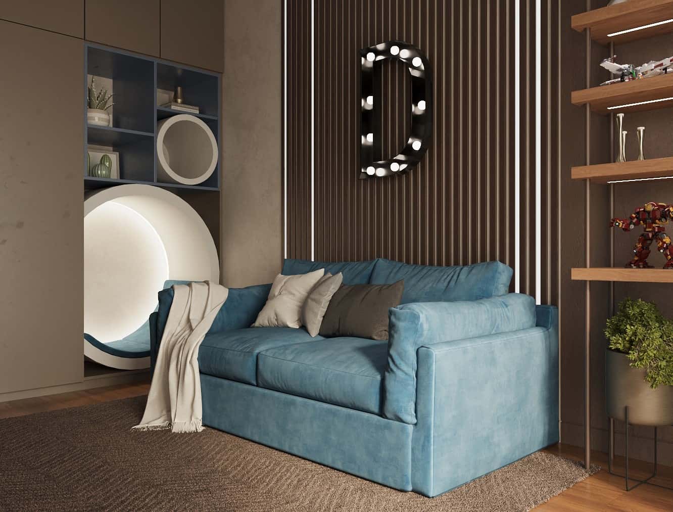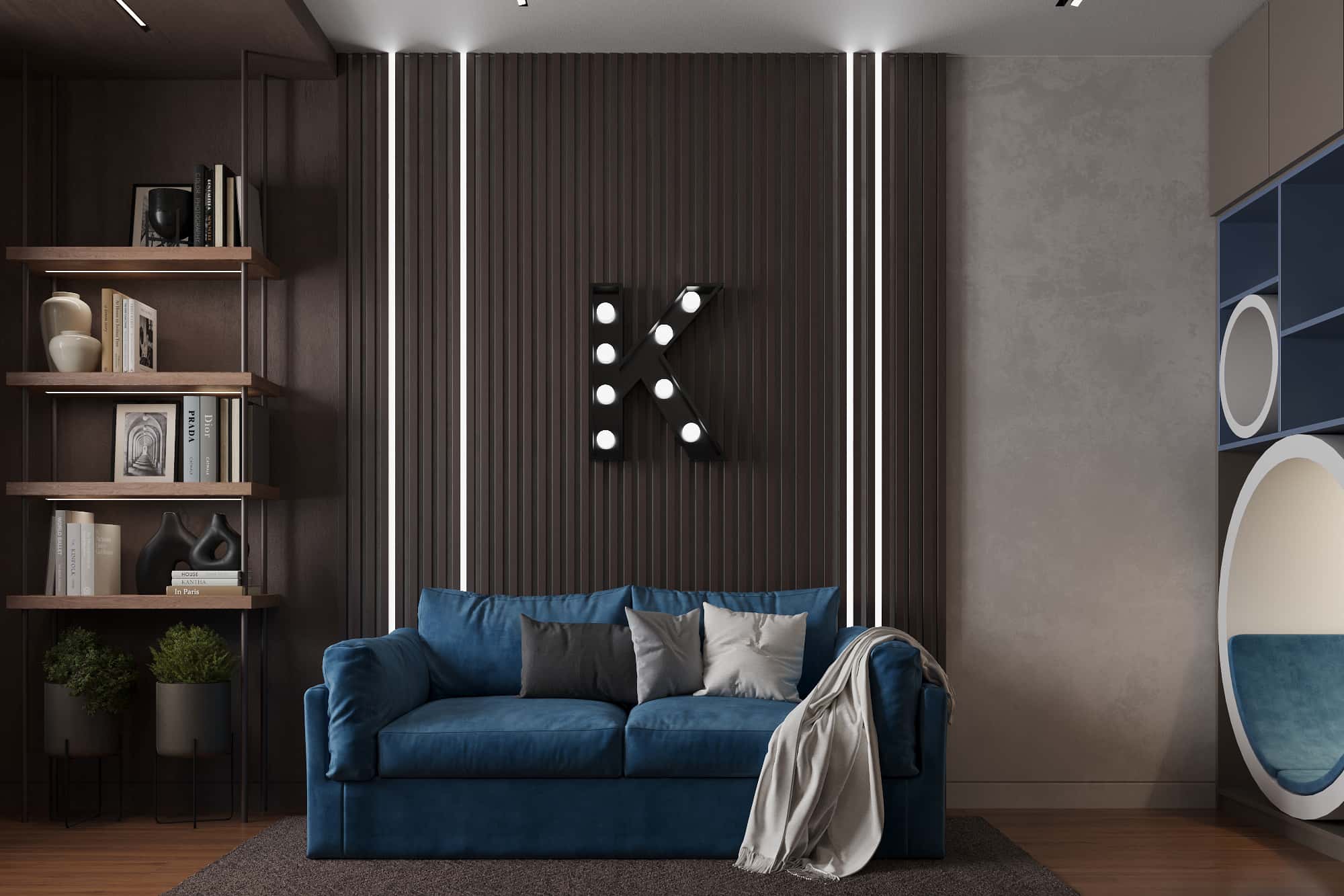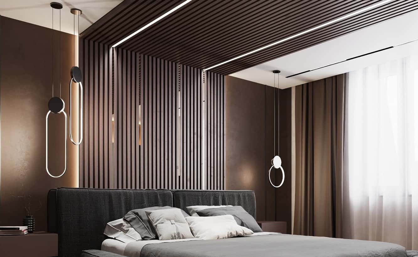 Палитра светлого дерева и серого камня — отличная идея для современной мужской квартиры с ультрамодной фактурной отделкой. Поддерживает брутальную концепцию игра геометрических фигур. Сочетание фрезерованных панелей с необычными круглыми панно выглядит футуристично, акцентируя внимание на зоне отдыха в гостиной и изголовье кровати в спальне.