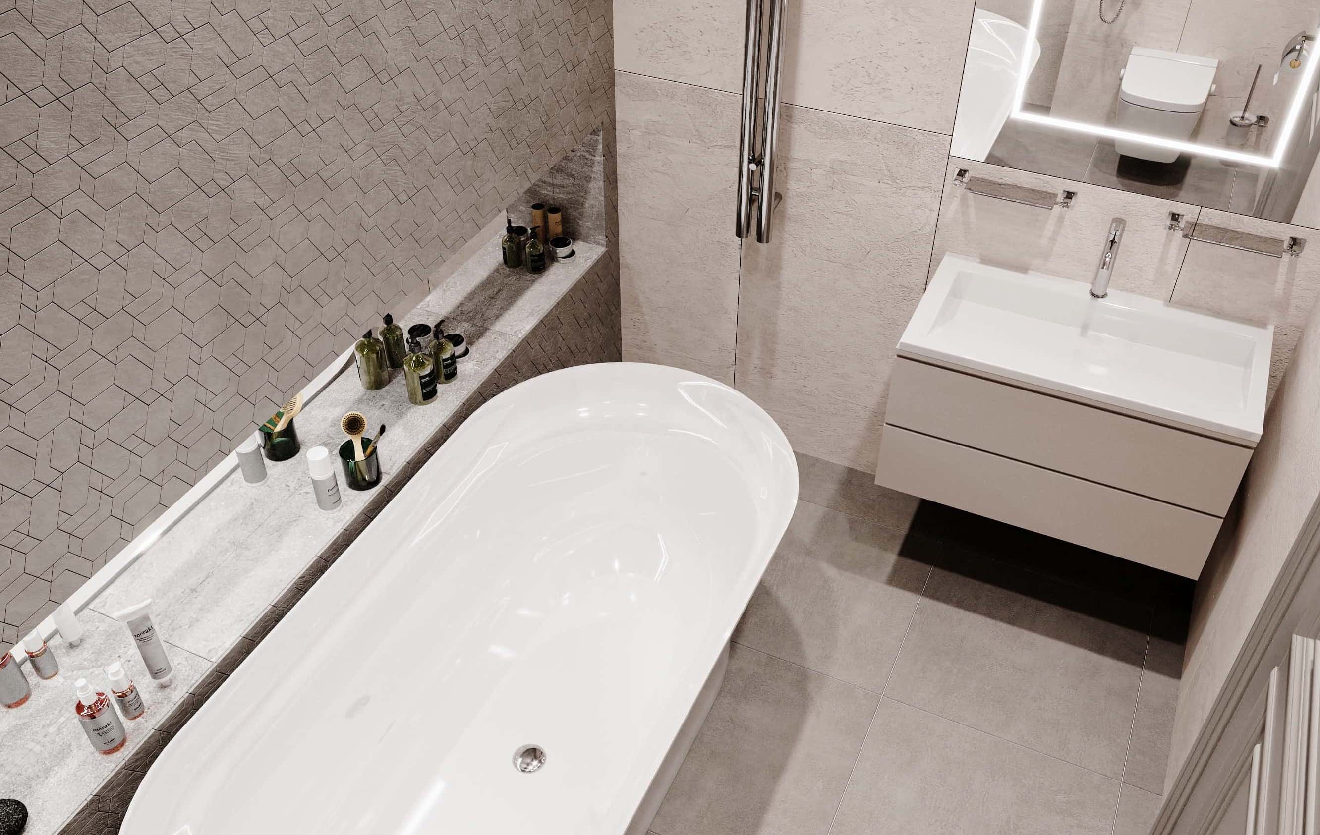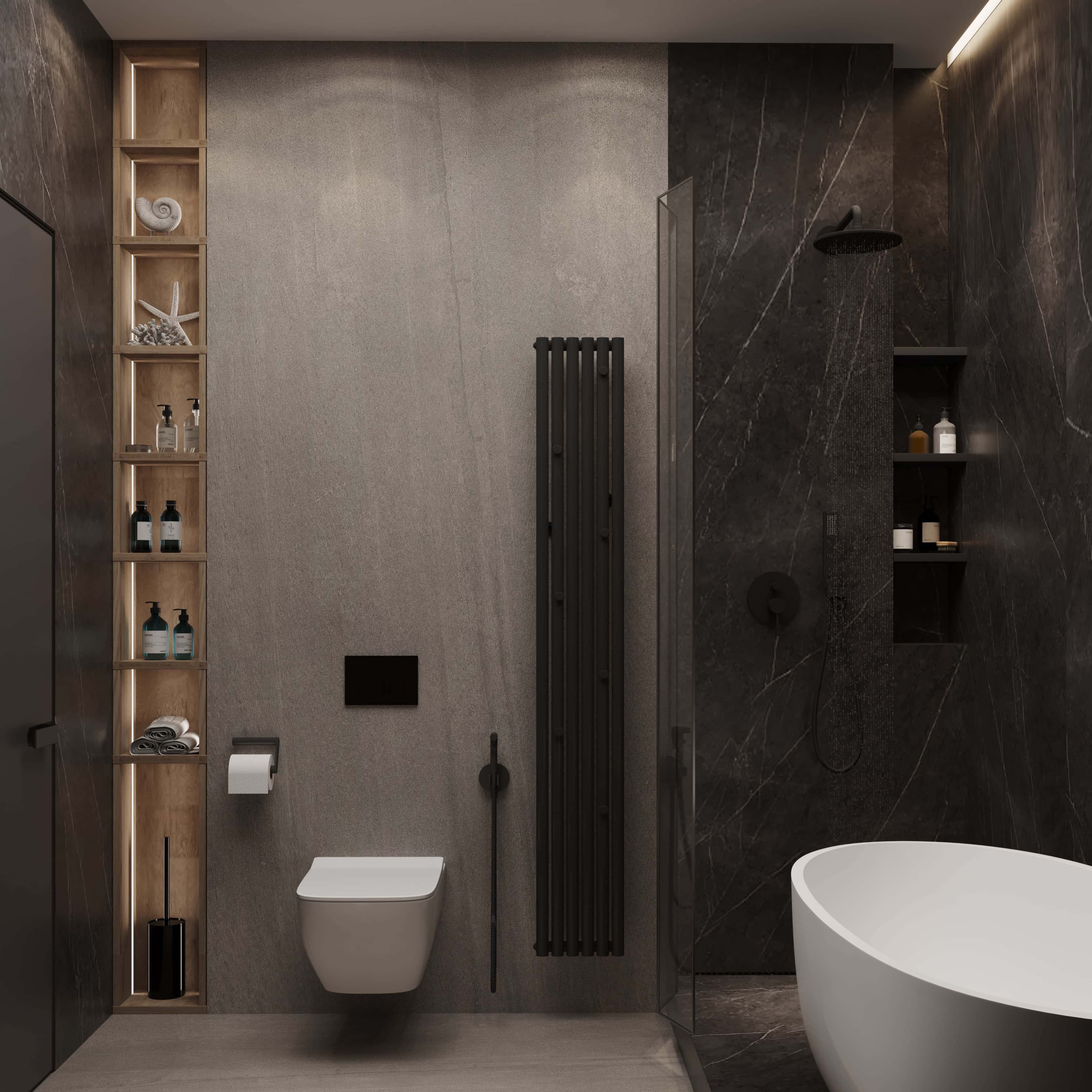 Как и в случае с кухонным фартуком, превращающимся в акцентную стену, в дизайне современного санузла в тренде отказ от керамической плитки в пользу крупноформатного керамогранита с фактурой натурального камня. Ультрамодная ванна-чаша как правило устанавливается на подиум, объединяющий ее с душевой кабиной. А отделка под камень распространяется на всю получившуюся нишу.