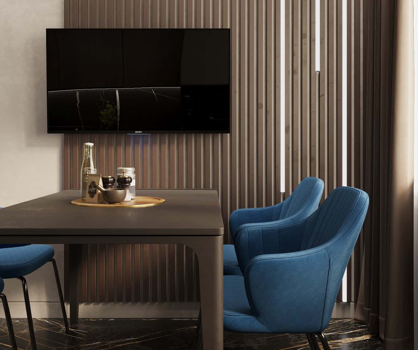 Благородная монохромная гамма темных кофейных и шоколадных тонов с акцентными деталями цвета морской волны создает обволакивающую атмосферу в интерьере. В отделке использованы природные текстуры дерева и камня, а также комбинированная отделка, подчеркивающая зонирование помещений. Чтобы добавить пространству глубины, авторы проекта интегрировали в обстановку LED-подсветку, спрятав ее за стеновыми реечными панелями.