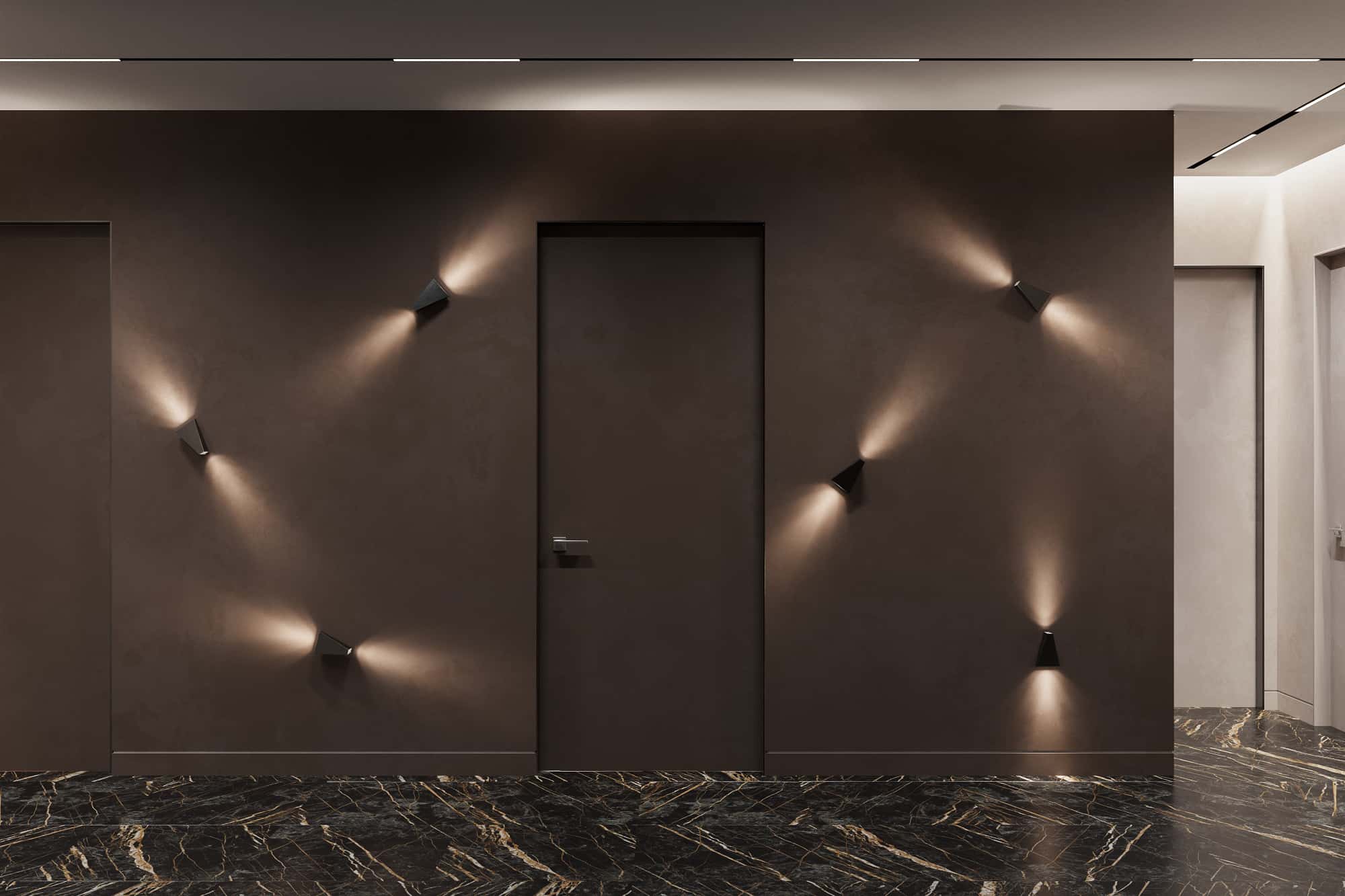 На смену некогда модным 3D-панелям из гипса с рельефом песчаных дюн сегодня пришли вот такие конструкции под камень. Встроенная футуристическая подсветка геометричной стеновой отделки будет прекрасно гармонировать с современными трековыми потолочными светильниками.