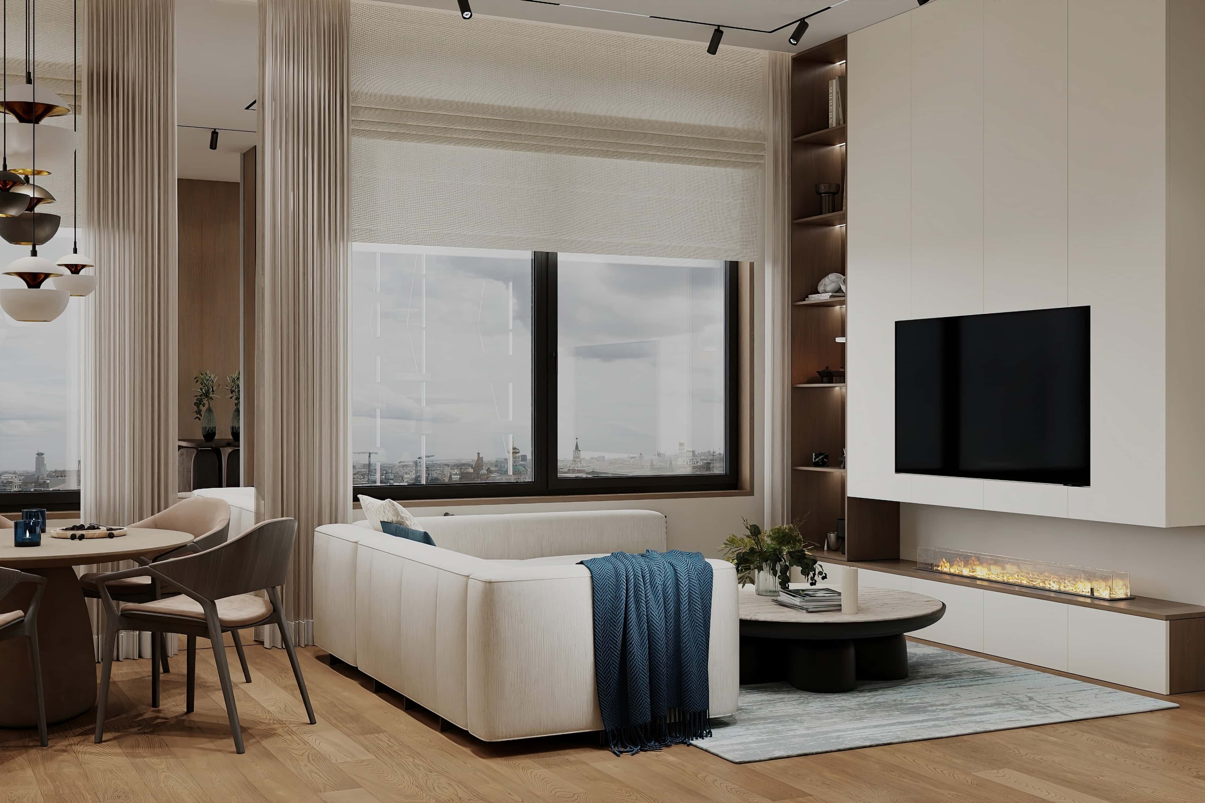 Проект квартиры площадью 91 м² в ЖК «Событие» представляет собой современный интерьер, сочетающий натуральные материалы с палитрой, вдохновленной морскими мотивами. В основу дизайна легли глубокие синие и бирюзовые акценты на нейтральном фоне, создающие атмосферу спокойствия, а планировка предусматривает плавные переходы между функциональными зонами кухни и гостиной.