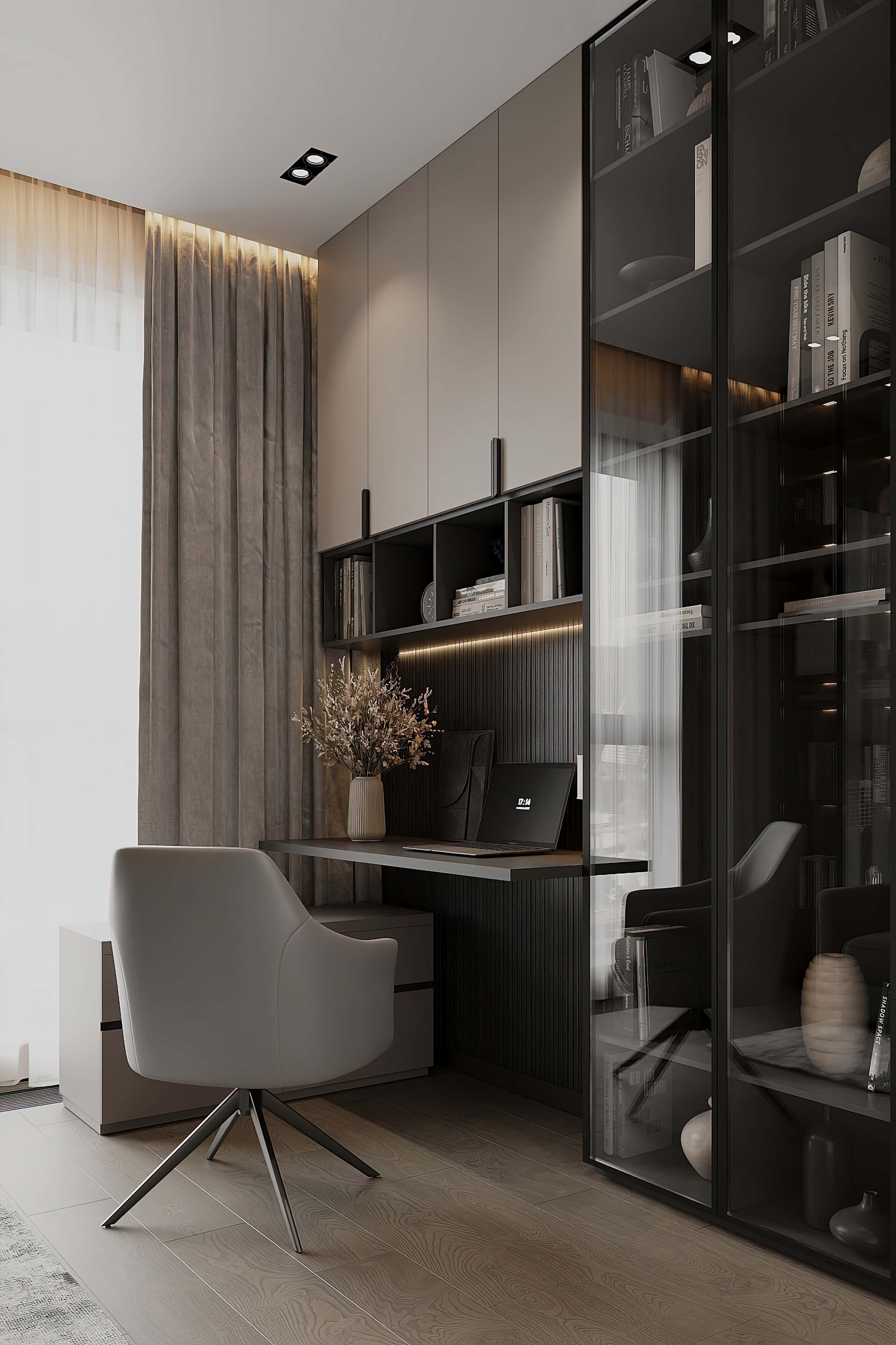 Светлая палитра, состоящая из природных оттенков, акценты оливкового цвета, тактильно приятный фактуры, тонированное стекло и сложный свет — так выглядит модный городской эко-интерьер. В такой обстановке всегда есть возможность реализовать локальную подсветку, обеспечивающую полноценное освещение разных функциональных сегментов. А близость к природе подчеркивают крупноформатные комнатные растения.