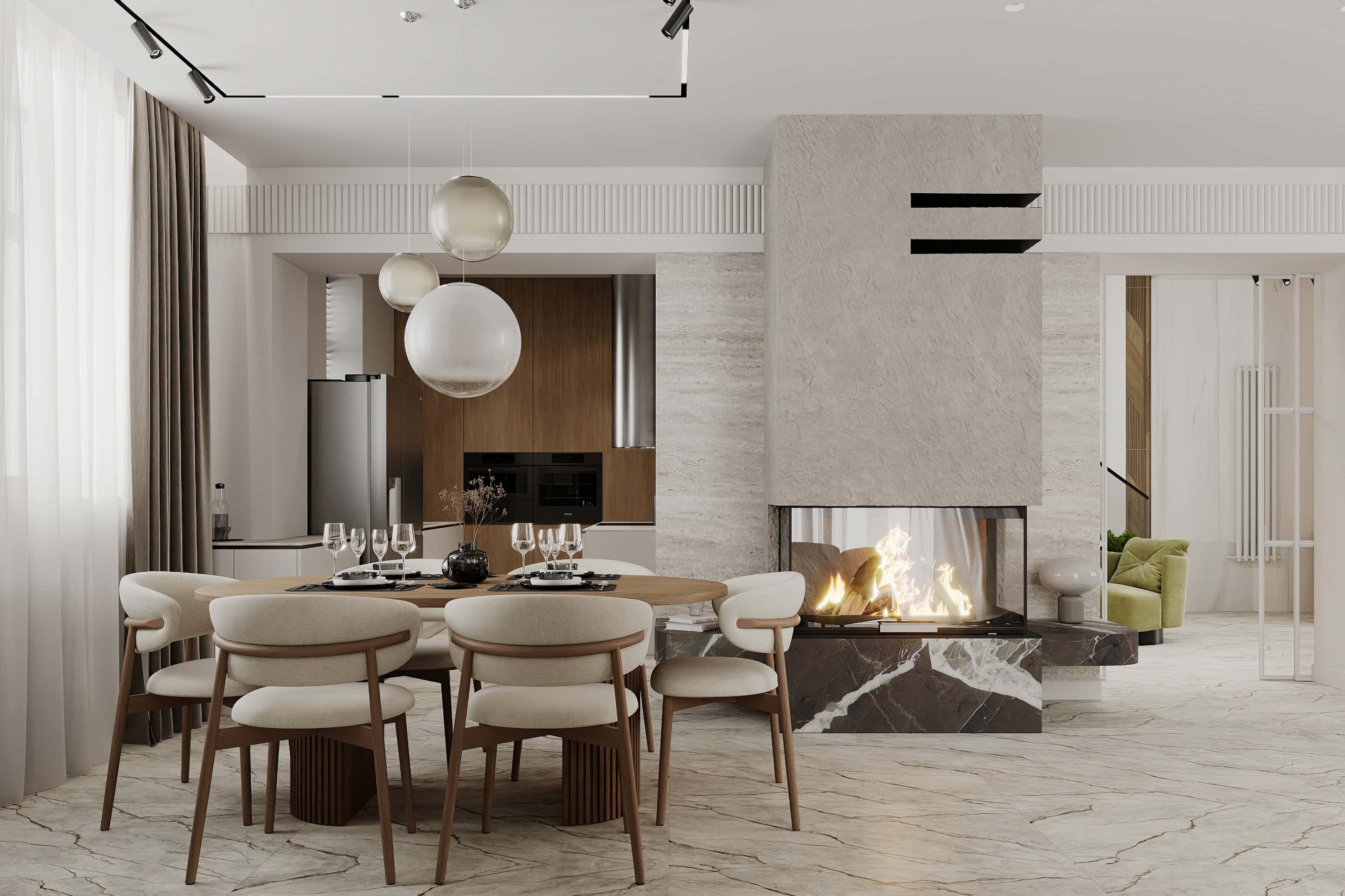 Дизайн дома было решено реализовать в контрастной цветовой гамме с использованием молочных и насыщенных коричневых оттенков. Благодаря этому интерьер получился динамичным и выразительным. Сочетание в отделке мрамора и натурального дерева отражает актуальную экоконцепцию. А, чтобы подчеркнуть премиальный характер обстановки, дизайнеры интегрировали в нее элементы в стиле арт-деко: зеркала, эксклюзивные каскадные светильники с подвесками из хрусталя и цветного стекла, мягкие панели с велюровой обивкой. Уюта же интерьеру добавляет биокамин, который установили в ТВ-зоне.