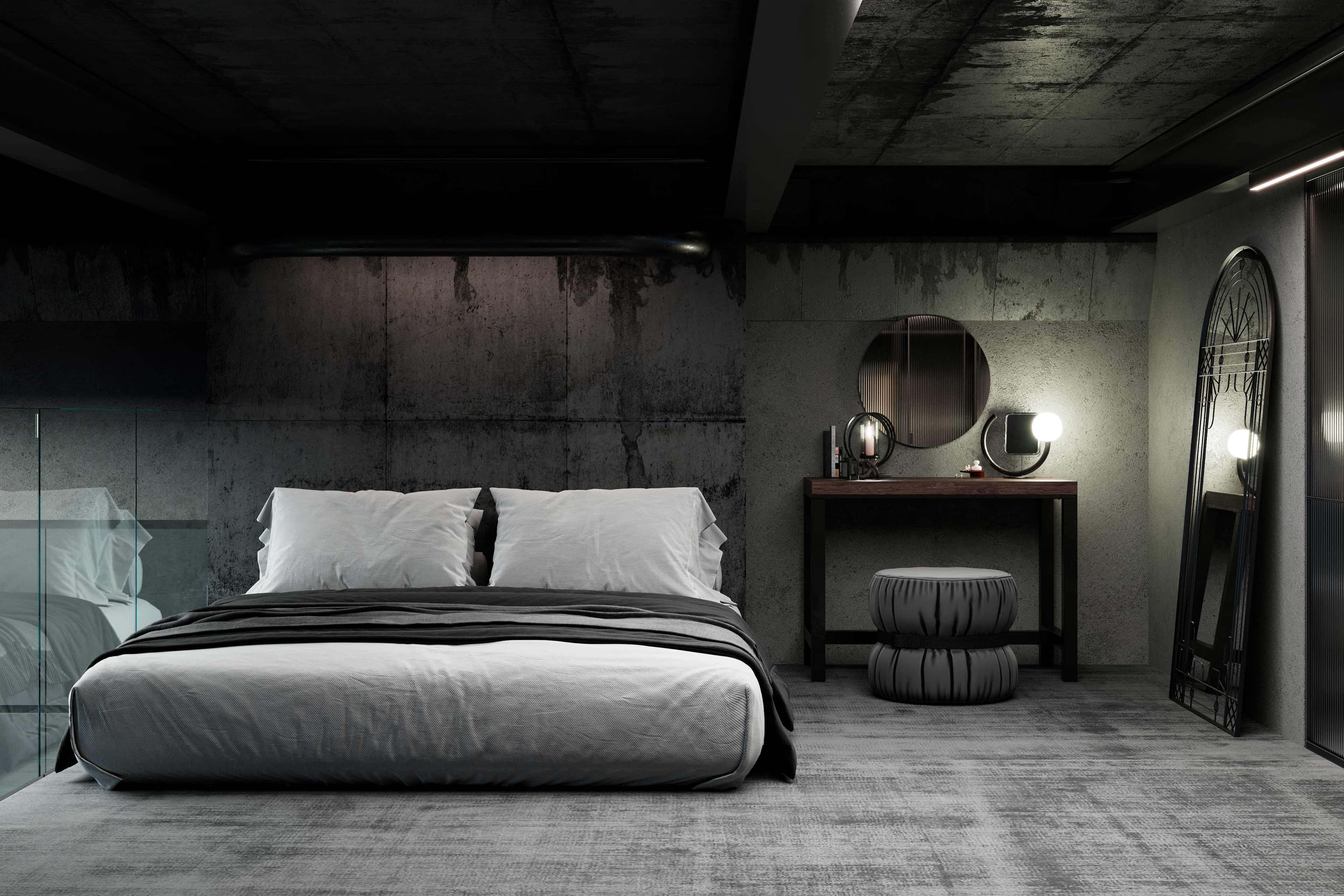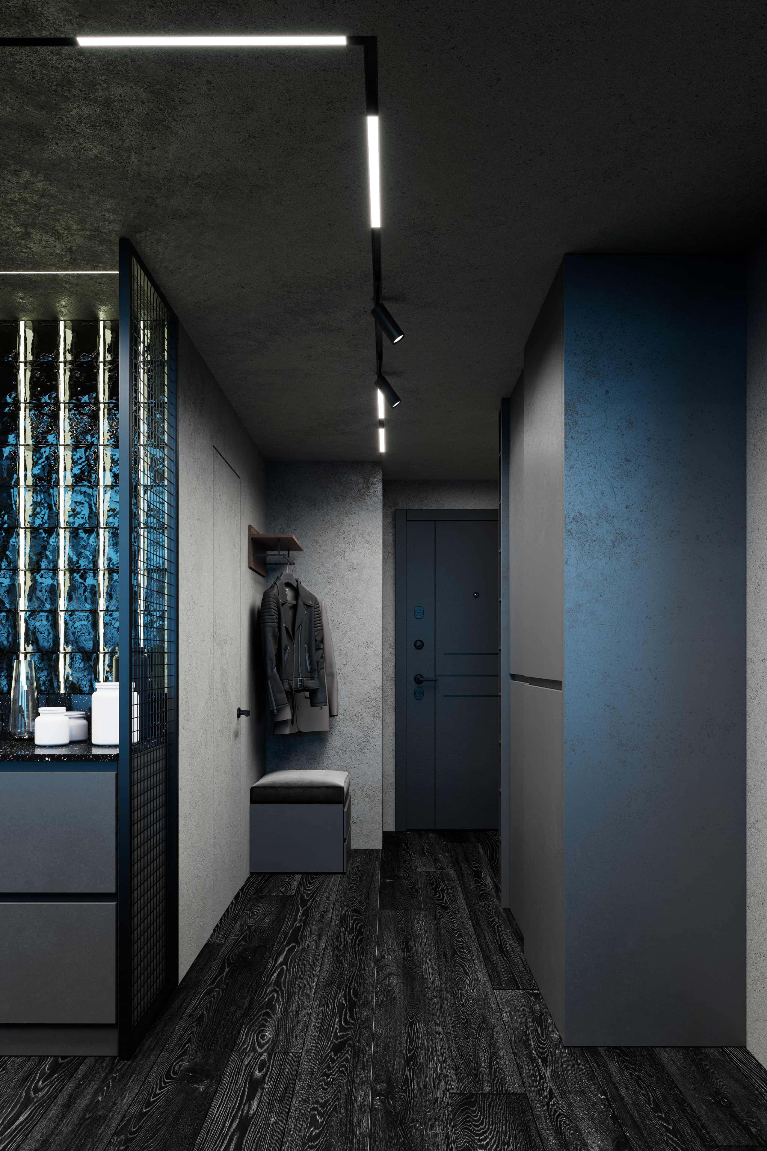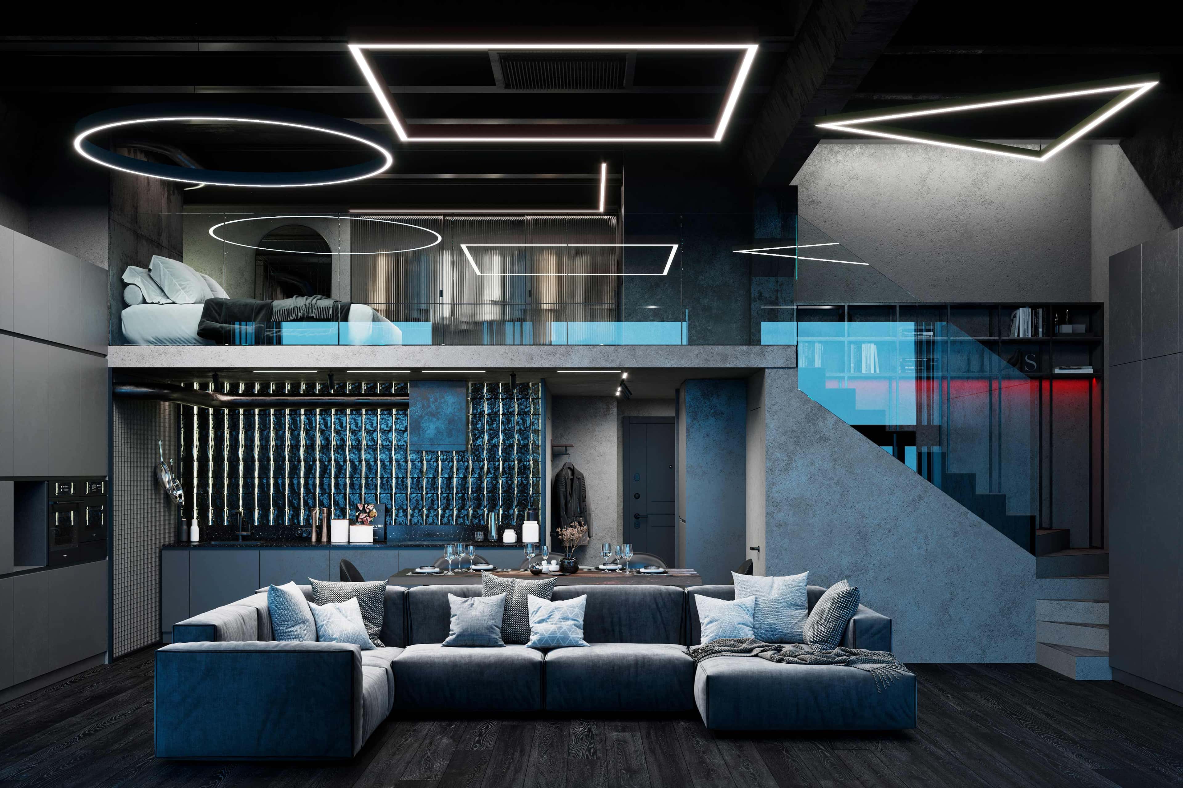 Реализованный в темных тонах лофтовый ремонт с элементами минимализма и футуризма — актуальный тренд, который поддерживают молодые успешные люди. Основу стильного монохромного пространства создают отделка и мебель в оттенках антрацит и графит. А футуристических ноток добавляют геометрические светодиодные светильники.