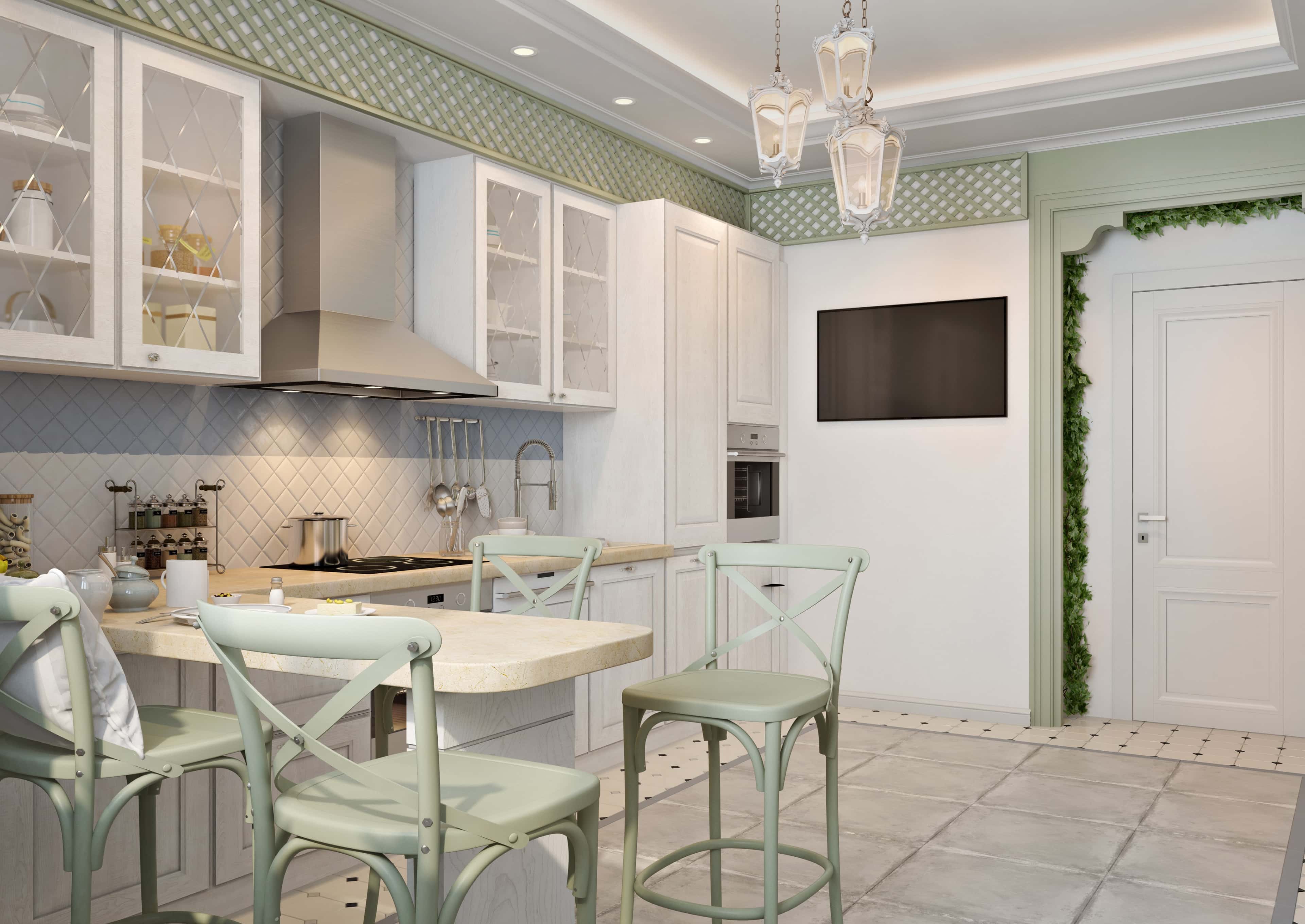 Прованский интерьер позволит Вам создать в квартире необыкновенно стильный и уютный уголок с французским сельским колоритом. Главным украшением спальни станет винтажная кровать с кованым декором и балдахином. Кухню украсят реечная имитация шпалеры и люстры-фонари, а столовая зона гостиной с фреской и плетеной мебелью погрузит в атмосферу усадебной беседки.