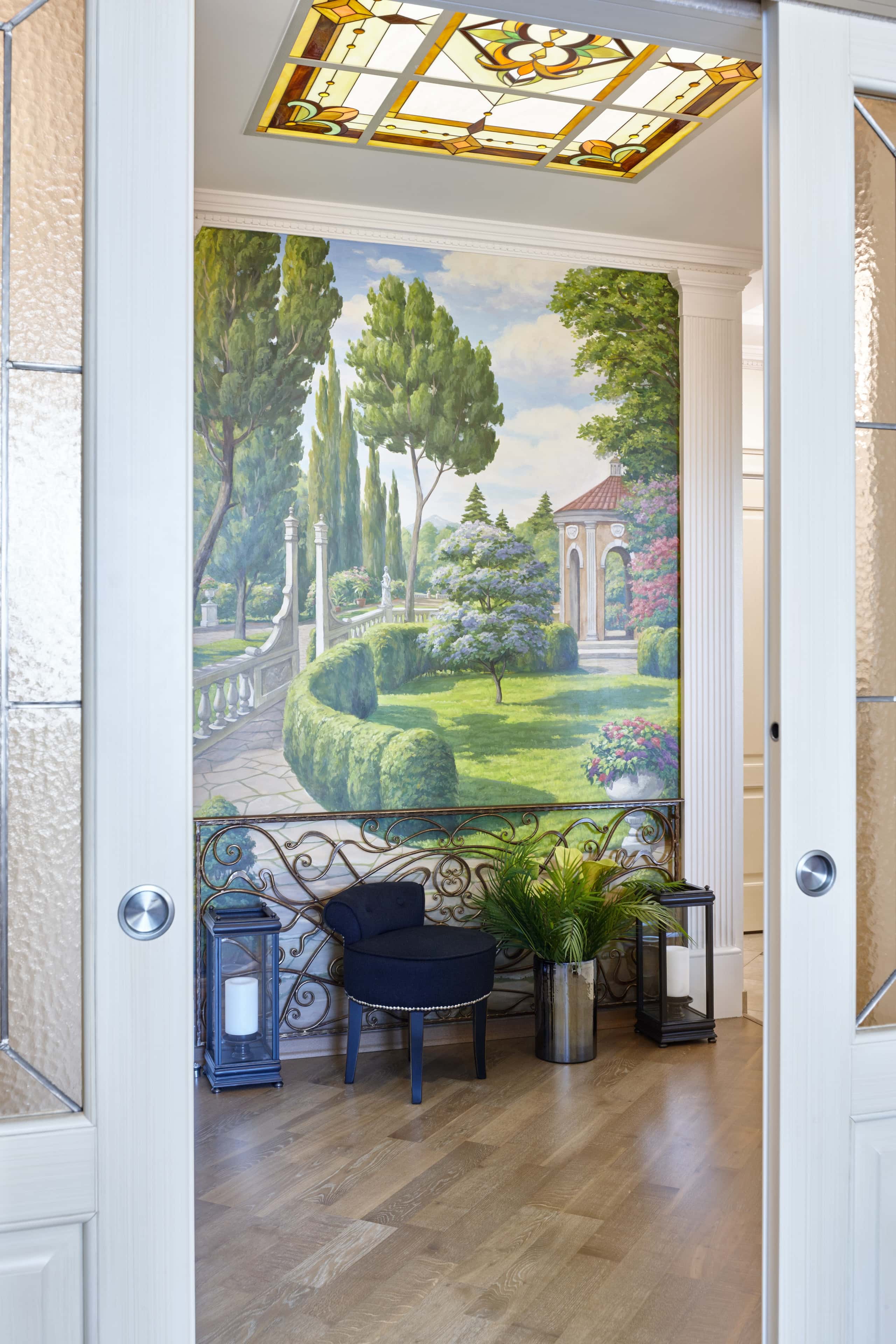 Авторские фрески и изящная ковка, цветочные вазы с пионами и фото в рамах, роскошные канделябры, часы и камин в мраморном портале — именно так мы представляем себе интерьер с классическим декором. Венчают же композицию кессонированные потолки, а также дизайнерские люстры и бра.