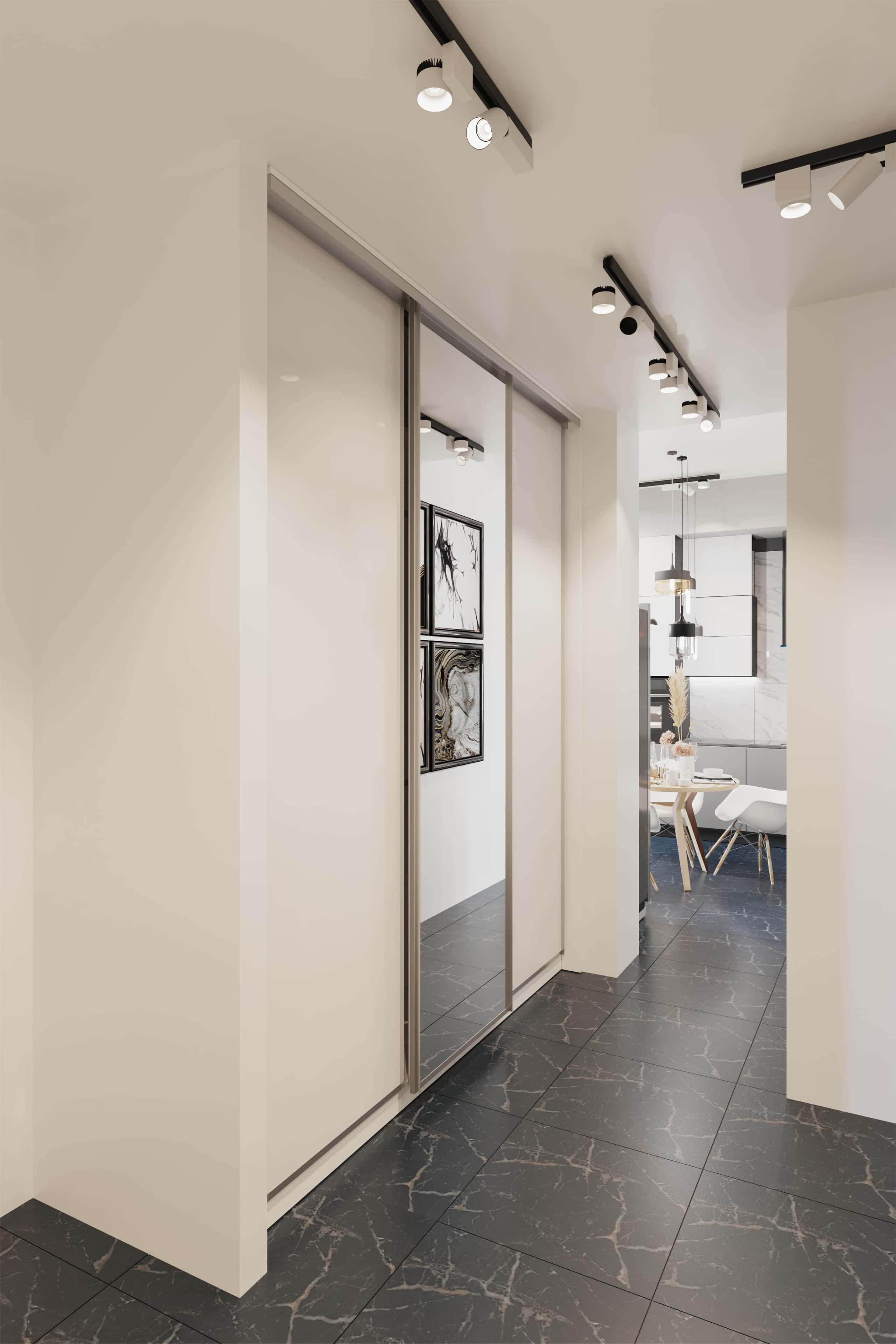 В холле с черным стеллажом для книг и шахматной фигурой разместилась система мультимедиа. Это пространство служит в некоем роде перекрестком, где сходятся основные функциональные зоны квартиры.