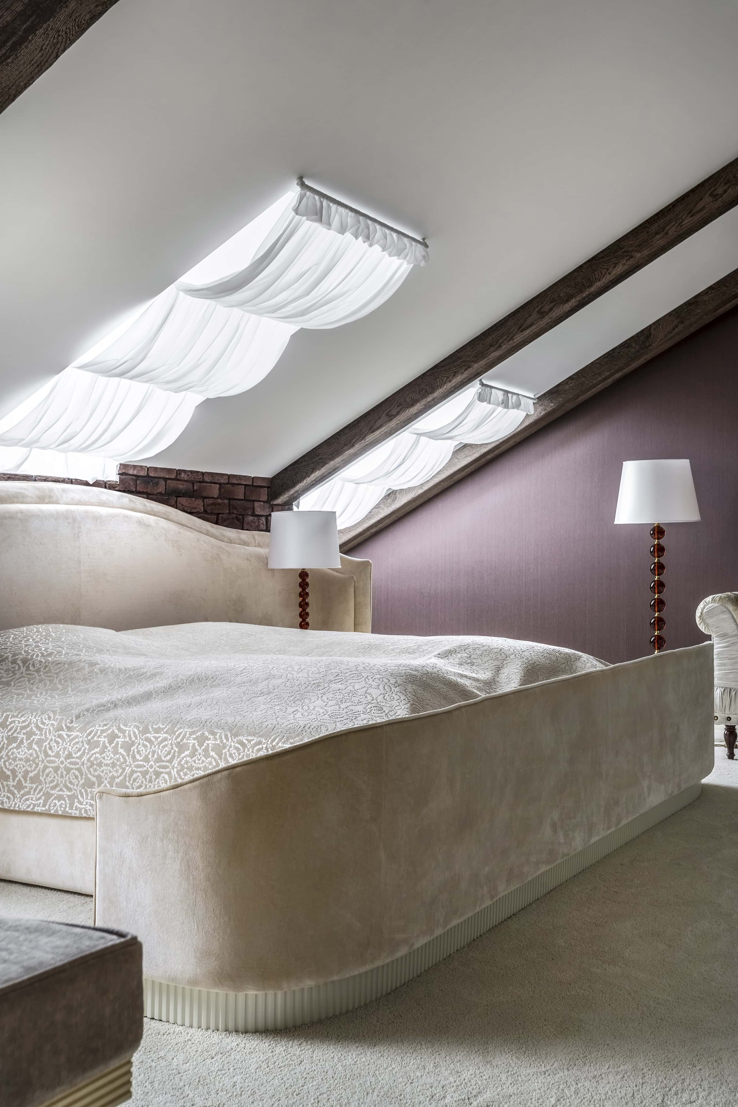 Спальня со СПА-зоной — настоящий природный оазис. В оформлении изголовья кровати встретились три направления: ар-деко, современный лофт и экостиль. За первое отвечают белые 3D-панели в форме ромбов, за второе — лампы на шнурах, а за третье — панели с имитацией фактуры дикого камня.