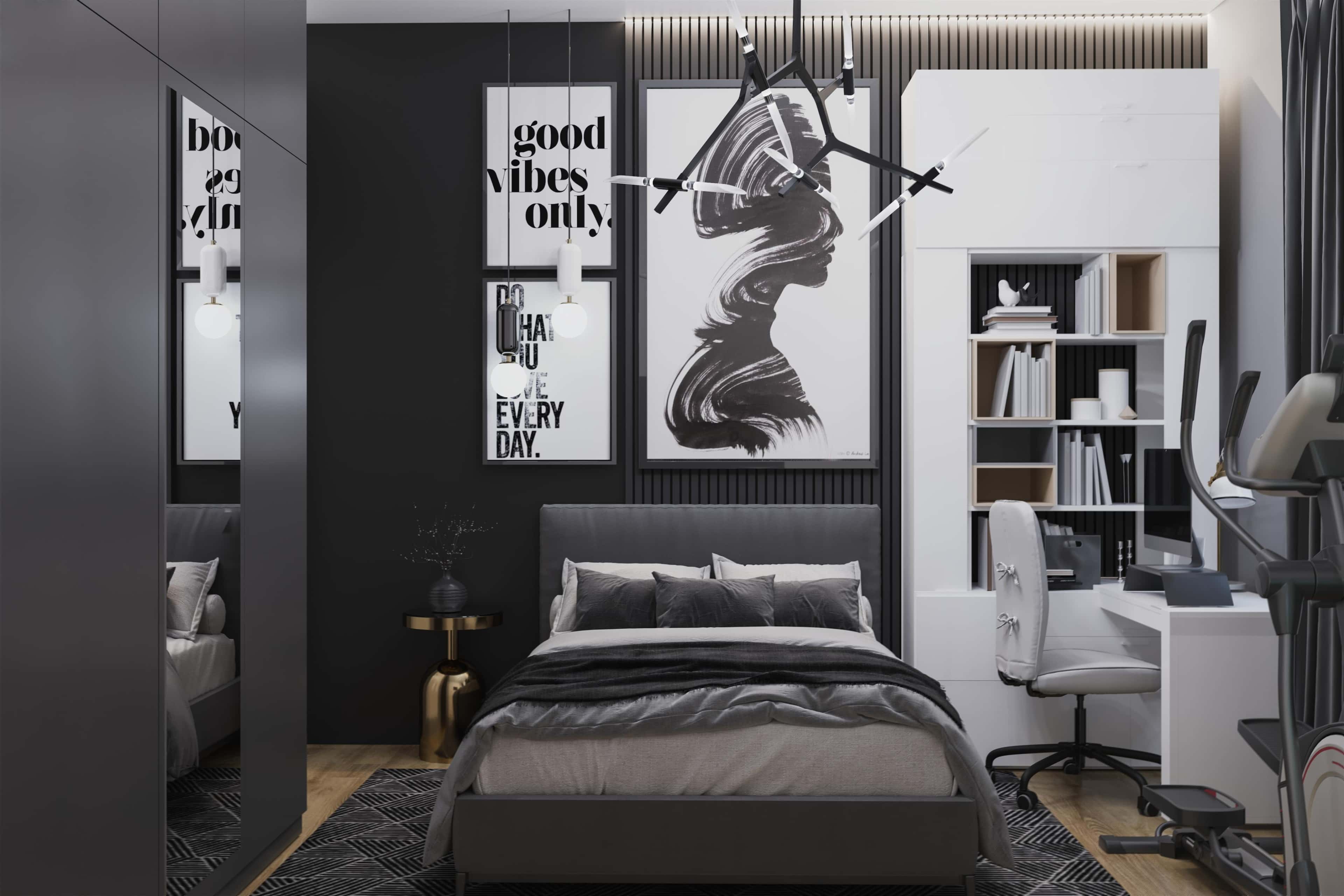 У спальни дочери много общего с современными арт-пространствами. Прежде всего, это графичные постеры, угольно-черные акценты и стильный монохром.