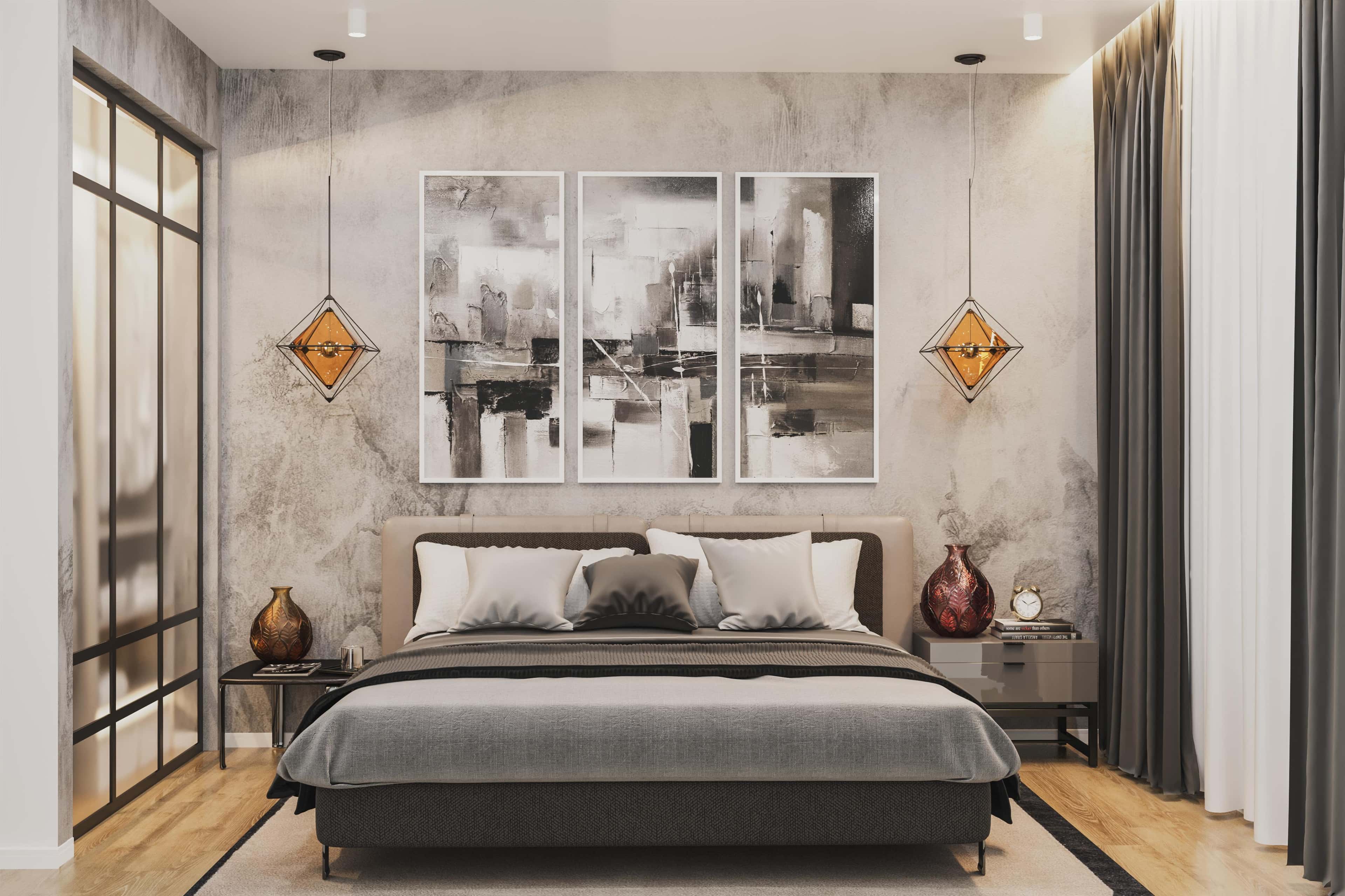 Настроение этой спальни с ее стеклянной перегородкой, светильниками в форме кристаллов, современными картинами и серыми оттенками созвучно атмосфере мегаполиса.