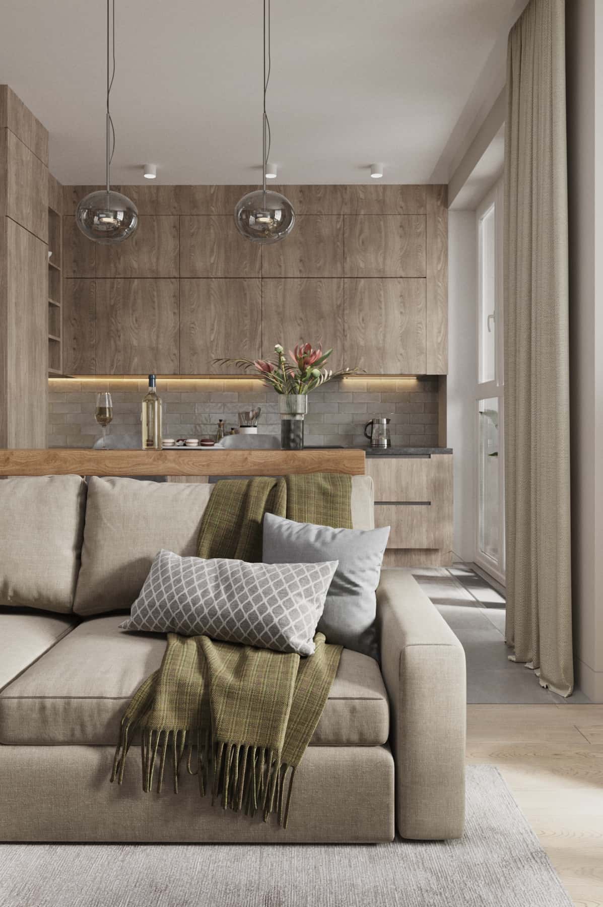 Оформление интерьера кухни-гостиной трехкомнатной квартиры в светло серый цвет в современном стиле. Фото № 62623.