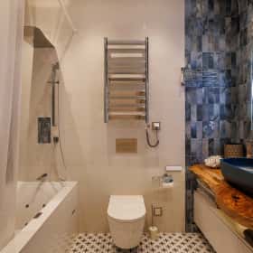 Для отделки стен и пола использовали те же материалы, что и в маленьком санузле
