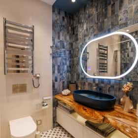 Узорчатая плитка на стене в ванной комнате где висит зеркало