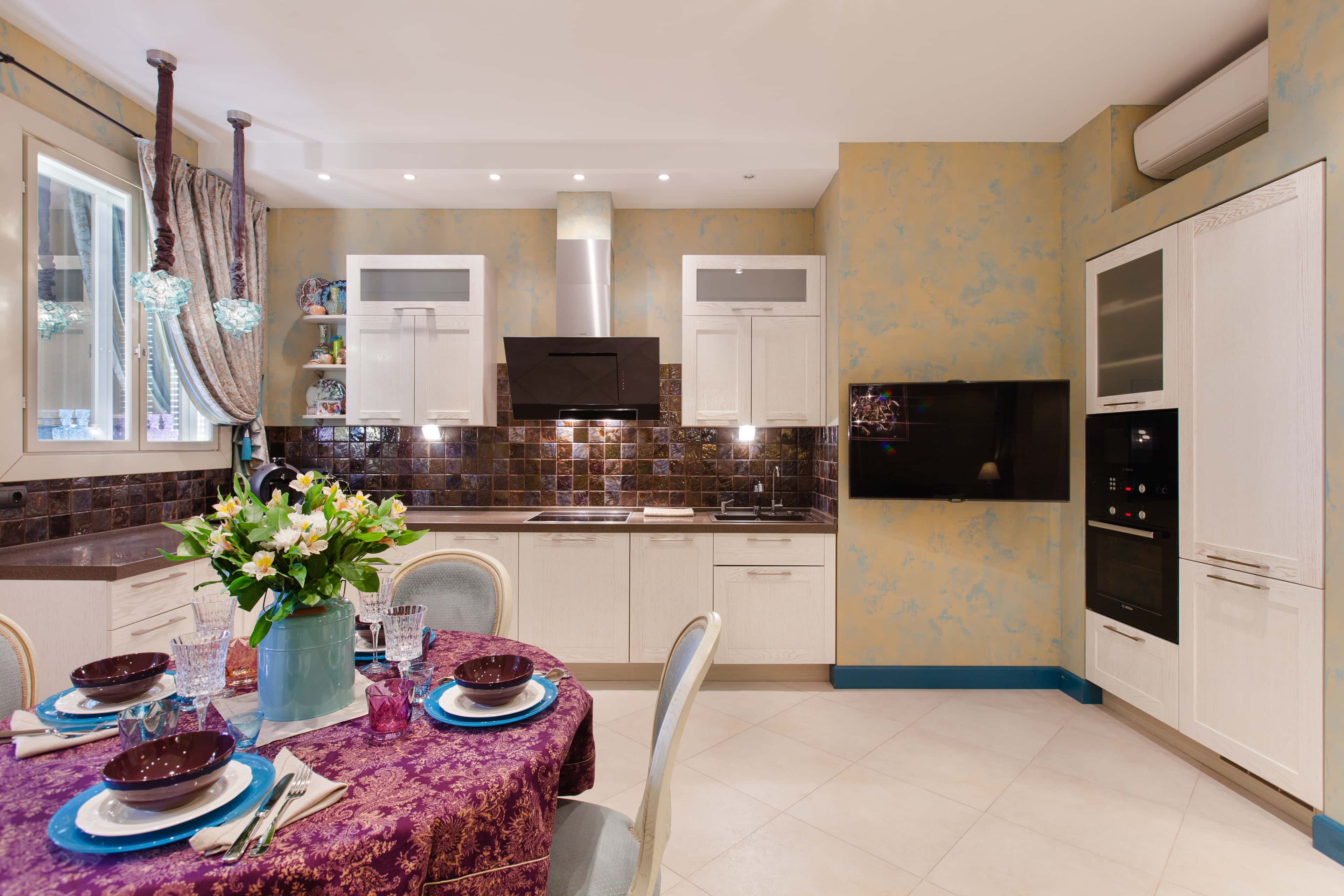 Ручной работой отмечено и кухонное пространство. Плитка на фартуке заглазурована в цвет, который перекликается со шторами у дивана. Она переливается разными оттенками и принимает на себя общий колорит интерьера. Выбранная стилистика позволяет поиграть мягкими тактильными фактурами отделочных поверхностей. Бархатистые стены, оттиски кружева на плитке, натуральные ткани. Благодаря скромным размерам помещений часть мебели в квартире выполнялась на заказ, под индивидуальный размер. Миниатюрные придиванные столики дополнены ковкой, которая драгоценными акцентами рассыпана по всем помещениям. Карнизы и кронштейны, подстолья и бра очень точно выполнены кузнецами по эскизам дизайнера.