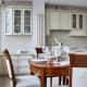 Кухонный гарнитур выполнен в классическом стиле — он выглядит роскошно, элегантно и в то же время очень нежно. Часть кухни спрятана за укороченной несущей стеной — мебель идеально вписалась в архитектуру комнаты с её балками и нетипичными углами. На полу бежевая керамическая плитка, придающая интерьеру особый аристократизм. Деревянный кофейный столик с изящным узором и мебель в обеденной зоне — лаконичные цветовые акценты, делающие композицию завершенной. Благодаря такому подбору цветов и материалов гостиная выглядит одновременно торжественно и уютно.
