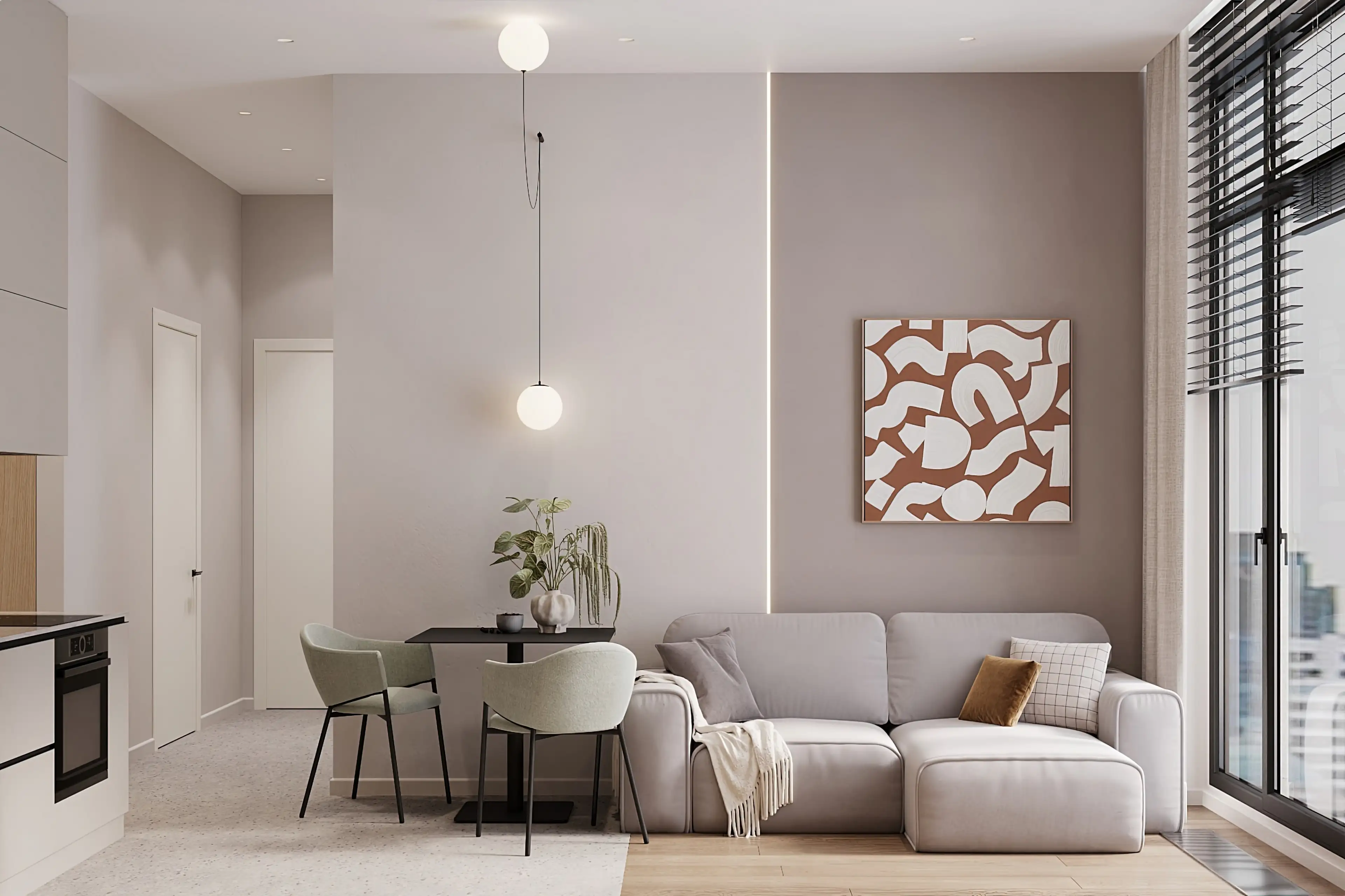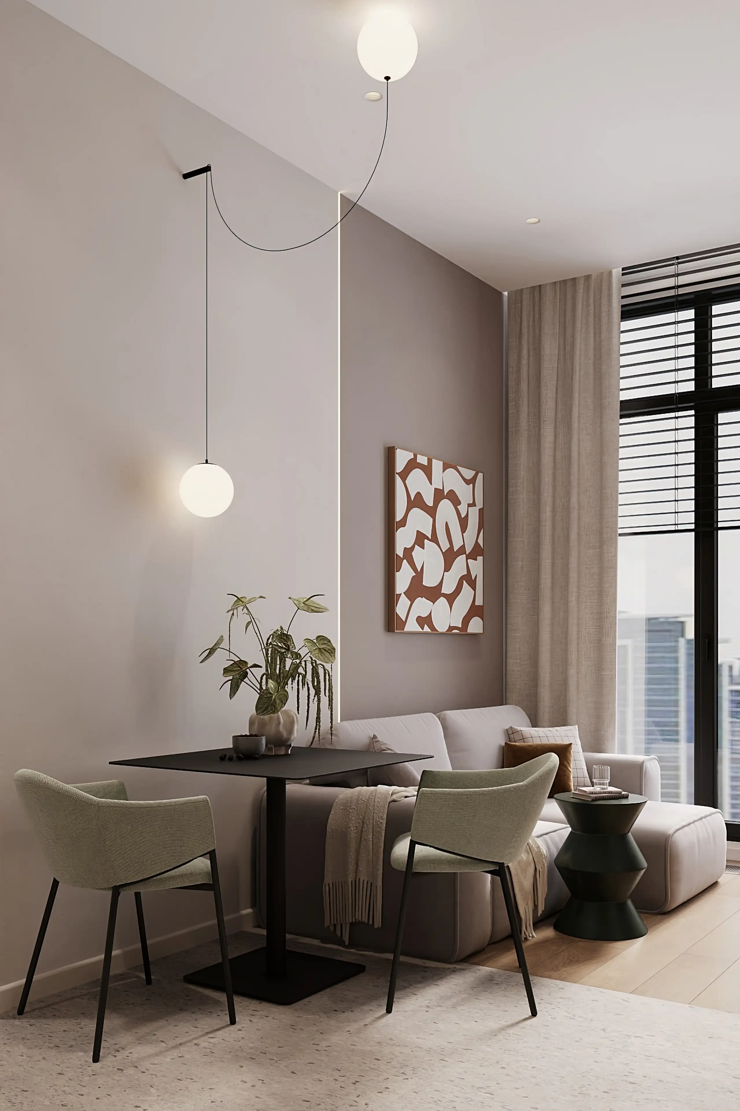 Для обеденной зоны мы выбрали компактный стол и изящные стулья светлого серо-зелёного цвета — получилось уютное место для семейных ужинов и дружеских посиделок. Освещение тщательно продумано: помимо основного верхнего света, мы добавили подвесные светильники-шарики, которые дают мягкий рассеянный свет.
