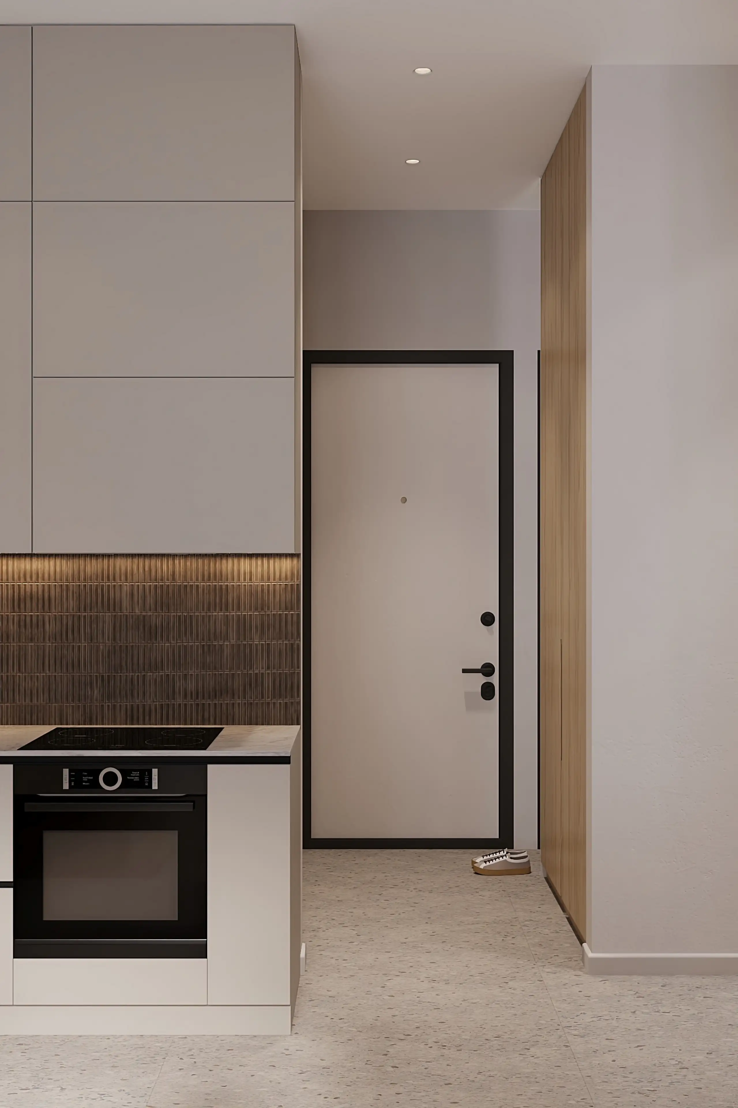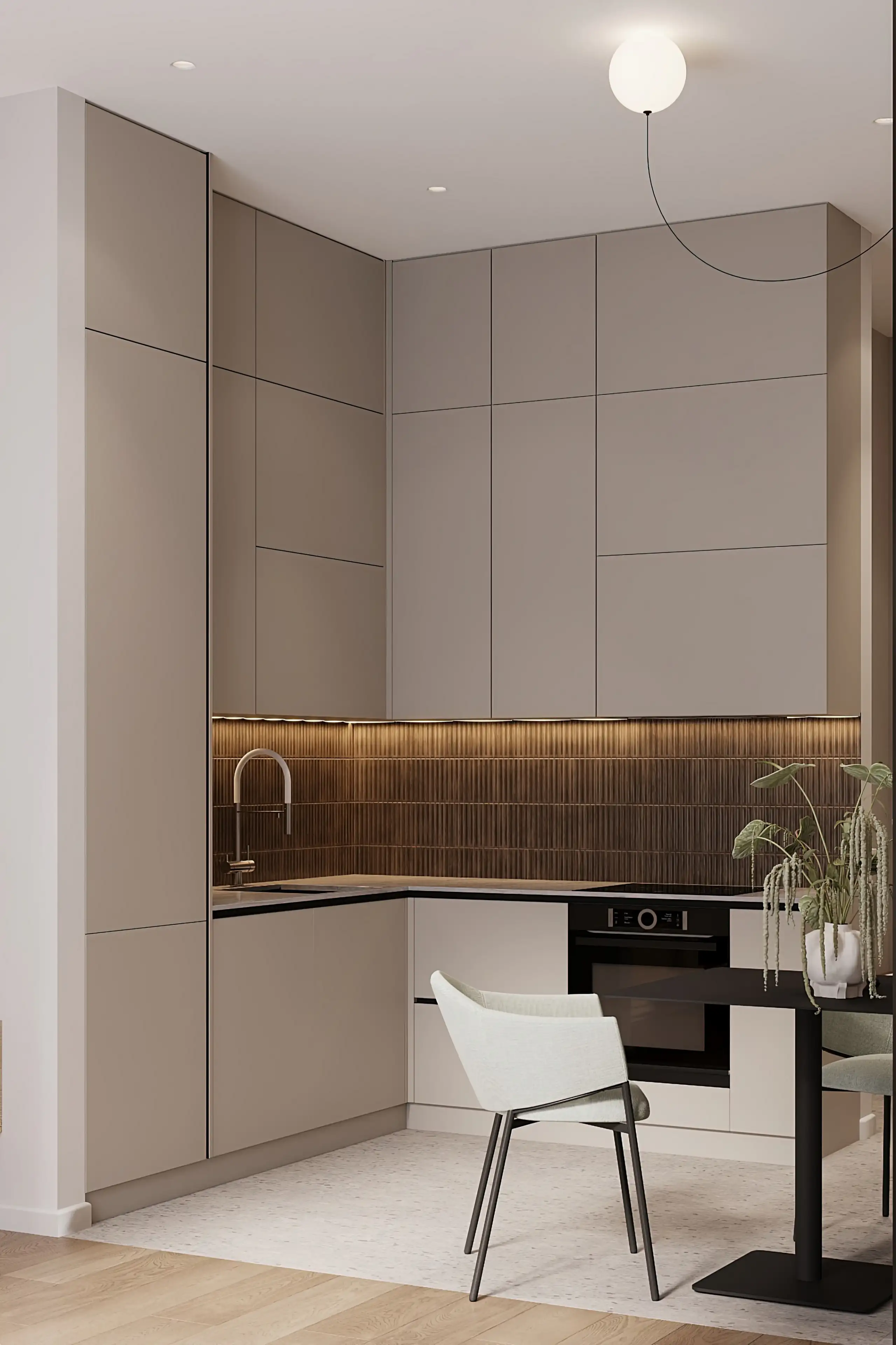 Кухня собрана в духе разумного минимализма. Высокие шкафы в спокойном тёмно-бежевом цвете тянутся до самого потолка, что визуально вытягивает пространство. Фактурный фартук кофейного оттенка добавляет стене глубину и выгодно оттеняет монохромную гамму, внося нотку уюта.